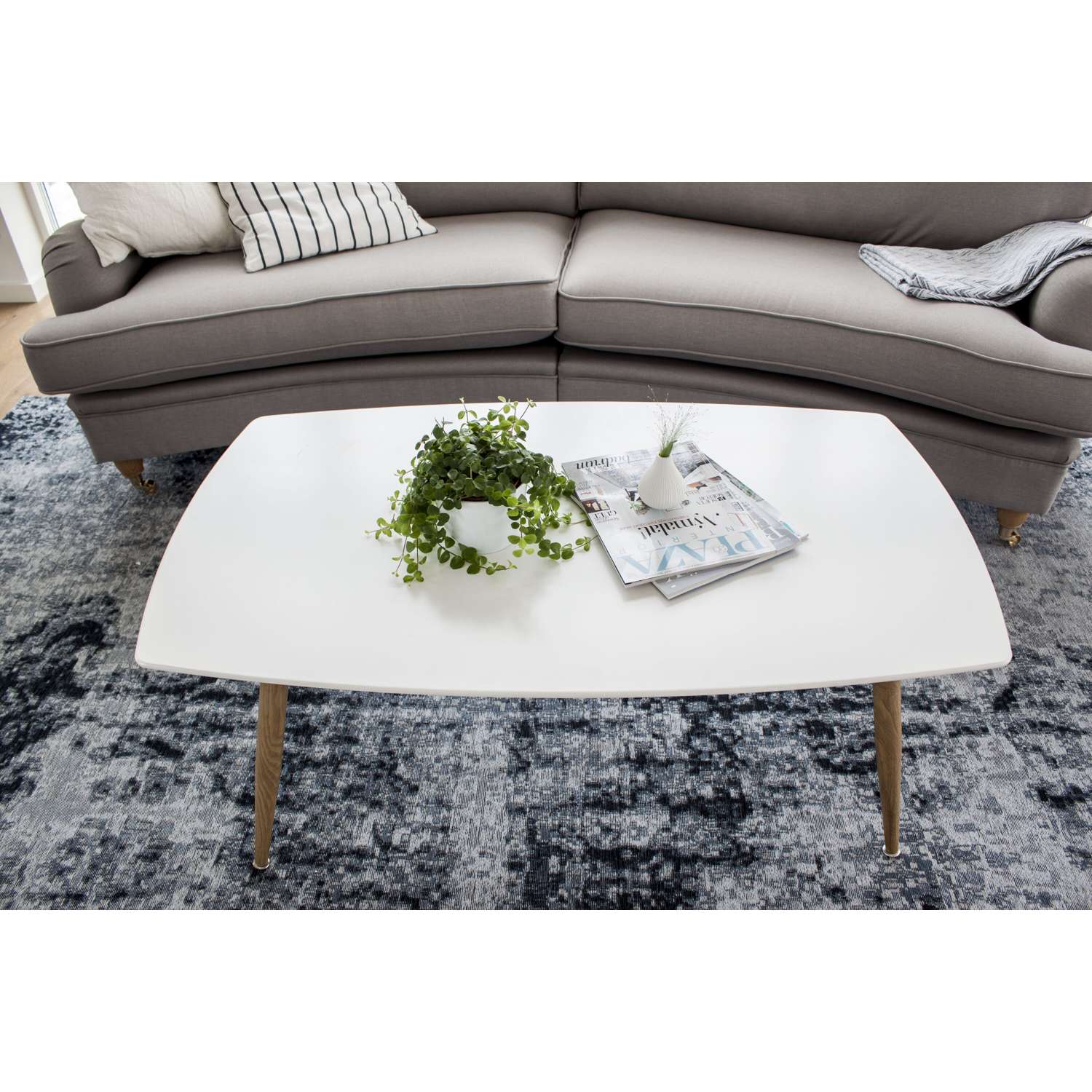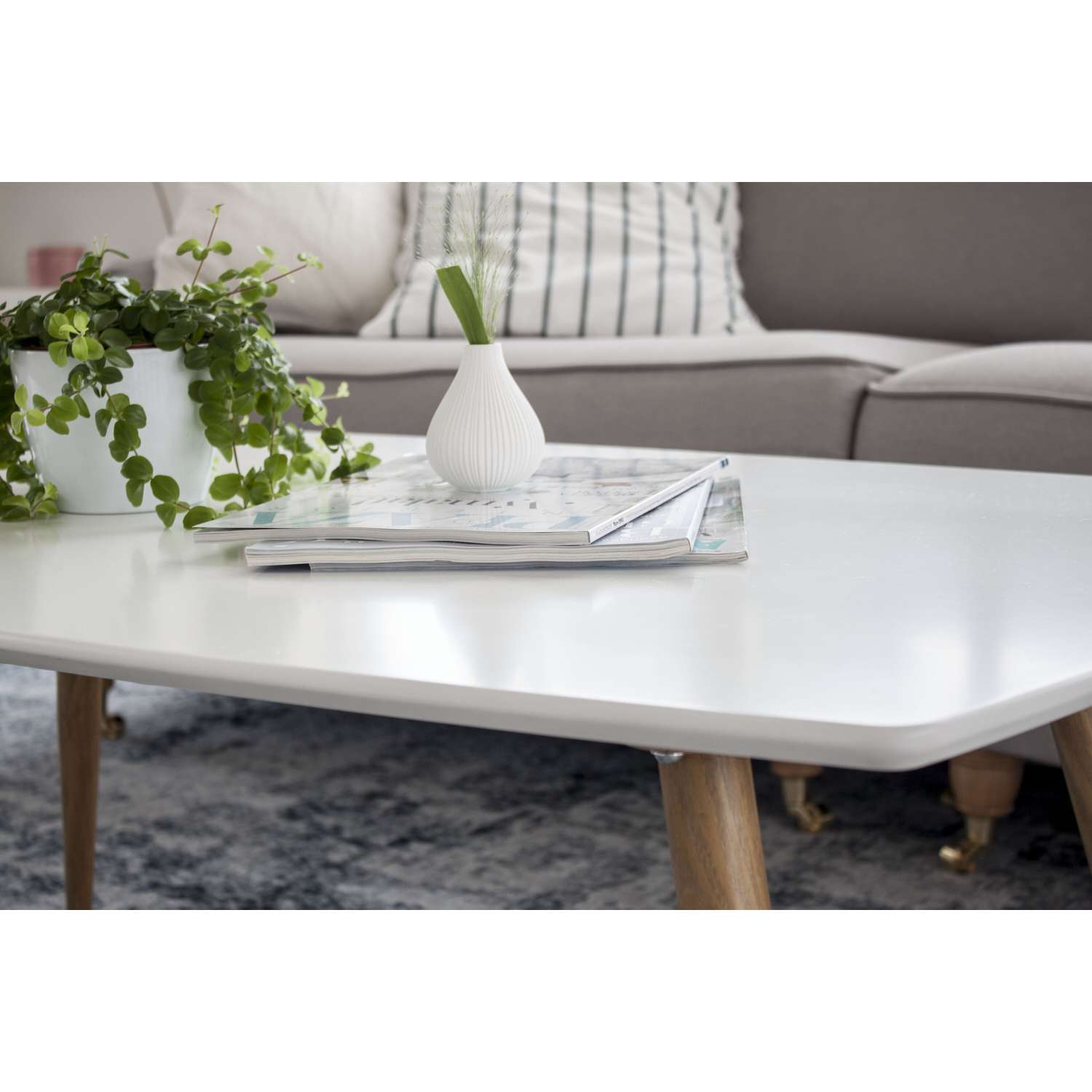 - De houtkleurige poten geven een klassieke indruk en passen mooi bij het witte tafelblad.