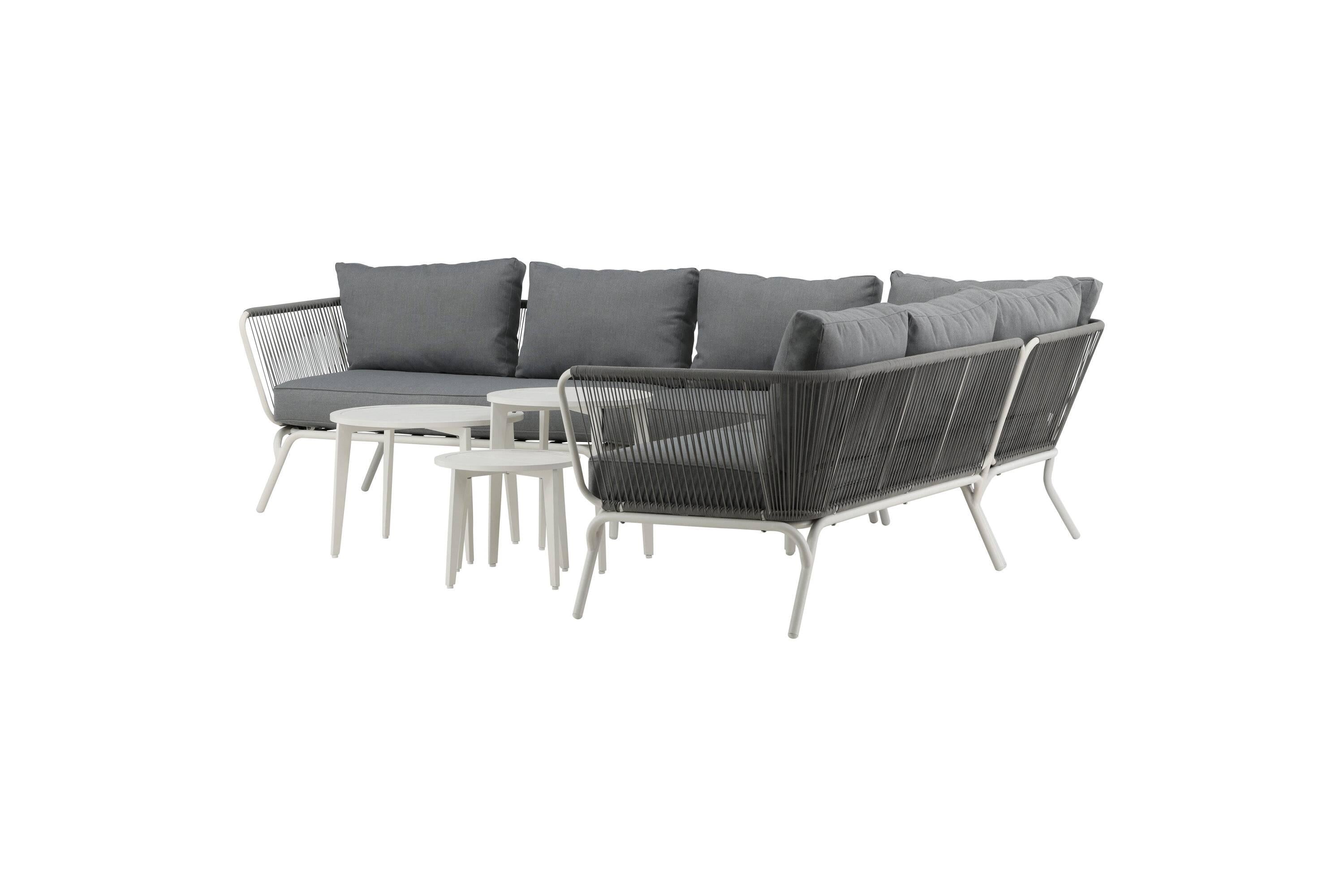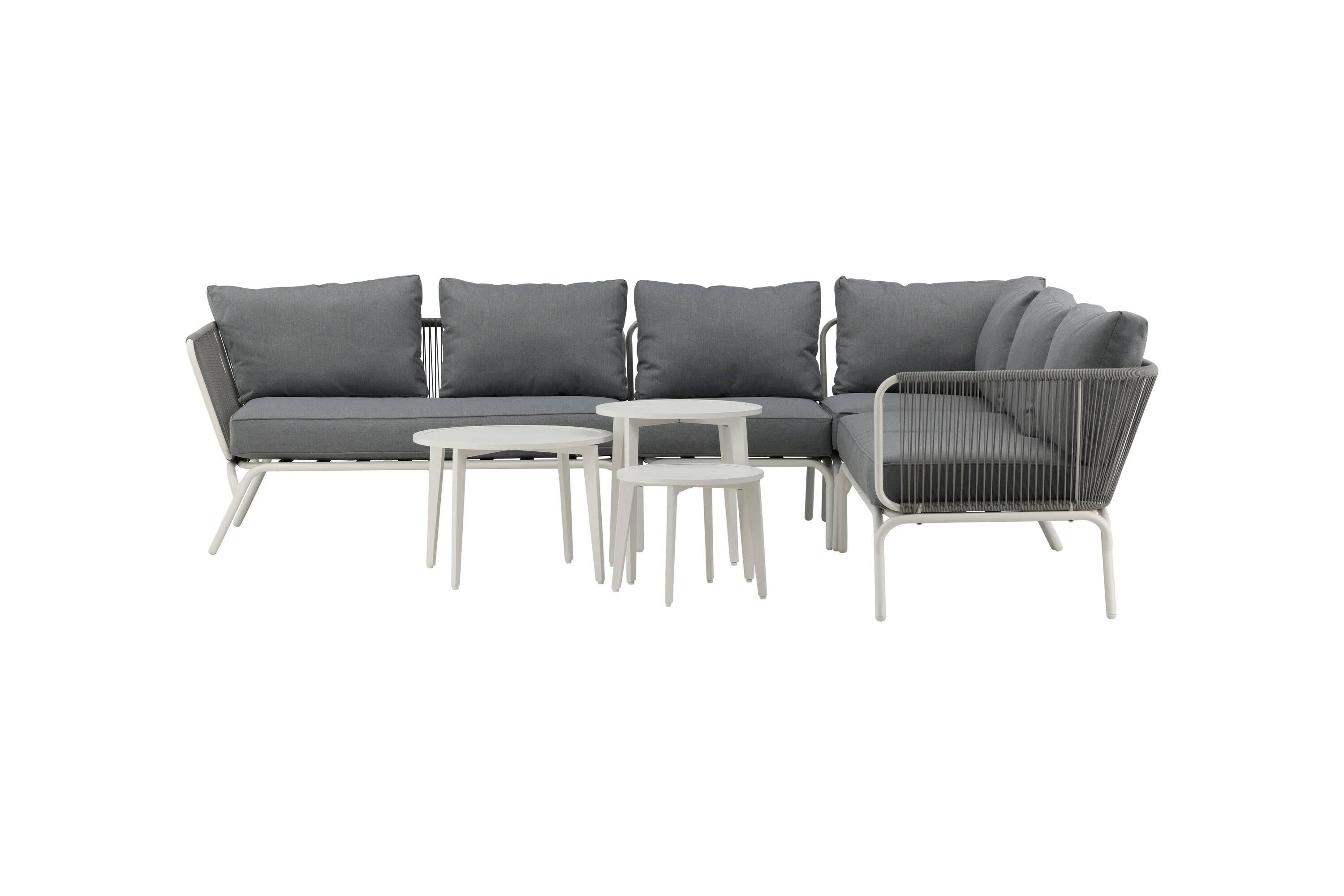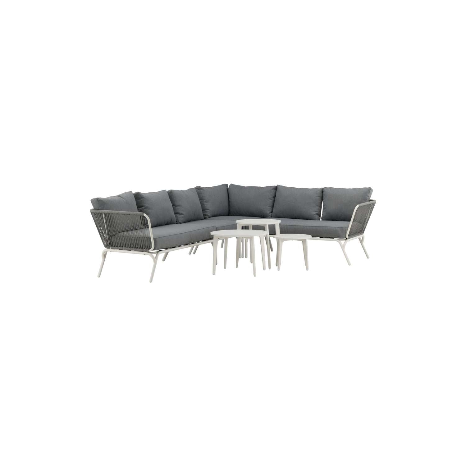 - De loungeset bevat een hoekbank met 5 zitplaatsen, een hoekdeel van wit metaal met lichtgrijs touw en drie salontafels van wit gepoedercoat metaal.