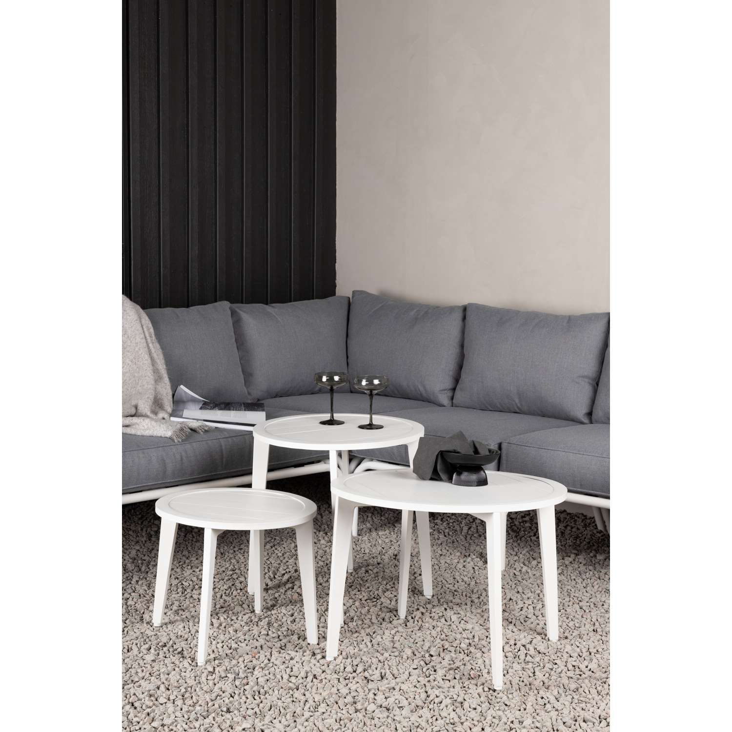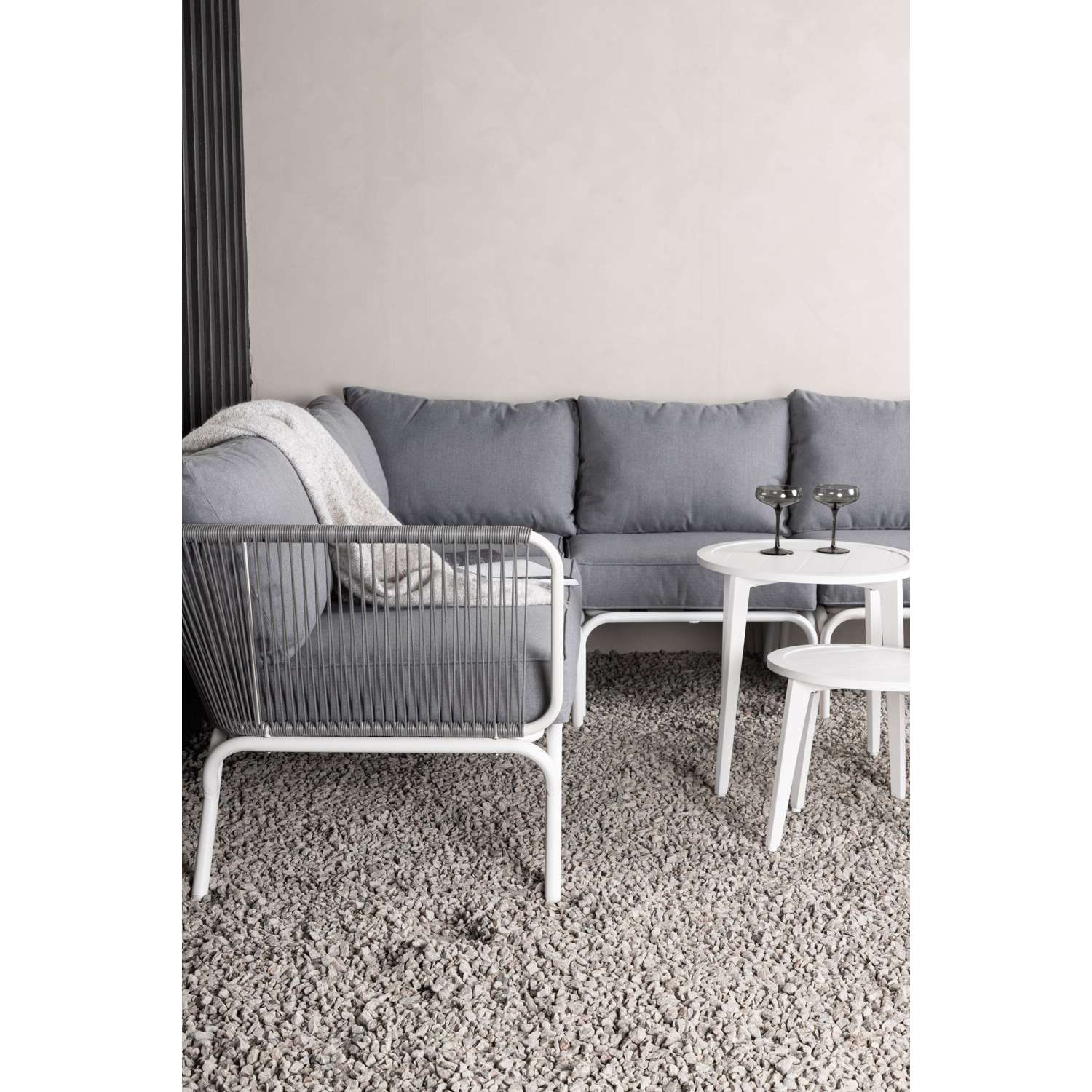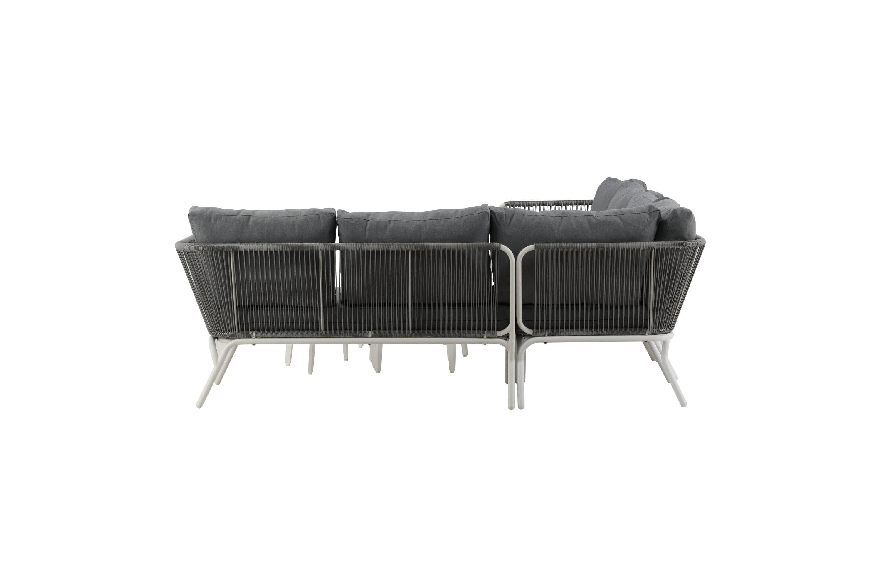 - De loungeset bevat een hoekbank met 5 zitplaatsen, een hoekdeel van wit metaal met lichtgrijs touw en drie salontafels van wit gepoedercoat metaal.