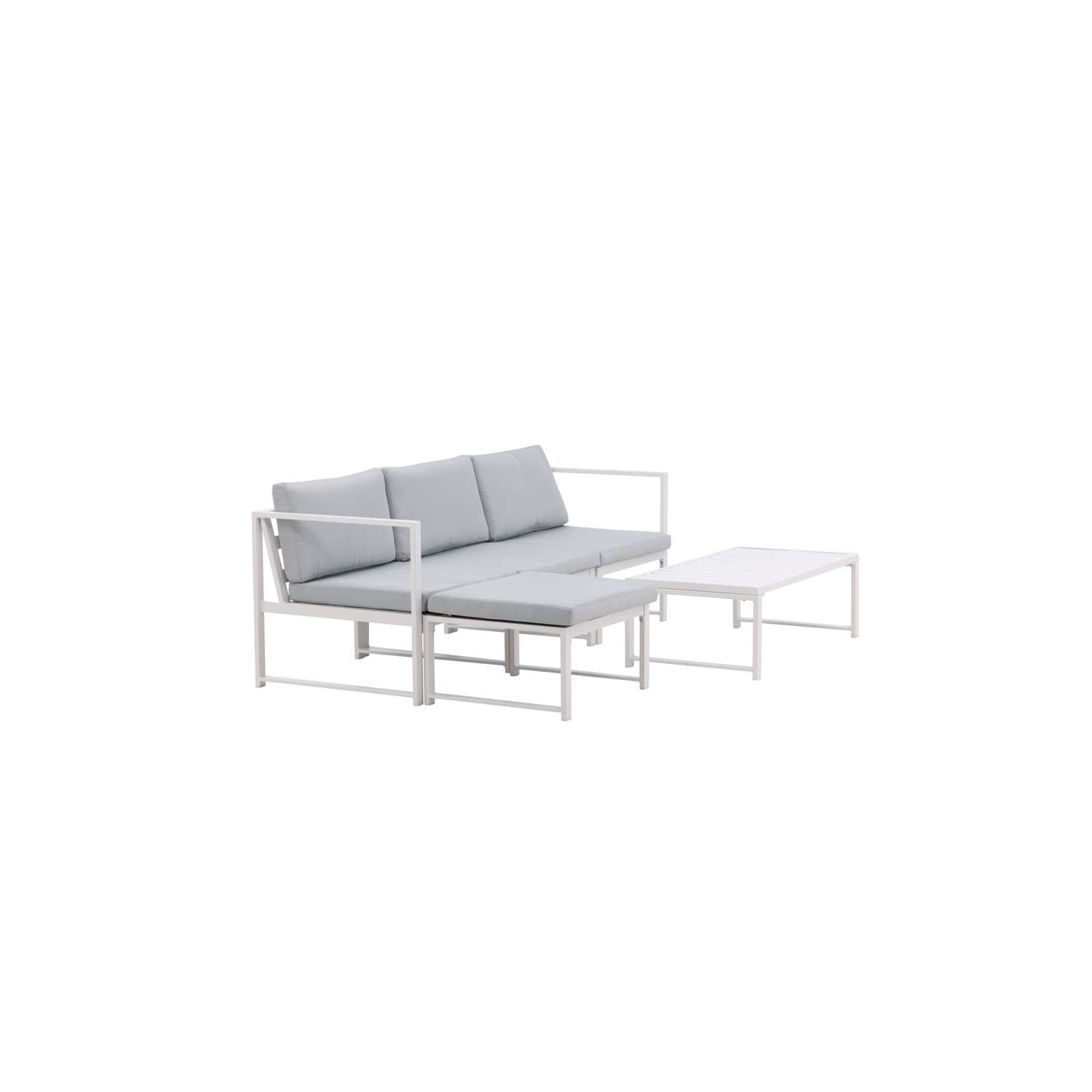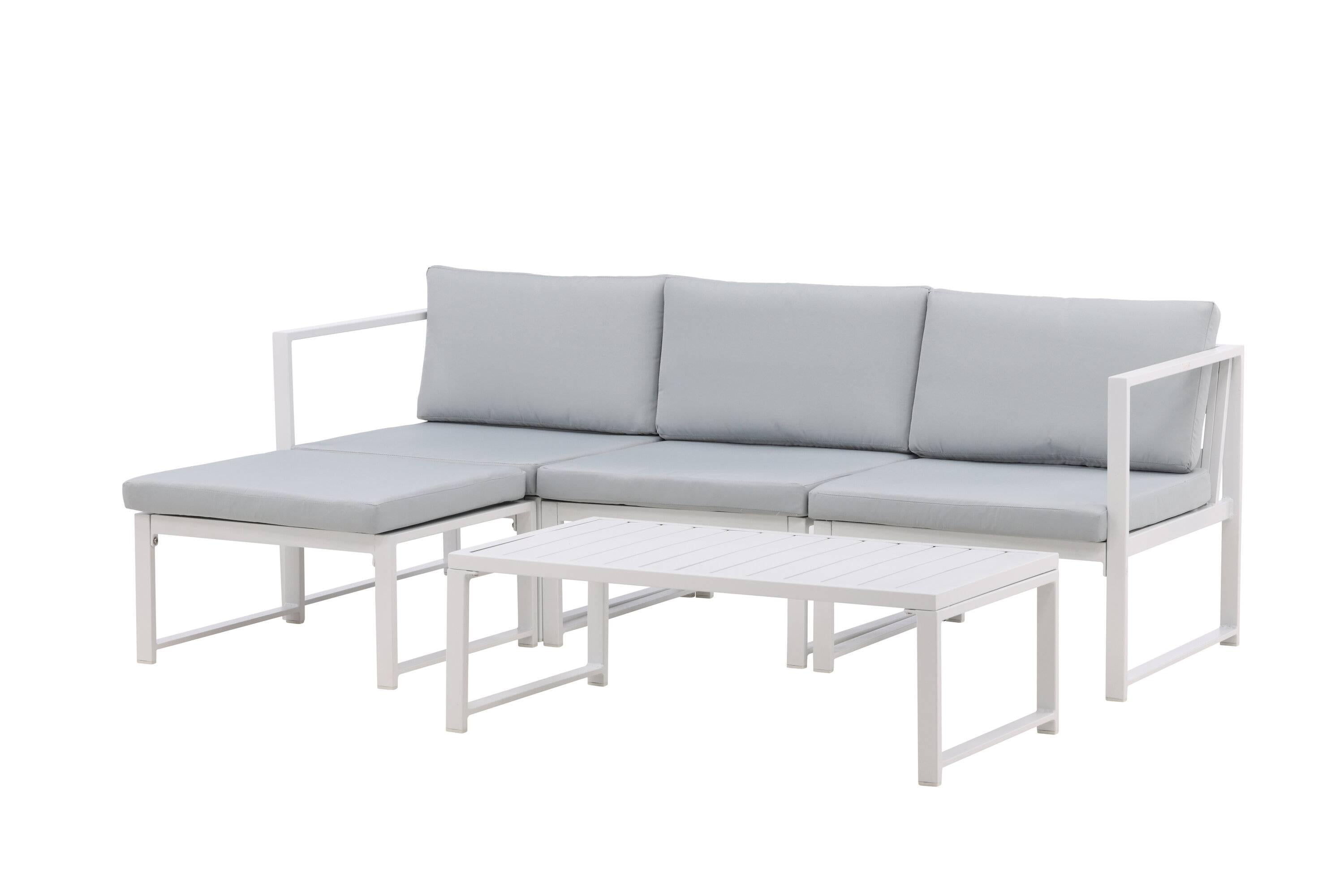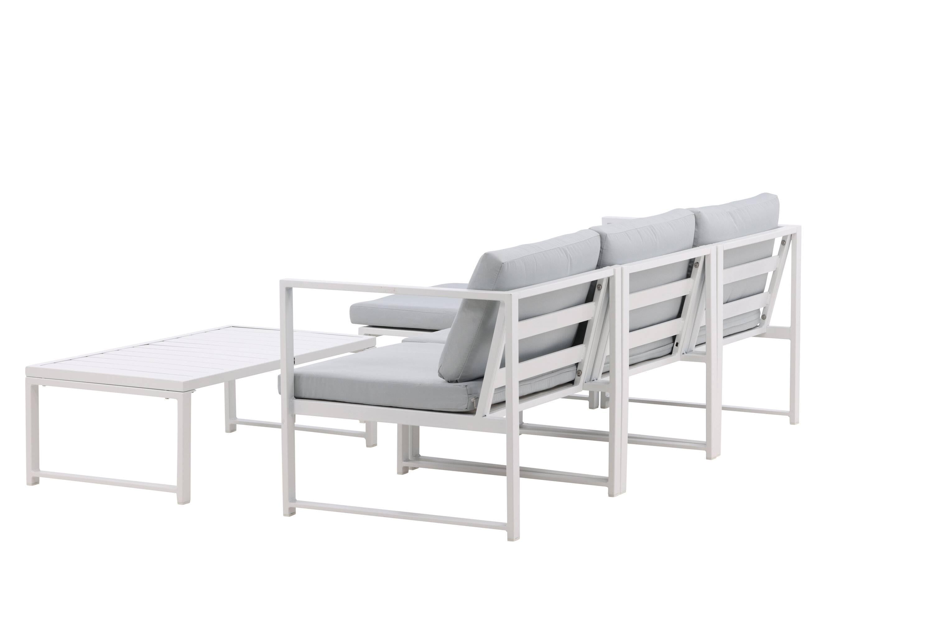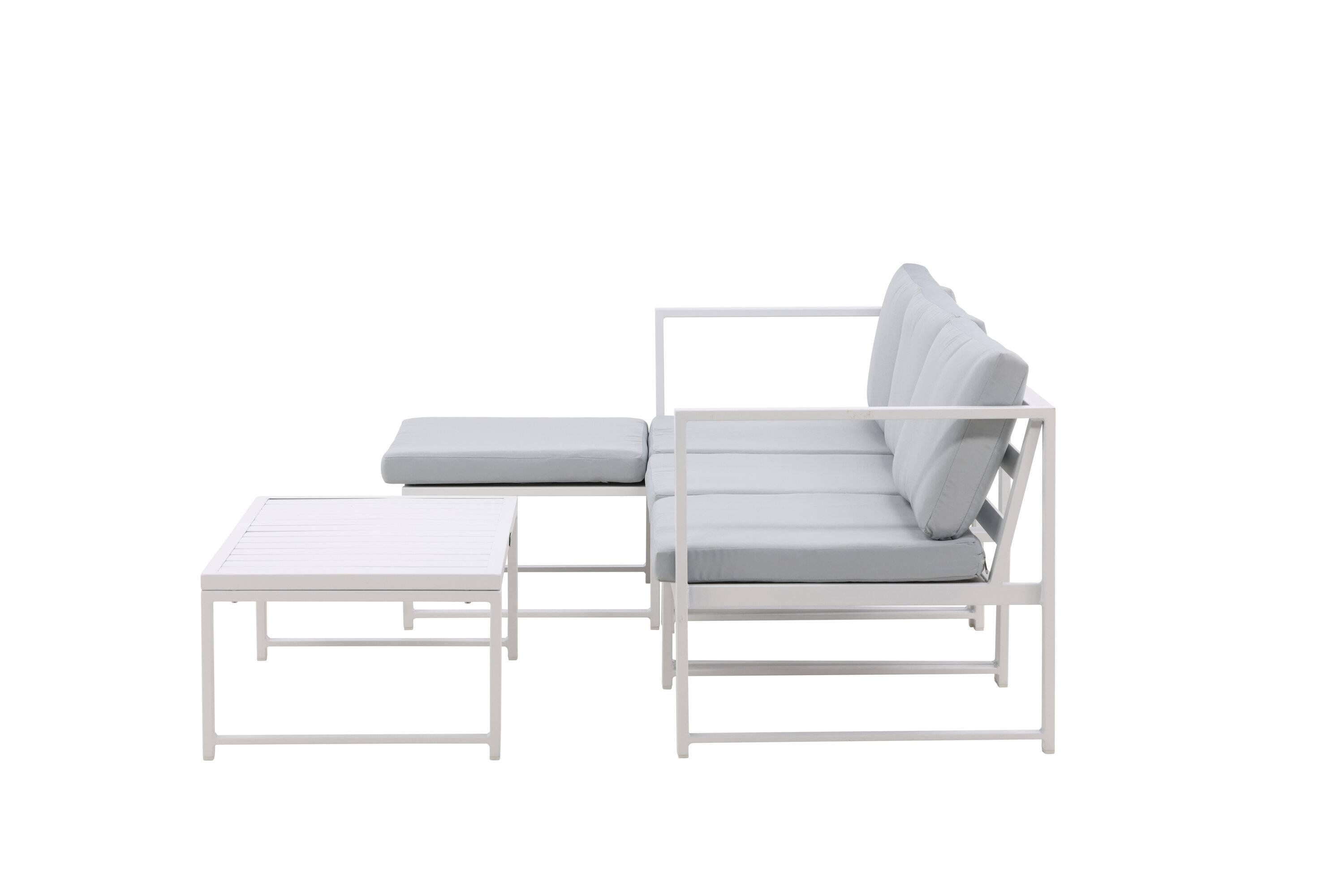 - De lounge set bestaat uit een driezitsbank met een chaise longue en een salontafel