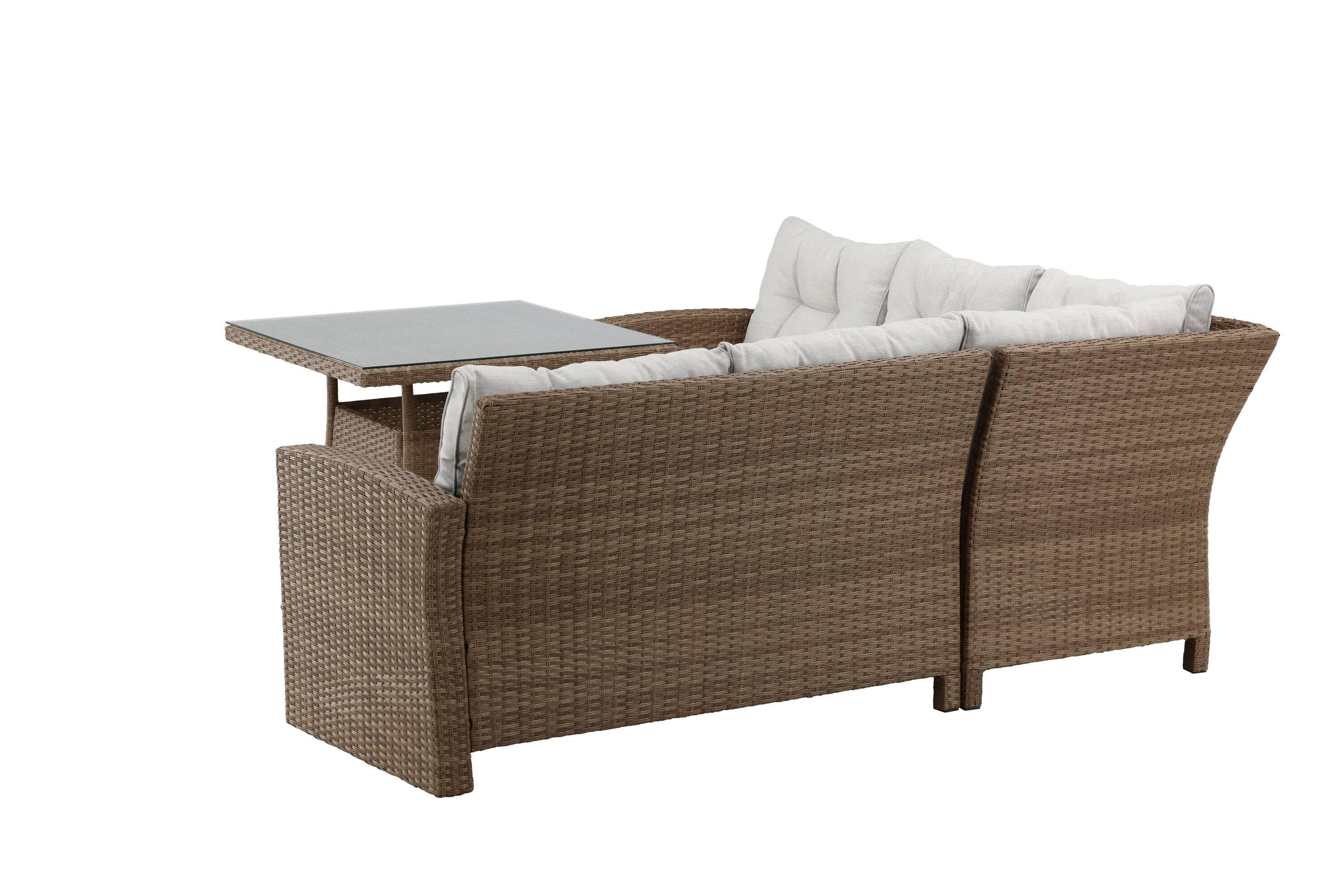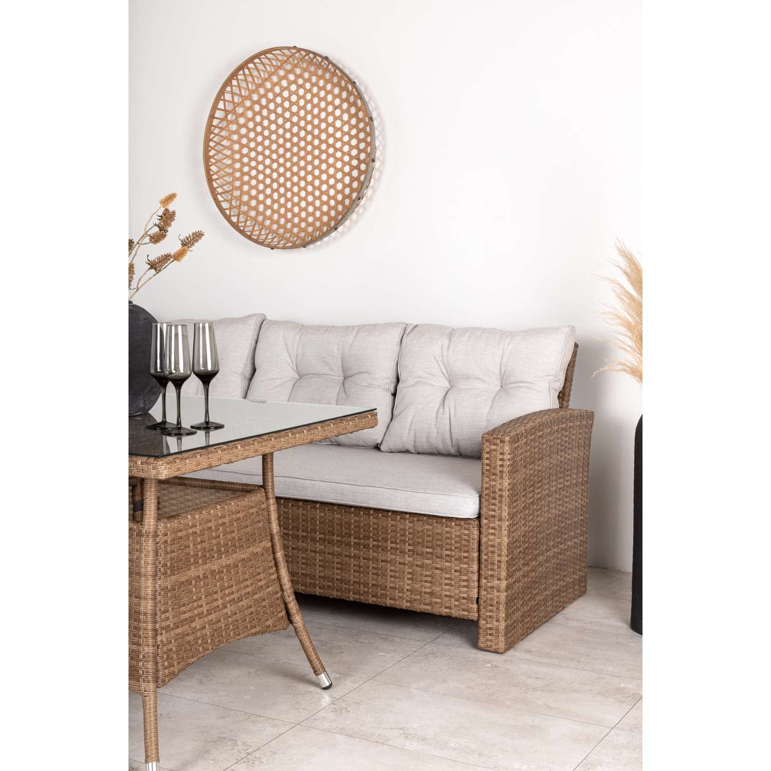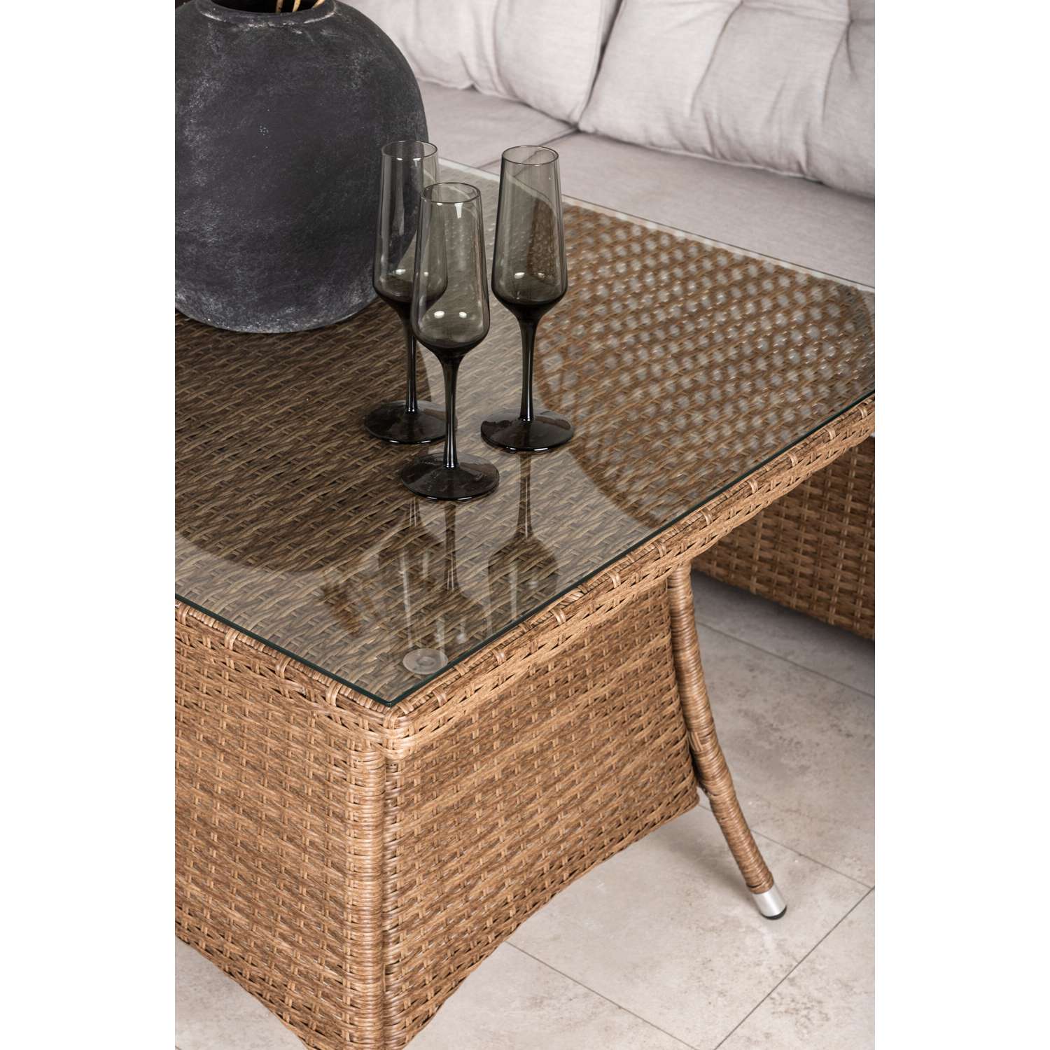 - De loungeset bevat een hoekbank van natuurlijk kunstrotan met 5 zitplaatsen en een hoekstuk, plus een hogere tafel met opbergplank en glazen blad.
