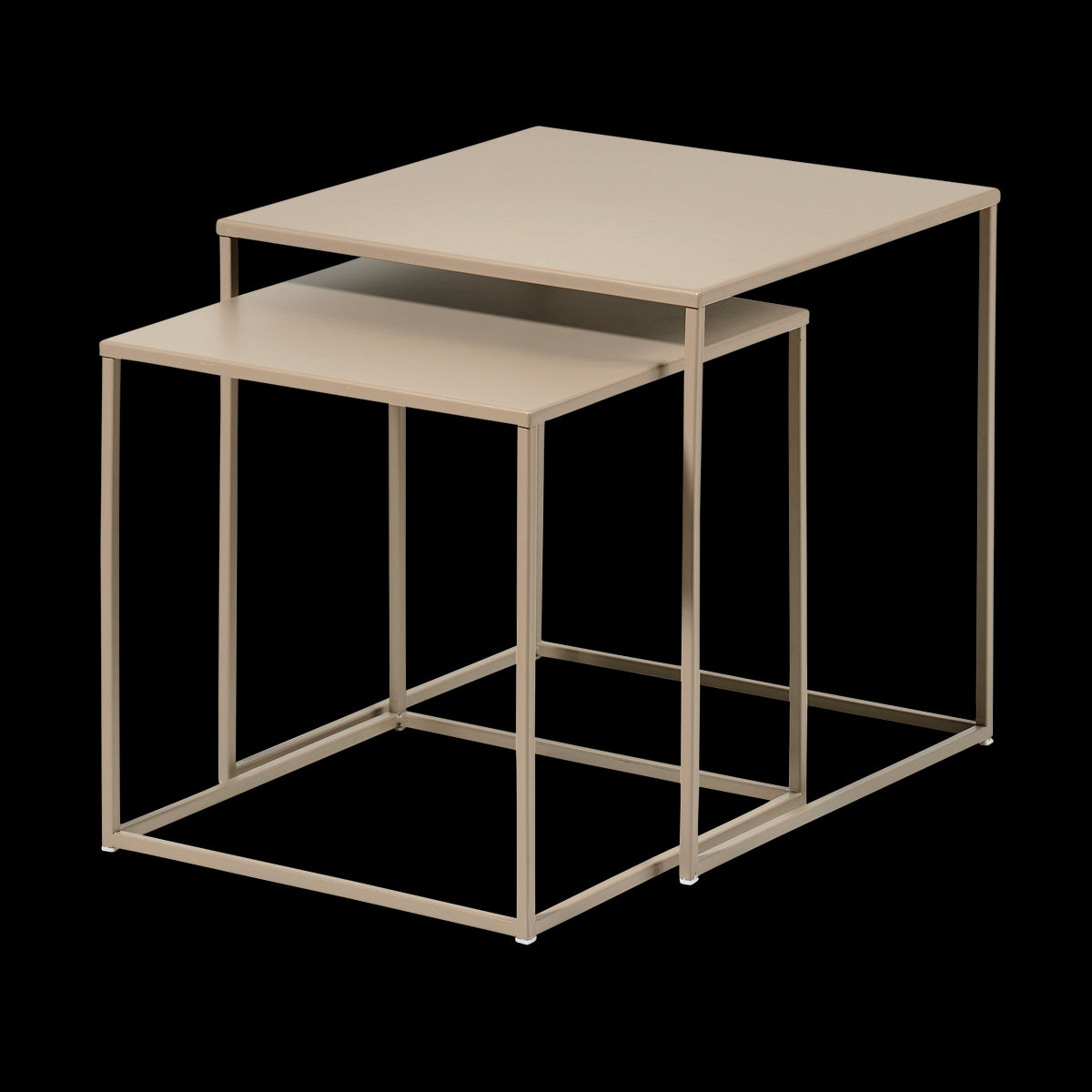 De bijzettafels zijn gemaakt van metaal en hebben beide een neutrale beige kleur. De afmetingen zijn als volgt: