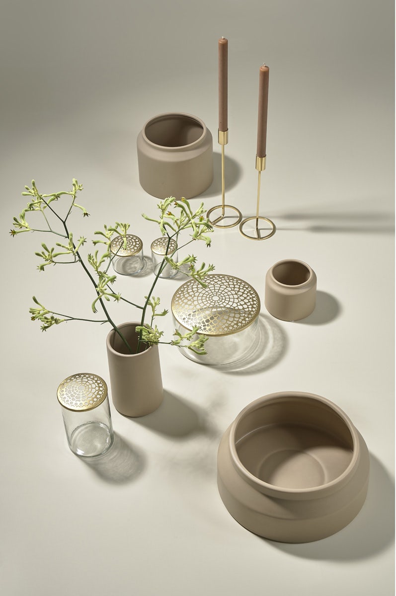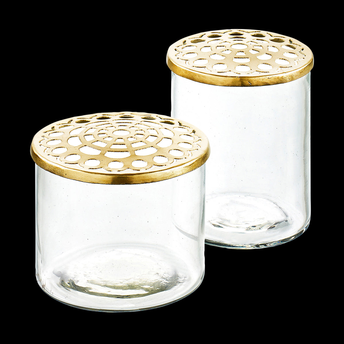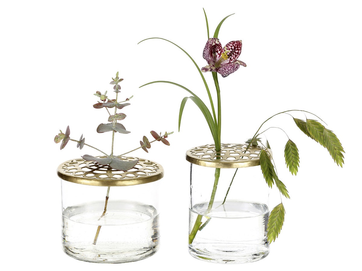 Deze set bestaat uit twee vazen gemaakt van glas en een goudkleurige deksel. In de deksel zitten uitsparingen waar je bloemen in kan stoppen. De afmeting van de hoge vaas is Ø 6 cm x H8 cm. De afmeting van de lage vaas is Ø 8 cm x H6,5 cm. De Elva vaasjes zijn perfect om echte bloemen of kunstbloemen te schikken. De gouden deksel met uitsparingen maakt het gemakkelijk om de bloemen te schikken. Je kan de vaasjes ook vullen met verschillende takken en planten om je huis op te fleuren. De Elva vaas is ook als enkele grote vaas beschikbaar.