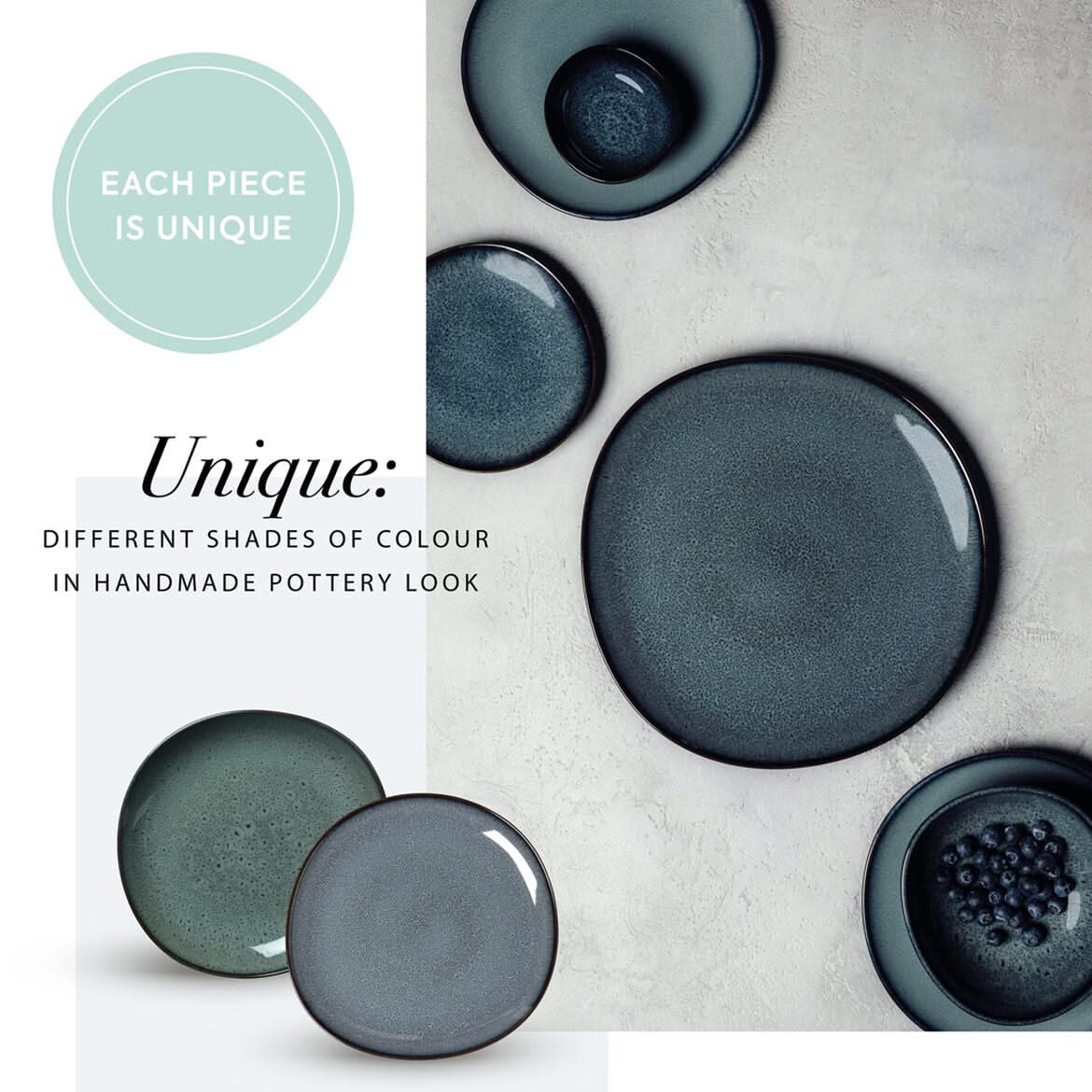 - Het ambachtelijk gevormd aardewerk geeft ieder stuk een unieke afwerking en kleurverloop