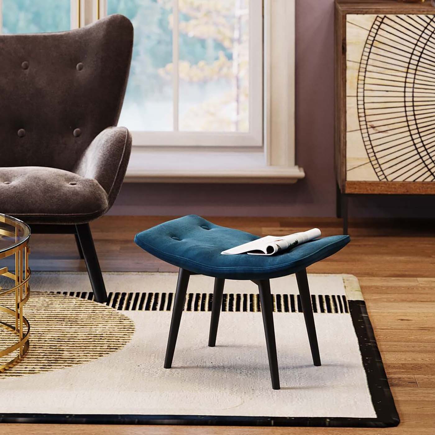 - Beukenhouten poten zorgen voor stabiliteit en een vleugje elegantie, terwijl de zitting is bekleed met zacht polyester in petrol-blauw.