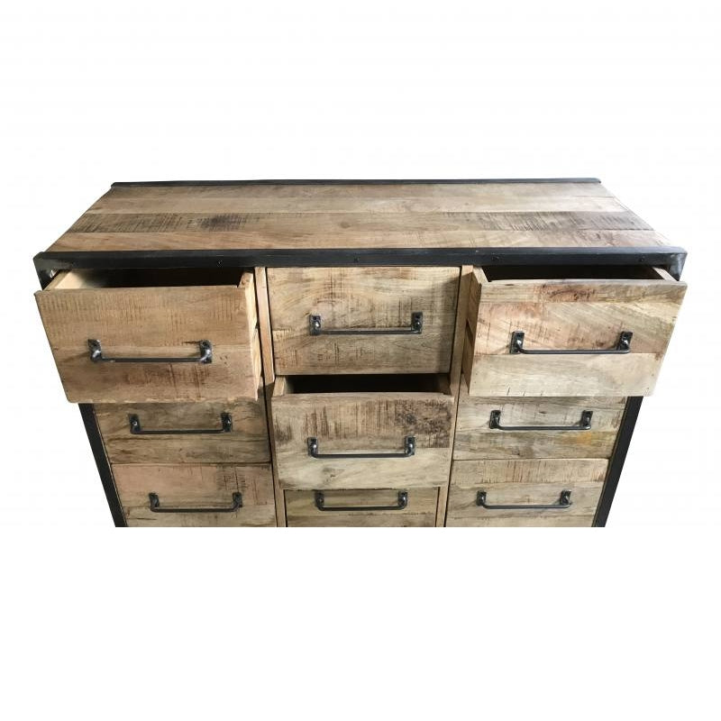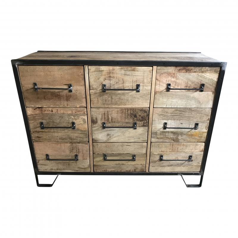 Maak uw interieur compleet met deze gave industriële kast / dressoir van Mangohout. De kast heeft totaal 9 lades. De kast is 120 cm breed, 40 cm diep en 90 cm hoog. De kast is een echte eye catcher in uw interieur. Het mangohout geeft een warme gezellige sfeer! De kast heeft zeer veel opbergruimte. Gratis verzending!
