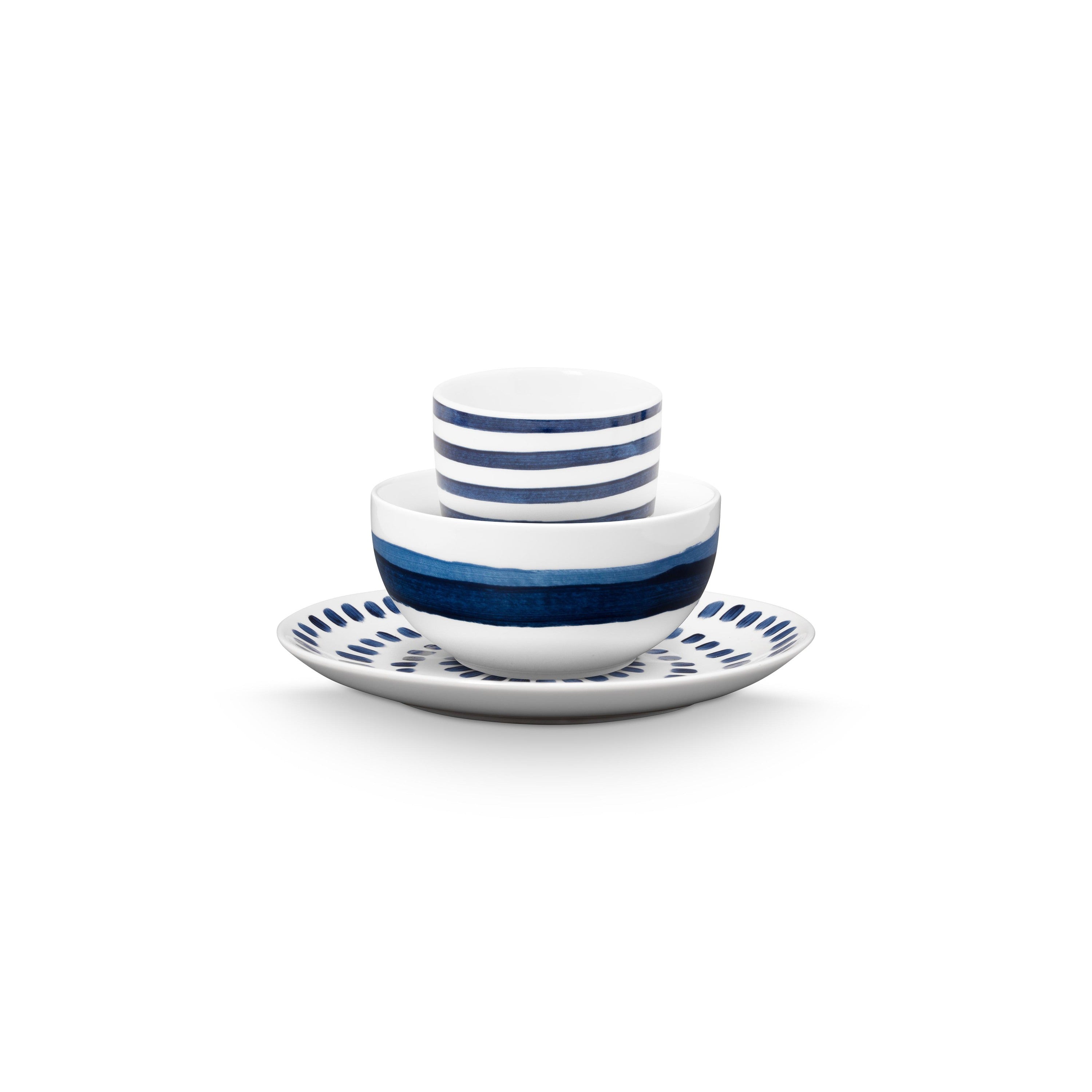 - De ontbijset bestaat uit een bord, kom en mok zonder oor.