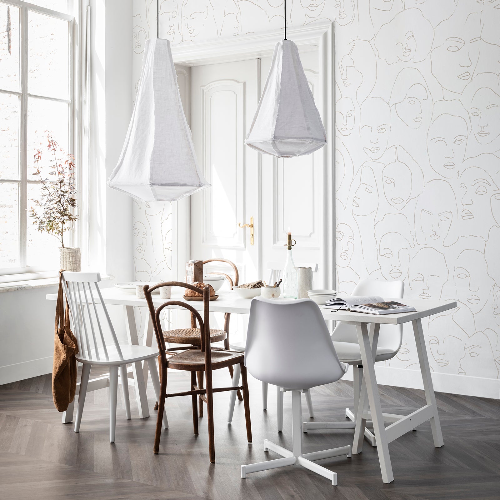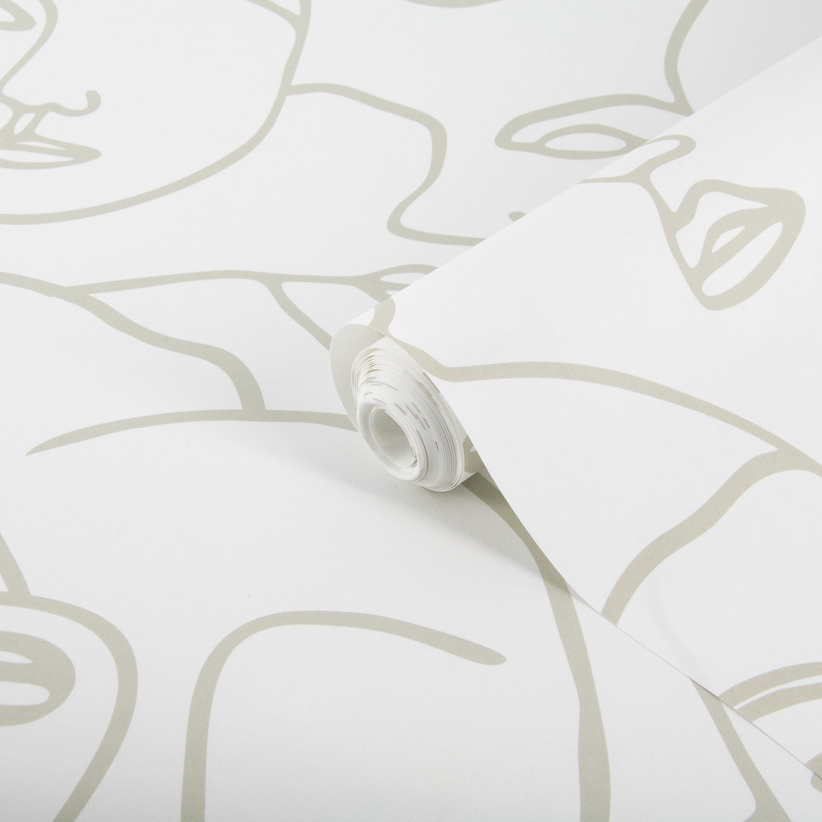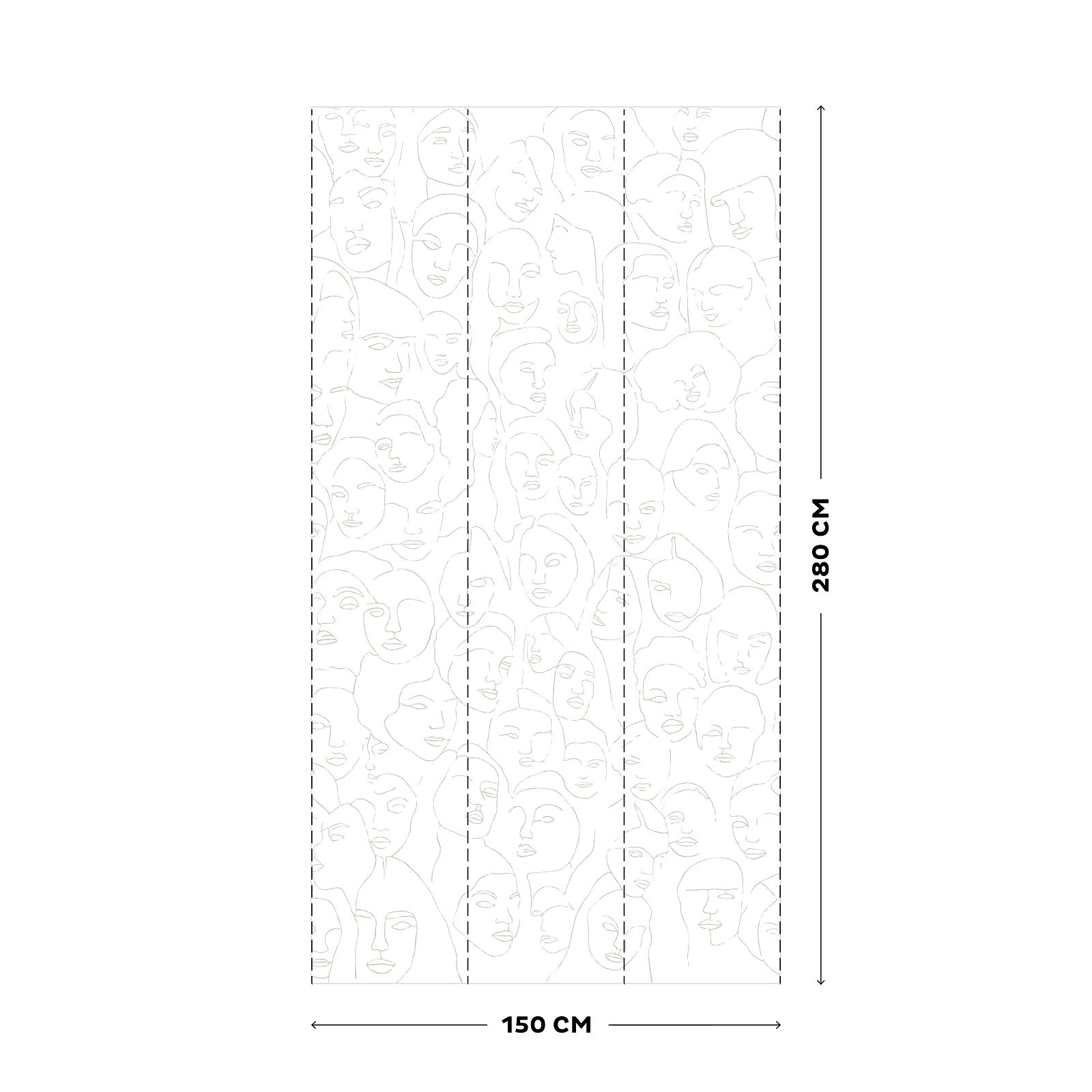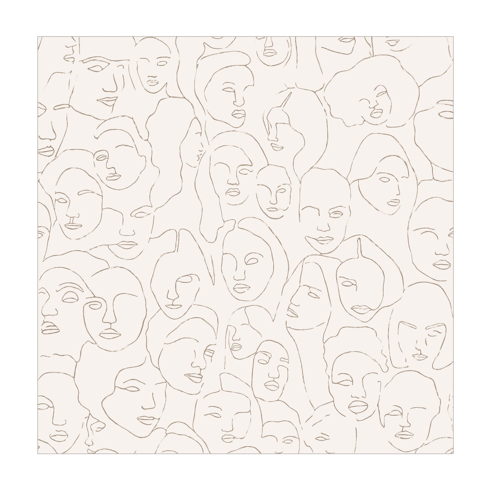 - Design: Getekende, abstracte vrouwengezichten in beige lijnen tegen een witte achtergrond