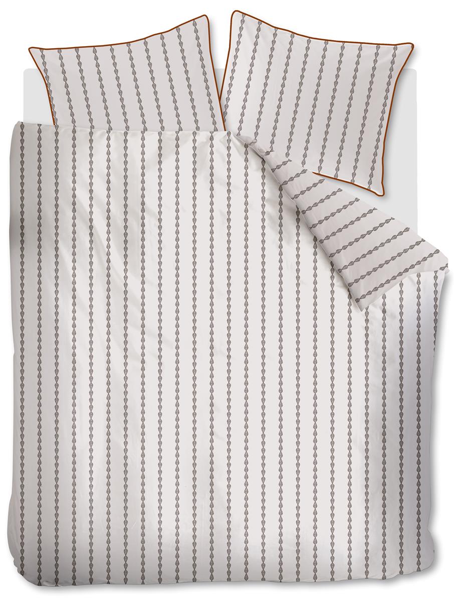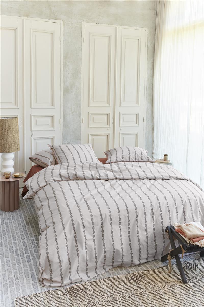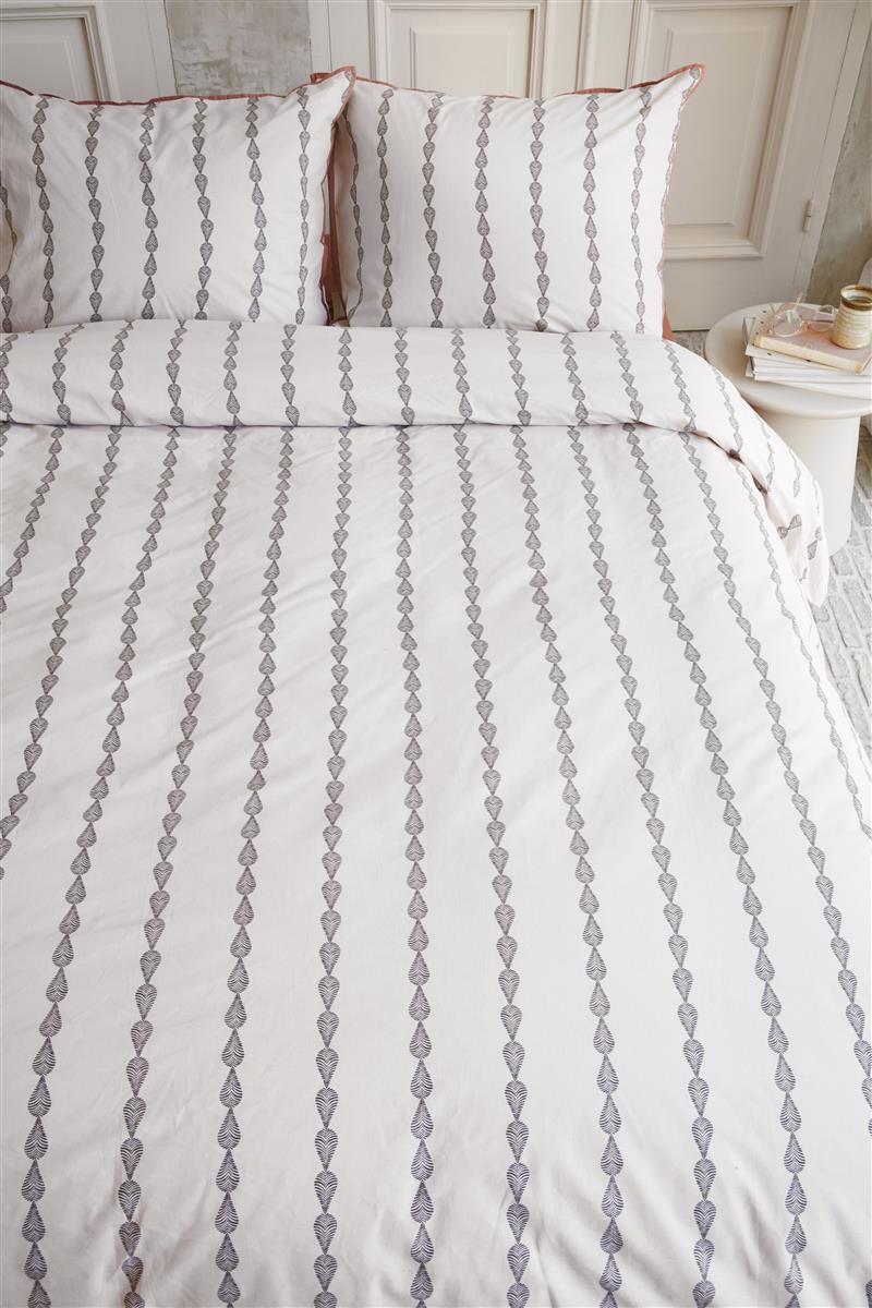 Krachtige en subtiele mix Het dekbedovertrek is voorzien van handgeschilderde veren in verticale banen en dat zorgt voor een mooie uitstraling. De terrakleurige bies om de kussenslopen zorgt voor een stijlvolle afwerking. Wat een plaatje!