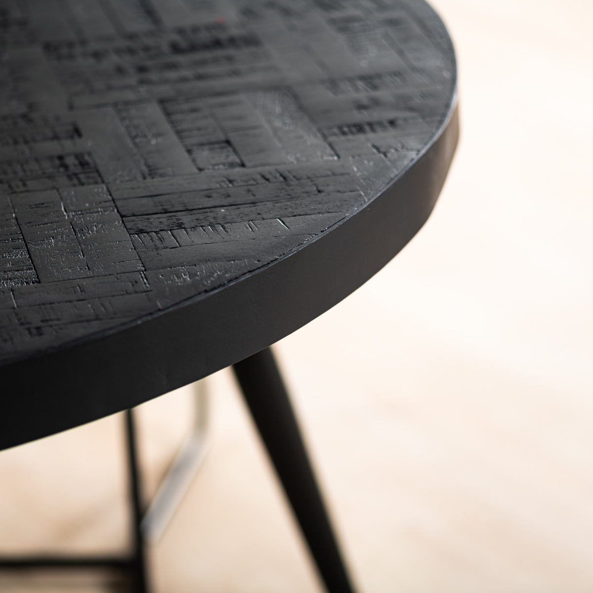 Met eettafel Jens geniet u van de perfecte combinatie tussen een stoer en natuurlijk design. Deze eettafel heeft een afmeting van B120xD120xH76 cm en komt uit de collectie van het geliefde woonmerk Vurna. Hij is voorzien van vier stevig metalen poten met een zwarte afwerking. Opvallend aan zijn design is het ronde tafelblad met een dikte van 5 cm, welke is uitgevoerd in 100% gerecycled teakhout in het zwart. Plaats eettafel Jens in de woonkeuken of eetkamer en geniet van zijn design en gemak! Let op! Teakhout is een natuurproduct. Iedere tafel heeft een eigen, uniek karakter. Deze gave ronde eettafel past in diverse interieurstijlen en is helemaal van nu door zijn zwarte afwerking.