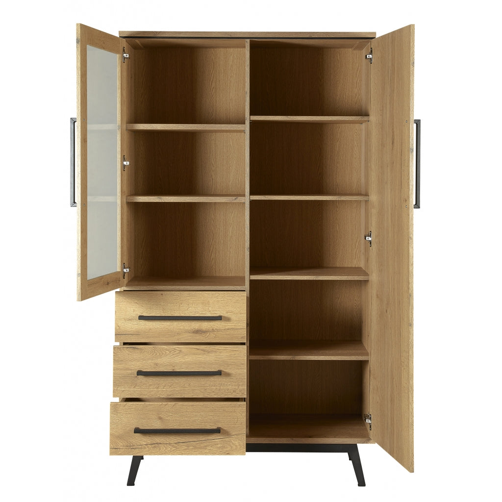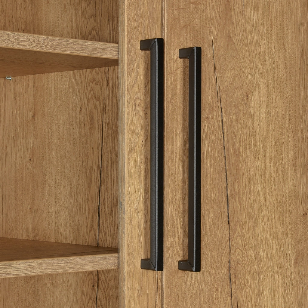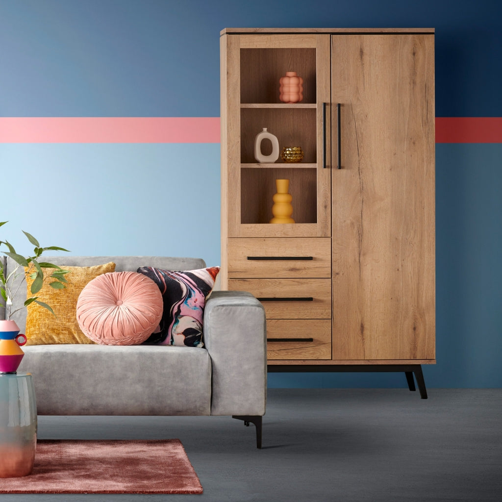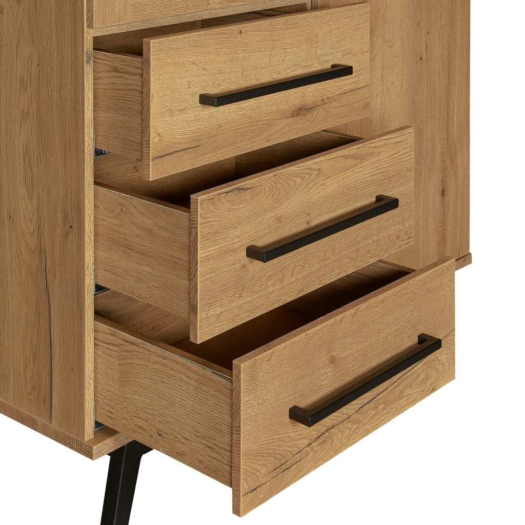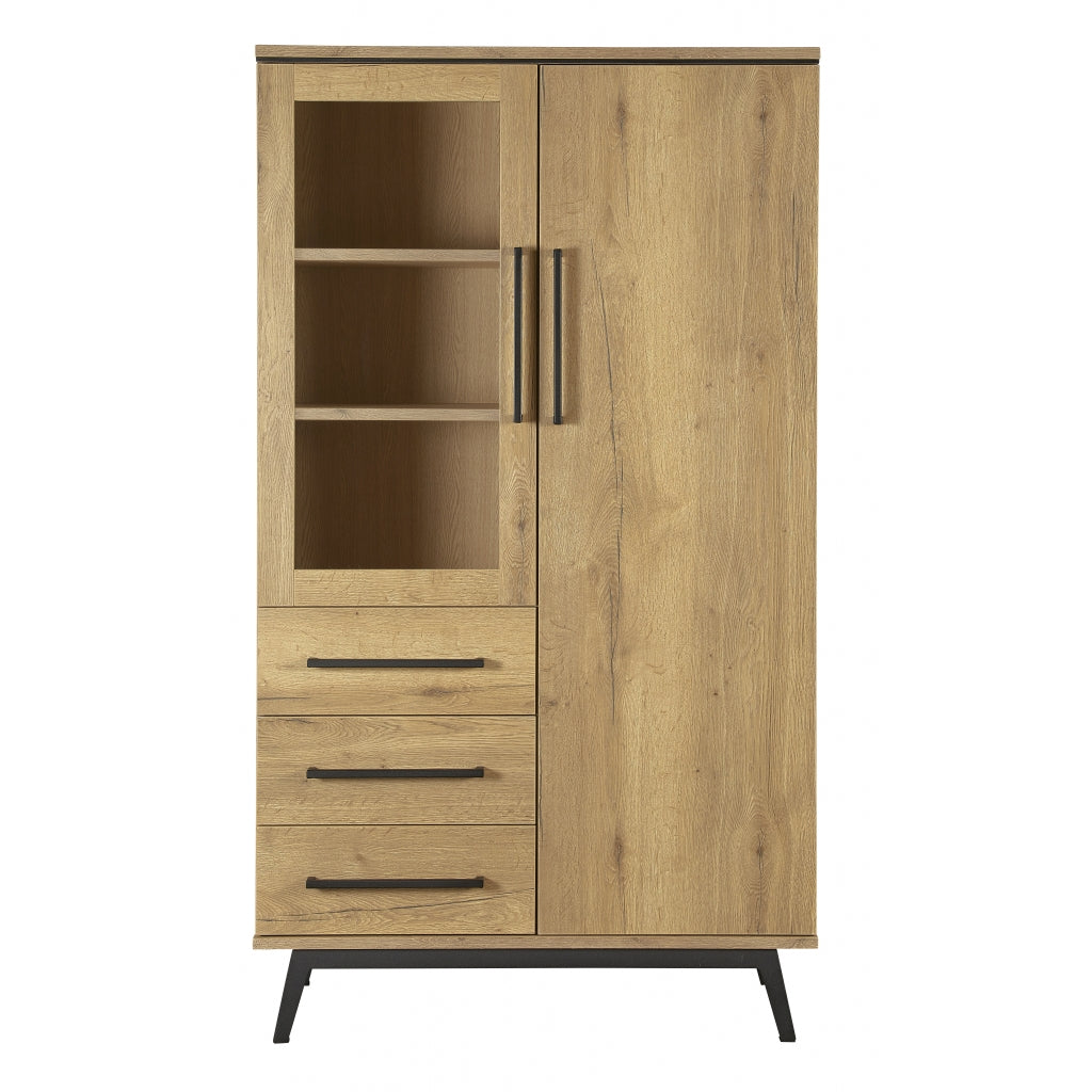 De wandkast Batenburg heeft opvallende stijlelementen. Het onderstel van zwart metaal heeft een Scandinavische invloed, met hoge poten die wijd uitstaan. De combinatie van stoer hout en zwart metaal geeft de kast een industrieel uiterlijk, terwijl de robuuste houtlook een landelijke sfeer creëert. Hierdoor past deze vitrinekast perfect bij verschillende moderne interieurstijlen. Combineer de kast met andere meubels uit de Batenburg collectie voor een sfeervol geheel. Indeling De kast heeft aan de linkerkant een vitrinegedeelte met een glazen deur en daaronder 3 laden. De laden sluiten soepel en geruisloos dankzij het softclose systeem. Aan de rechterkant bevindt zich een deur over de volledige lengte van de kast, met daarachter veel opbergruimte. Specificaties De wandkast heeft een breedte van 107 cm, een diepte van 45 cm en een hoogte van 190 cm. Hij is gemaakt van lamulux, een kras- en slijtvast materiaal met een warme eiken houtlook. De kast voelt luxe aan en heeft een structuur die niet van echt hout te onderscheiden is. Het onderstel en de grepen zijn gemaakt van zwart metaal. De kast wordt gemonteerd geleverd.| Afmetingen | |