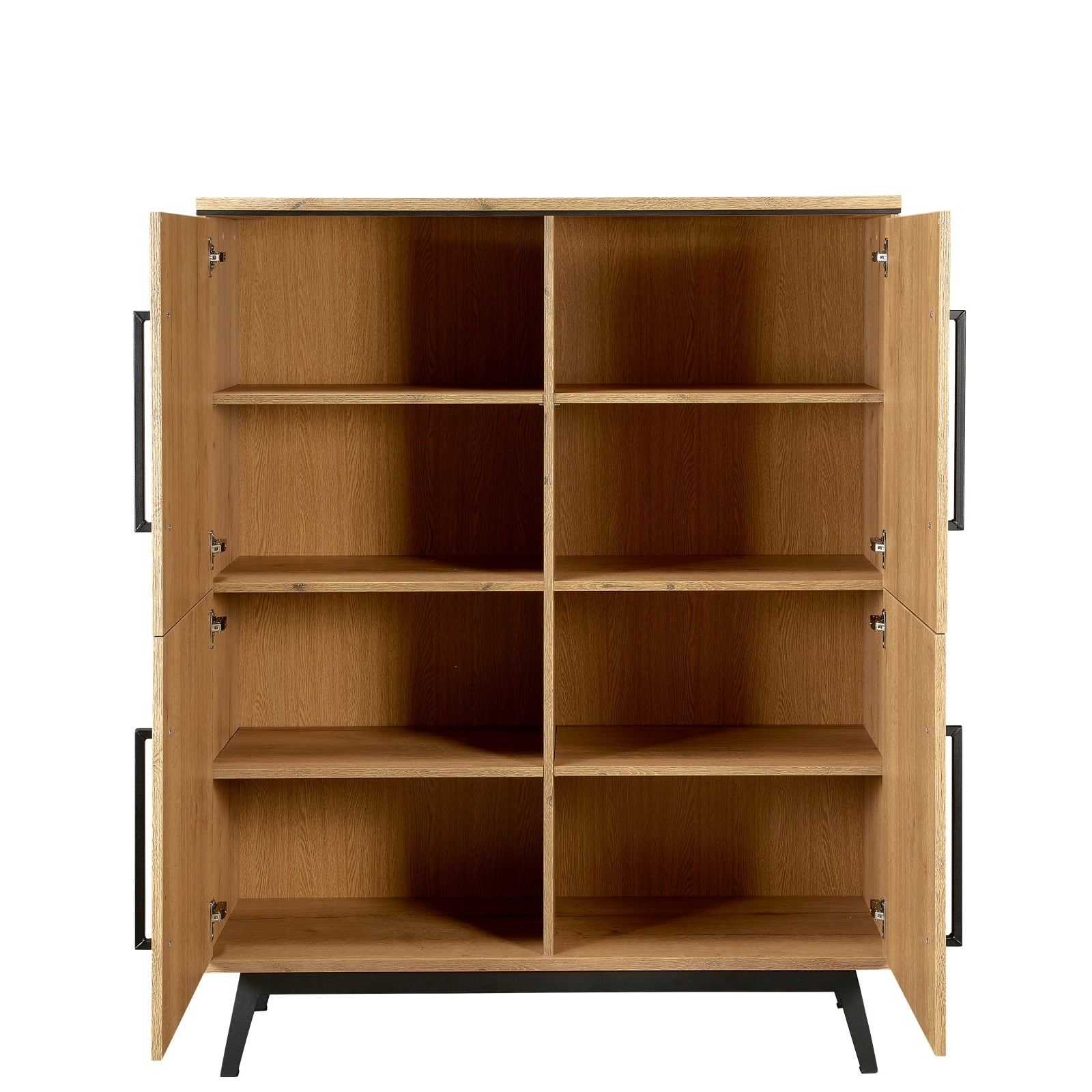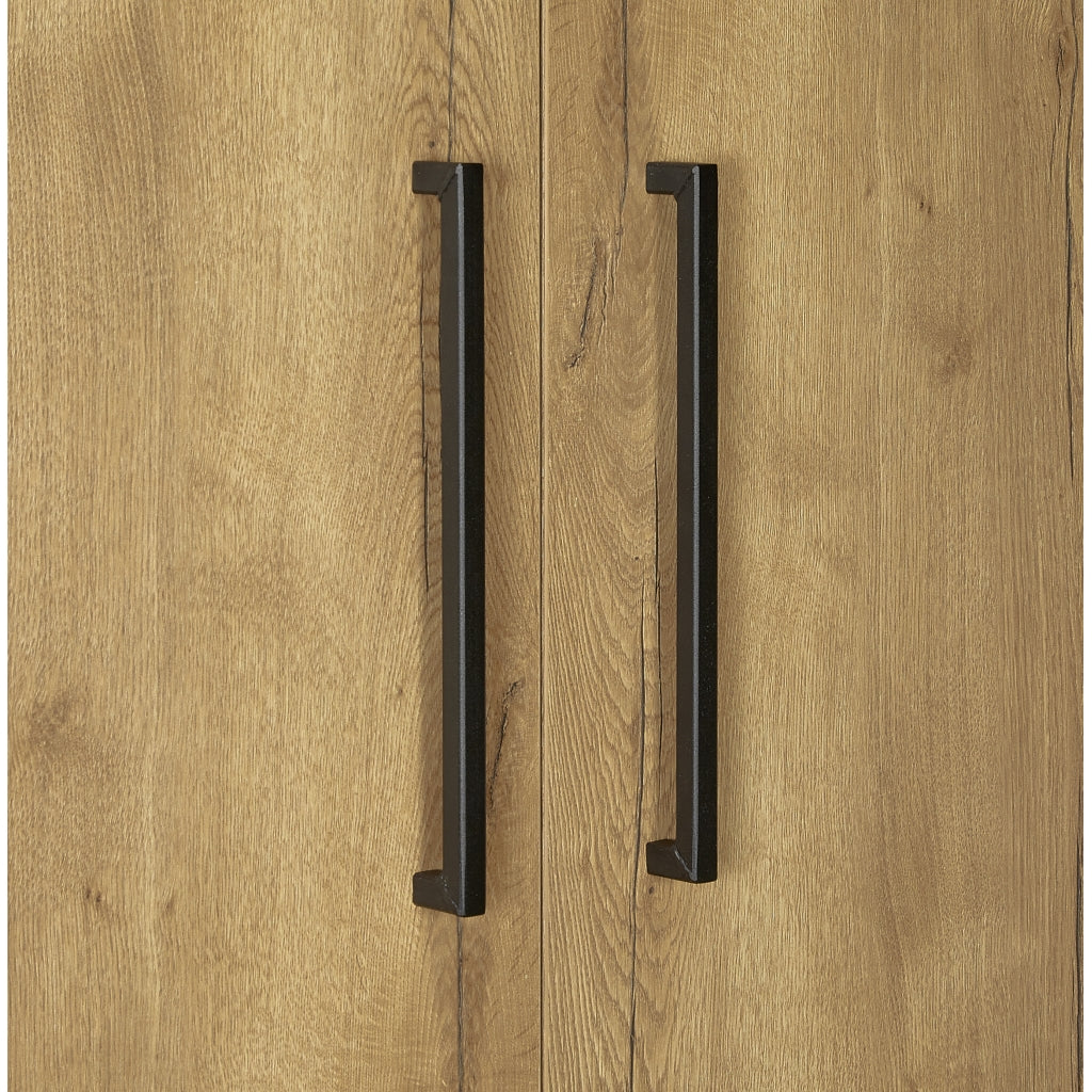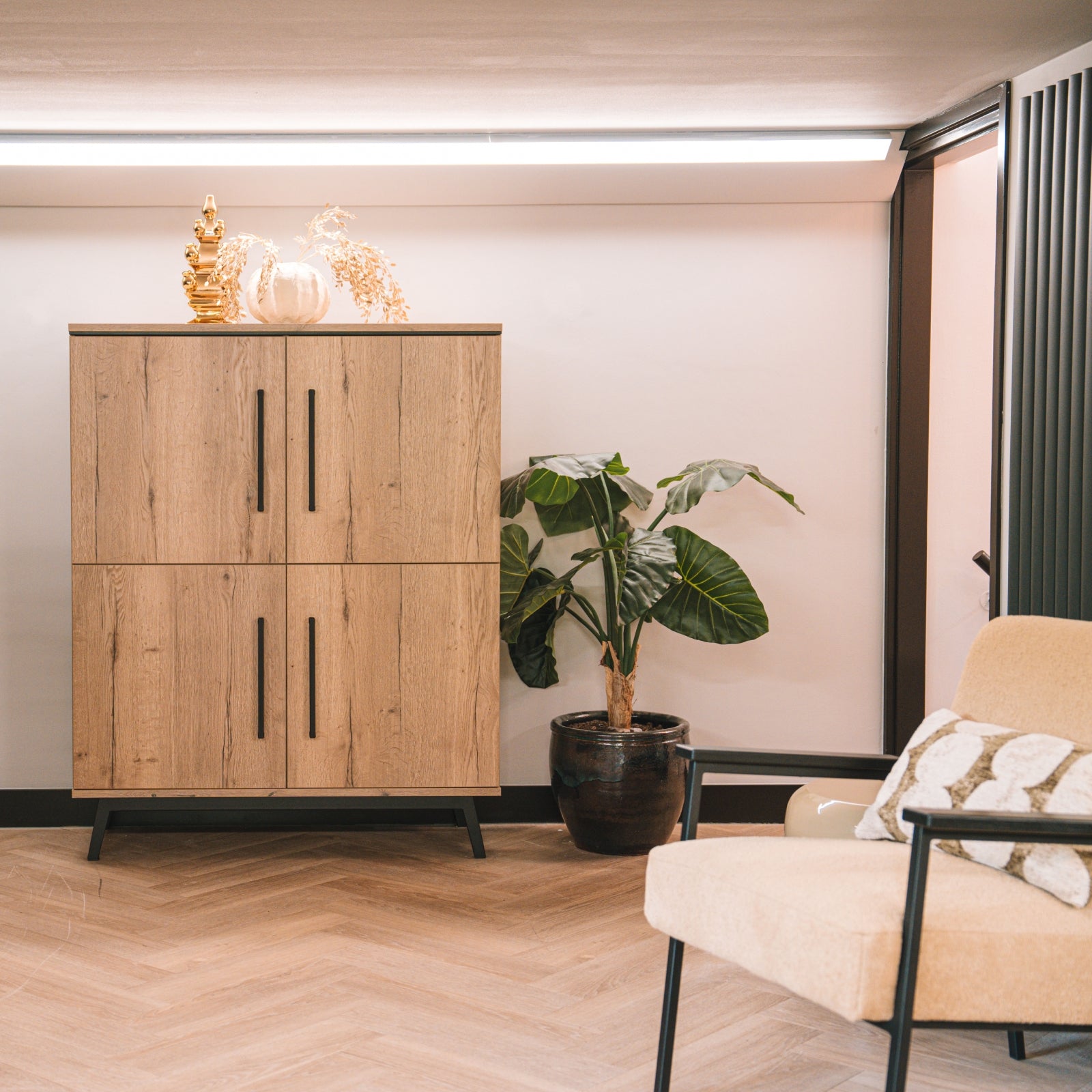 De wandkast Batenburg heeft opvallende stijlelementen. Het onderstel is gemaakt van zwart metaal en heeft een Scandinavische invloed, met hoge poten die wijd uitstaan. De combinatie van stoer hout en zwart metaal geeft de kast een industrieel uiterlijk, terwijl de robuuste houtlook een landelijke sfeer creëert. Hierdoor past deze wandkast perfect bij verschillende moderne interieurstijlen. Combineer de kast met andere meubels uit de Batenburg collectie voor een sfeervol geheel. Praktische indeling De kast heeft 4 dichte deuren en biedt veel opbergruimte. Met een hoogte van 150 cm kun je ook leuke woonaccessoires of een mooie lamp op de kast plaatsen. Specificaties De wandkast Batenburg is 120 cm breed, 45 cm diep en 150 cm hoog. De kast is gemaakt van lamulux, een kras- en slijtvast materiaal met een warme eiken houtlook. Het voelt aan als echt hout, maar is van hoge kwaliteit en heeft een luxe structuur. Het onderstel en de grepen zijn gemaakt van zwart metaal. De kast wordt gemonteerd geleverd.| Afmetingen | |