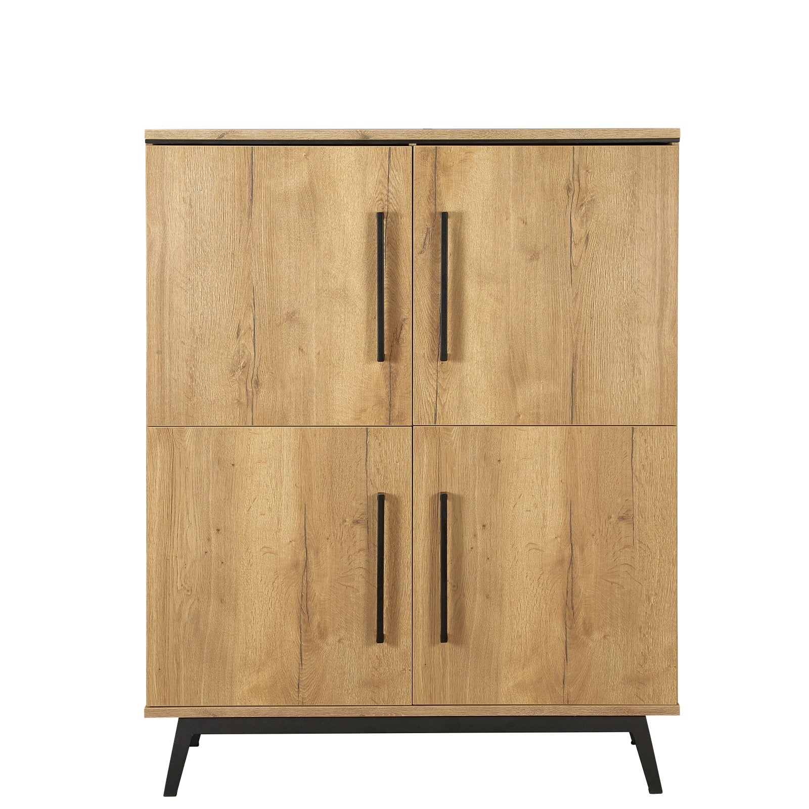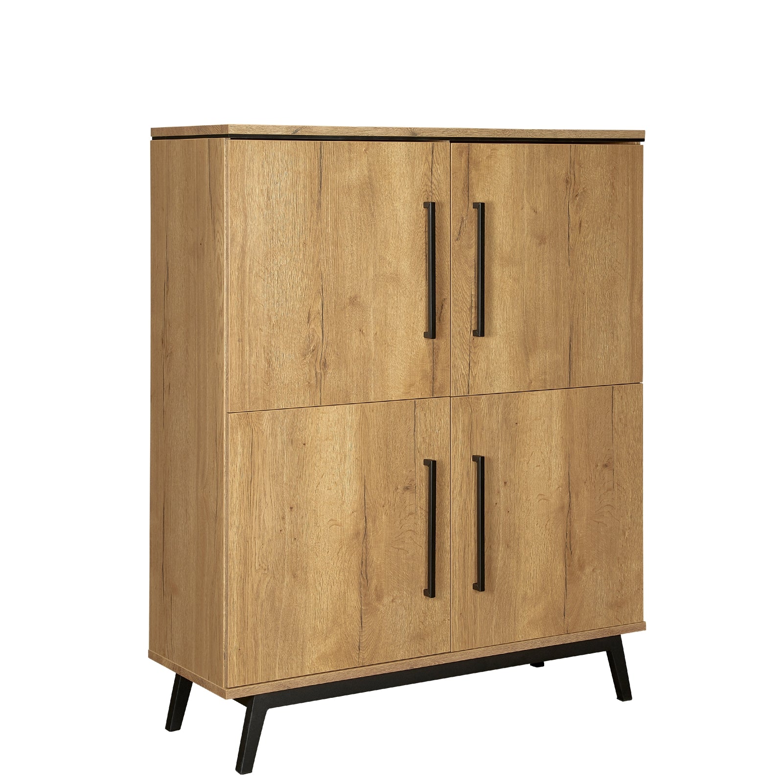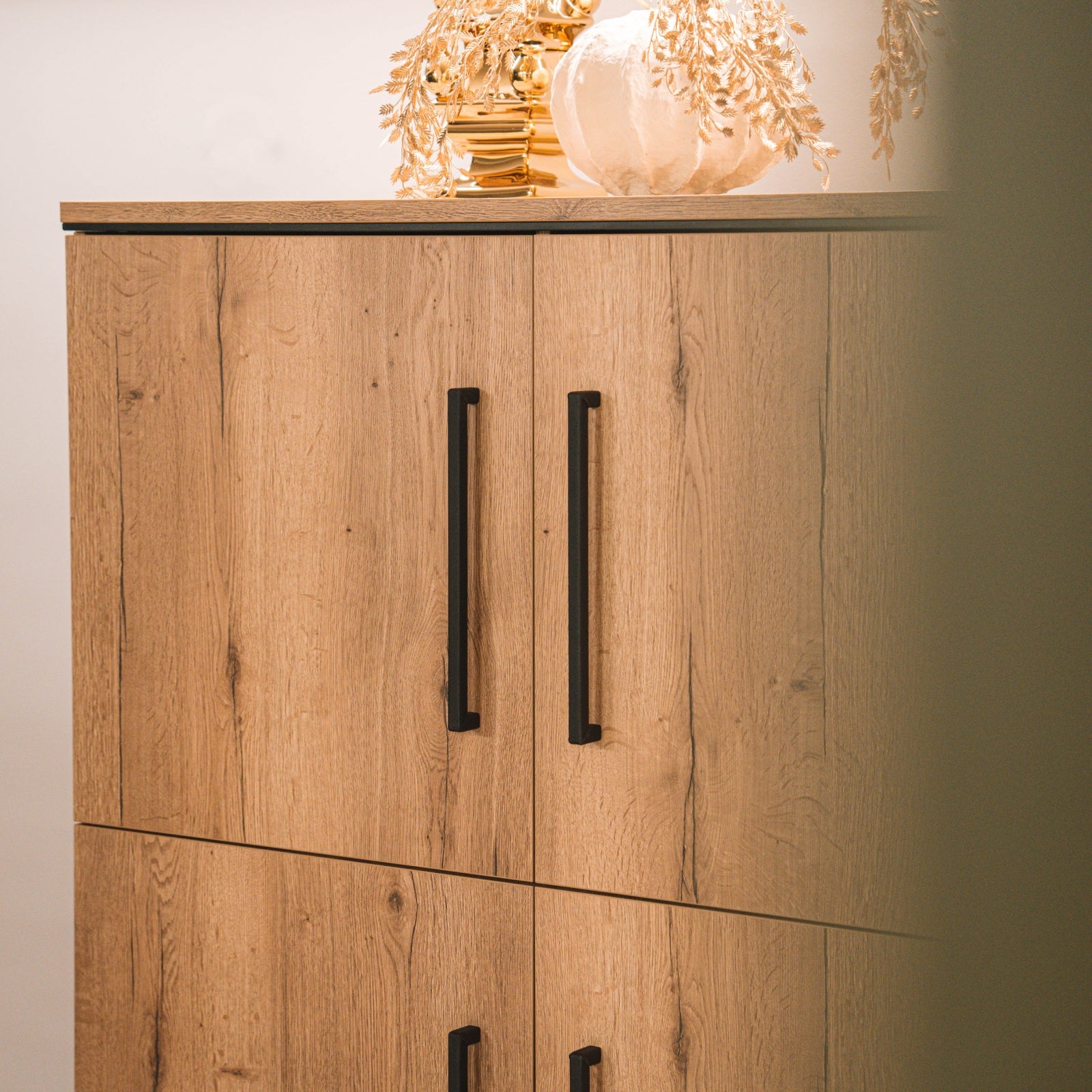 De wandkast Batenburg heeft opvallende stijlelementen. Het onderstel is gemaakt van zwart metaal en heeft een Scandinavische invloed, met hoge poten die wijd uitstaan. De combinatie van stoer hout en zwart metaal geeft de kast een industrieel uiterlijk, terwijl de robuuste houtlook een landelijke sfeer creëert. Hierdoor past deze wandkast perfect bij verschillende moderne interieurstijlen. Combineer de kast met andere meubels uit de Batenburg collectie voor een sfeervol geheel. Praktische indeling De kast heeft 4 dichte deuren en biedt veel opbergruimte. Met een hoogte van 150 cm kun je ook leuke woonaccessoires of een mooie lamp op de kast plaatsen. Specificaties De wandkast Batenburg is 120 cm breed, 45 cm diep en 150 cm hoog. De kast is gemaakt van lamulux, een kras- en slijtvast materiaal met een warme eiken houtlook. Het voelt aan als echt hout, maar is van hoge kwaliteit en heeft een luxe structuur. Het onderstel en de grepen zijn gemaakt van zwart metaal. De kast wordt gemonteerd geleverd.| Afmetingen | |