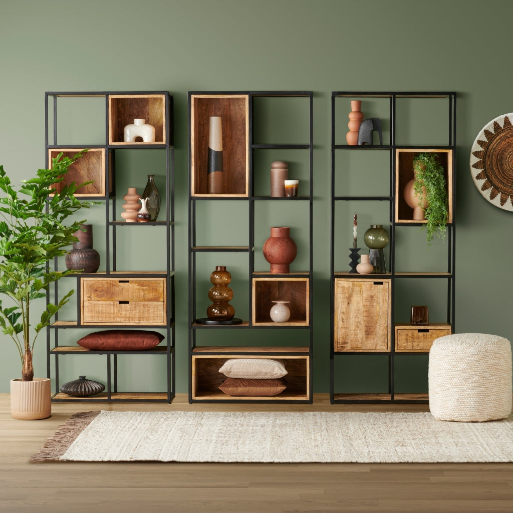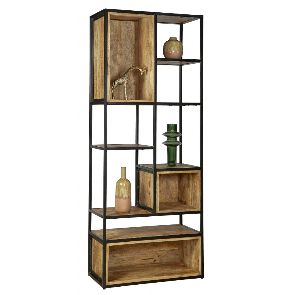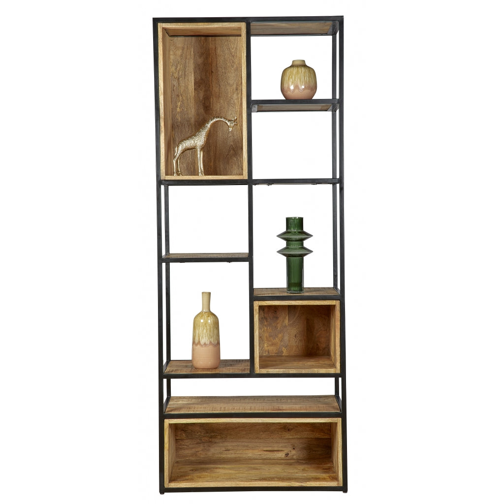 De Wandkast Bemmel is een eigentijdse kast die bestaat uit zowel open vakken als vakken gemaakt van mangohout. De vakken van mangohout hebben een gesloten achterkant, waardoor ze dienen als een decoratieve achtergrond voor de spullen die je erin plaatst. Deze wandkast heeft een slank formaat, waardoor het leuk is om het te combineren met een tweede kast om een ruime kast te creëren. Je kunt kiezen voor hetzelfde model of een variant ervan. Om de kast mooi te maken, kun je deze decoreren met verlichting, boeken en mooie woonaccessoires. Indeling: Deze uitvoering van de Bemmel wandkast heeft 9 open vakken in verschillende formaten, die op een speelse manier zijn geplaatst. Van deze vakken zijn er 3 volledig gemaakt van hout, met een gesloten houten achterkant. De andere vakken hebben houten planken. Belangrijke informatie: De Wandkast Bemmel heeft een breedte van 80 cm, een diepte van 40 cm en een hoogte van 200 cm. De kast is gemaakt van metaal met een zwarte poedercoating en heeft accenten van mangohout. Het hout is mat gelakt en heeft een warme naturel kleur. De kast wordt in gemonteerde staat geleverd.| Afmetingen | |