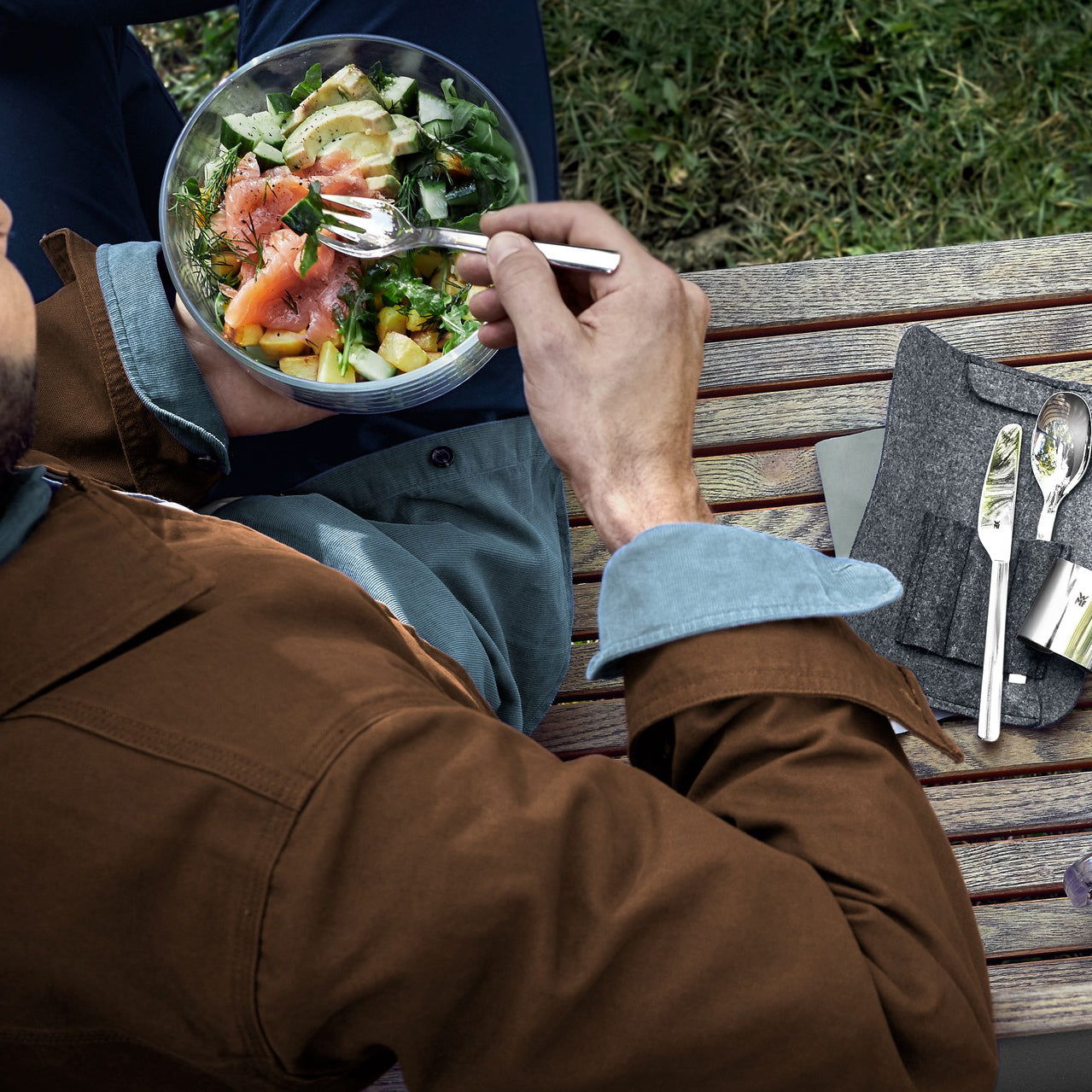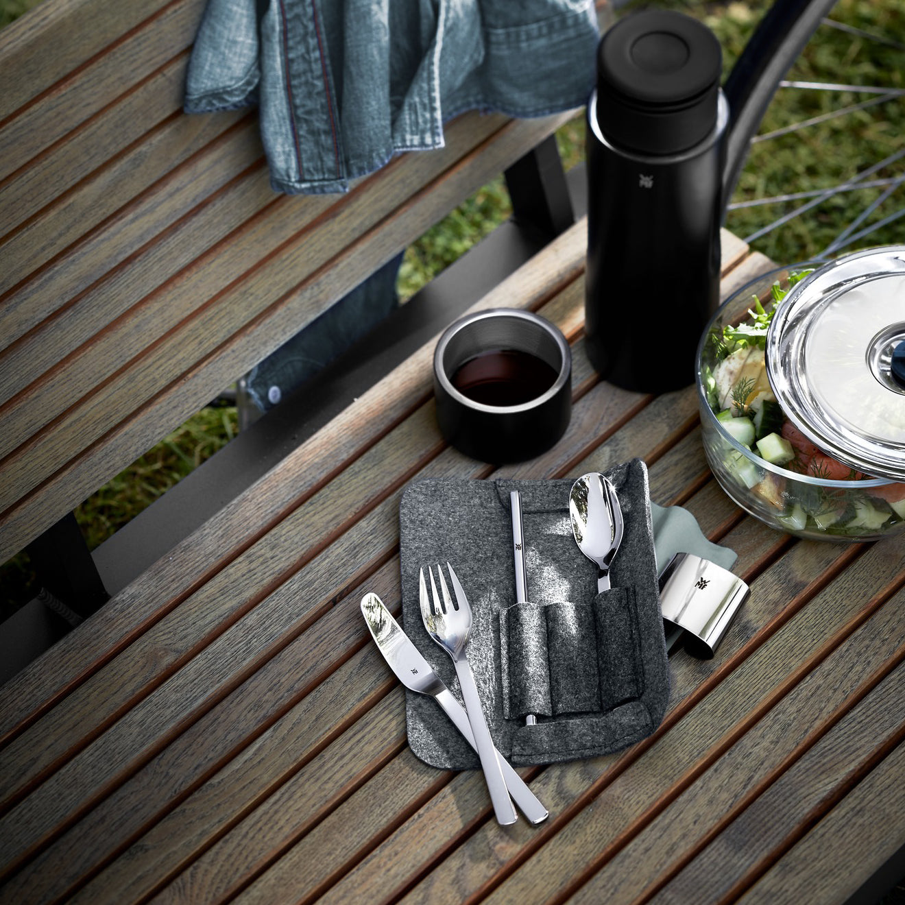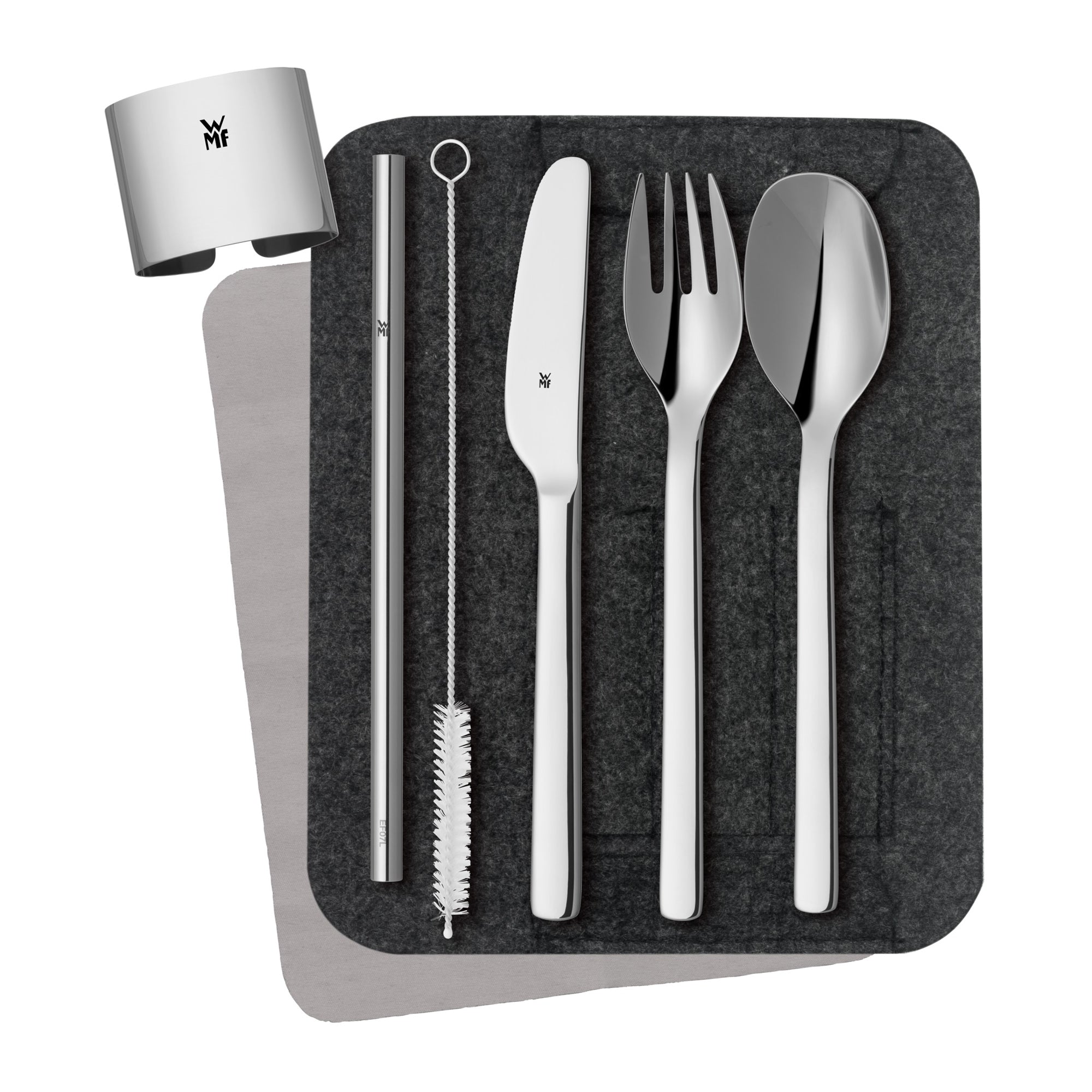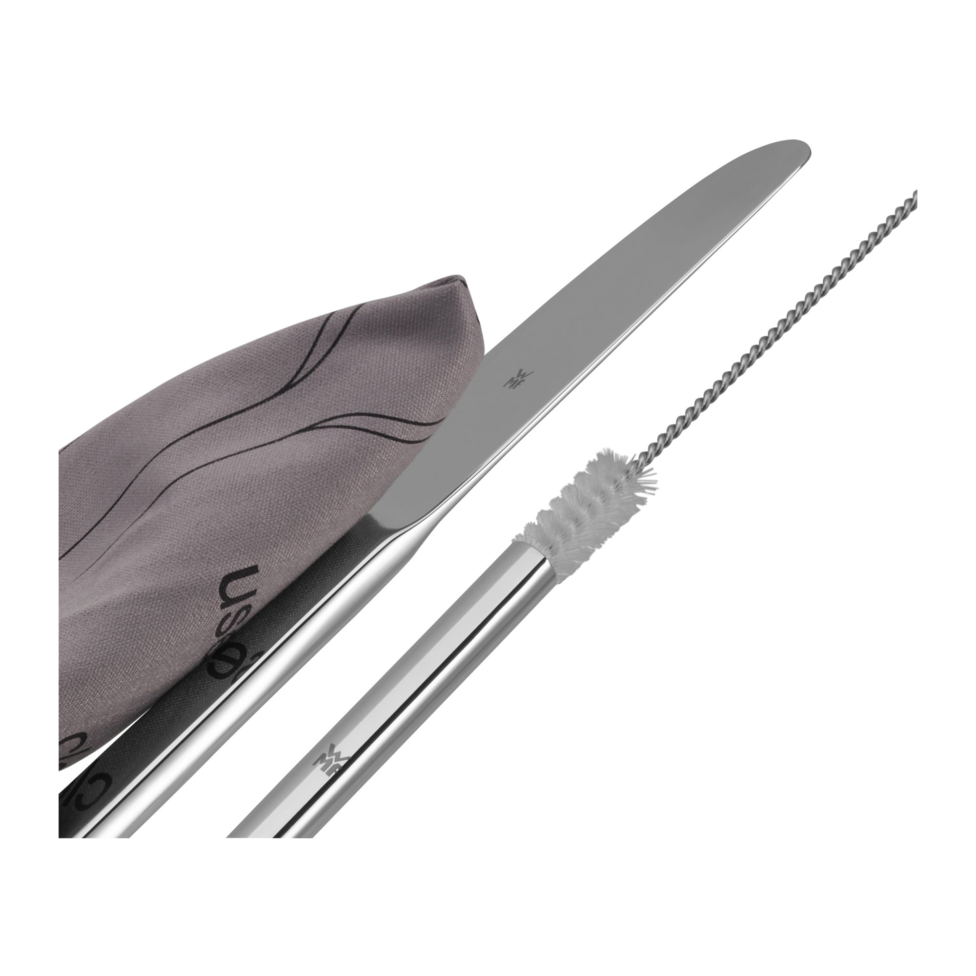 - 4-delige bestekset: mes, vork, lepel, drinkrietje en inclusief reinigingsborstel en doekje