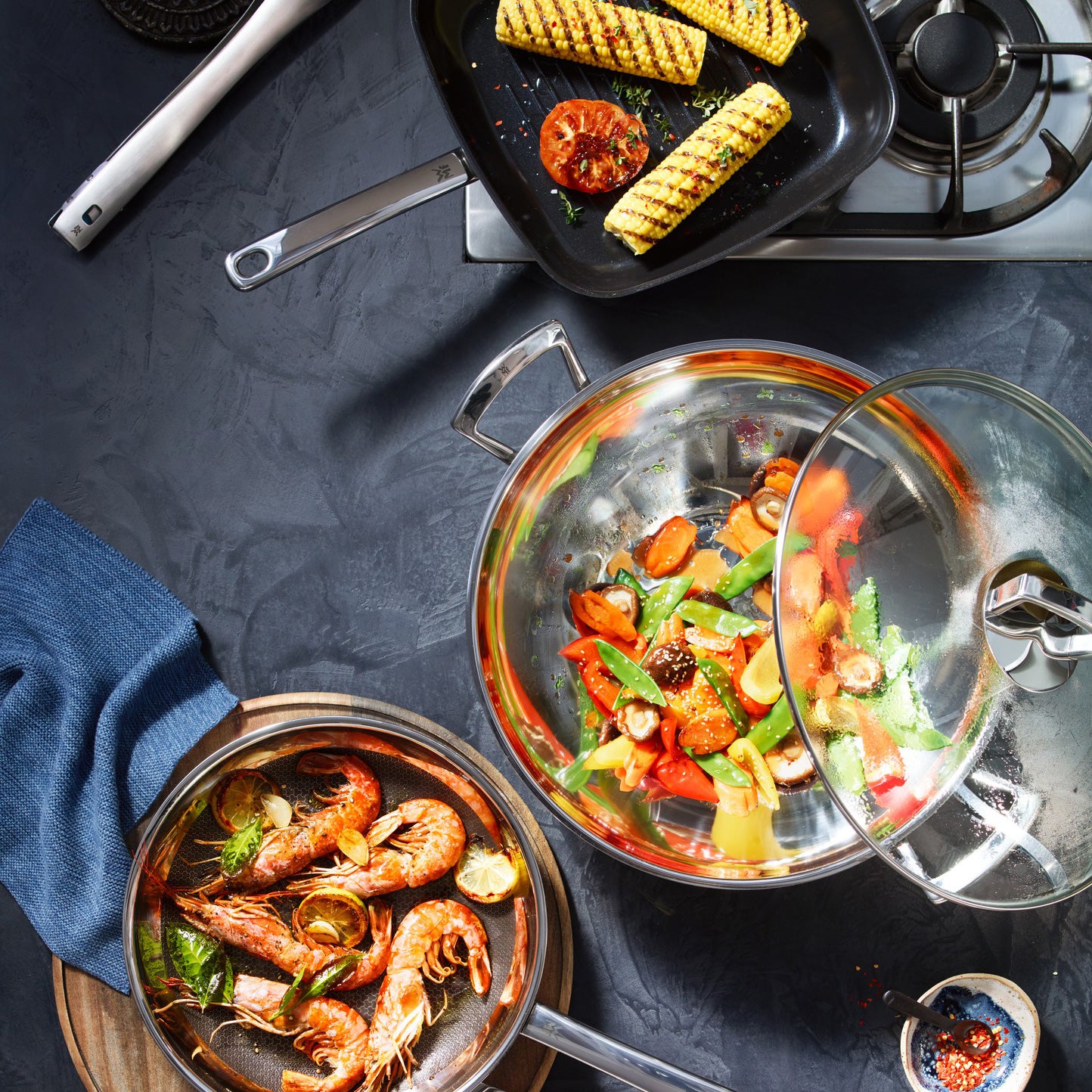 WMF Cromargan RVS Deze WMF wok is vervaardigd uit aluminium, chroom en het unieke Cromargan 18/10 roestvrij staal. Dankzij dit meerlaagse materiaal is de pan snel op temperatuur en heeft hij een optimale warmteverdeling. De buitenzijde van de pan is bekleed met chroomstaal, wat het design van de pan helemaal af maakt!
