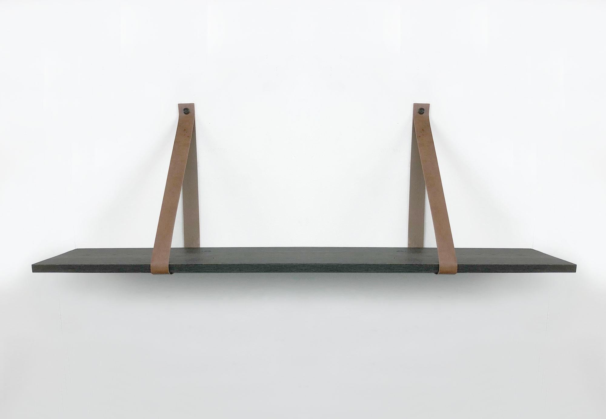 Woodbrothers 18mm wandplank recht zwart 75x20cm + leren riem cognac