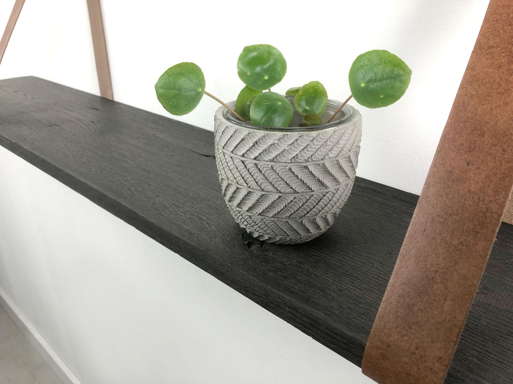 Woodbrothers 18mm wandplank recht zwart 90x20cm + leren riem cognac