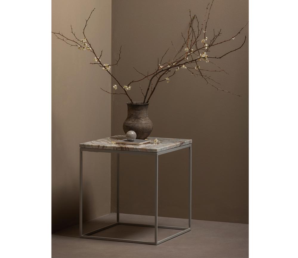 Materiaal Marmer is een kalkgesteente die zijn natuurlijke kleurnuances verkrijgt door een lange blootstelling aan temperatuurverschillen en hoge druk tijdens het ontstaan van gebergten. Dit proces zorgt ervoor dat elk marmeren item zijn eigen unieke tekening heeft. Naast de karakteristieke tekeningen, kunnen witte vlekjes of puntjes ook voorkomen in de steen. Voorkom vlekken door vocht eenvoudig door het gebruik van onderzetters. Afmetingen - Hoogte: 45 cm - Breedte: 40 cm - Dikte tafelblad: 2 cm - Dikte frame: 2x2 cm - Maximale draagkracht: 15 kg - Gewicht: 10 kg Onderhoud Het is belangrijk om deze poreuze natuursteen goed te onderhouden. Gebruik een zachte doek, lauwwarm water en een speciaal reinigingsmiddel voor natuursteen om het marmer regelmatig te reinigen. Vochtige vlekken kunnen in de steen trekken, dus reinig deze vlot met een zachte doek en natuurlijk schoonmaakmiddel. Marmer is vrij zacht en krasgevoelig, gebruik dus geen schuurspons of harde doeken voor het reinigen van het marmeren item. Levering De bijzettafel wordt in één pakket geleverd. Plaats voor het beschermen van harde vloeren viltglijders aan de onderzijde, dit voorkomt beschadigingen.