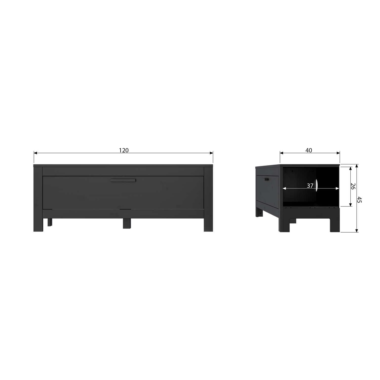 Tv-meubel Bonk heeft zijn naam niet voor niets gekregen. Dit robuuste meubelstuk heeft een stoere uitstraling die goed past bij de huidige interieurtrends. Bonk is gemaakt van massief grenen hout met een matzwarte aflak. Achter de brede kastdeur is er een zee aan ruimte beschikbaar voor apparatuur en de spullen die je liever uit het zicht zet.