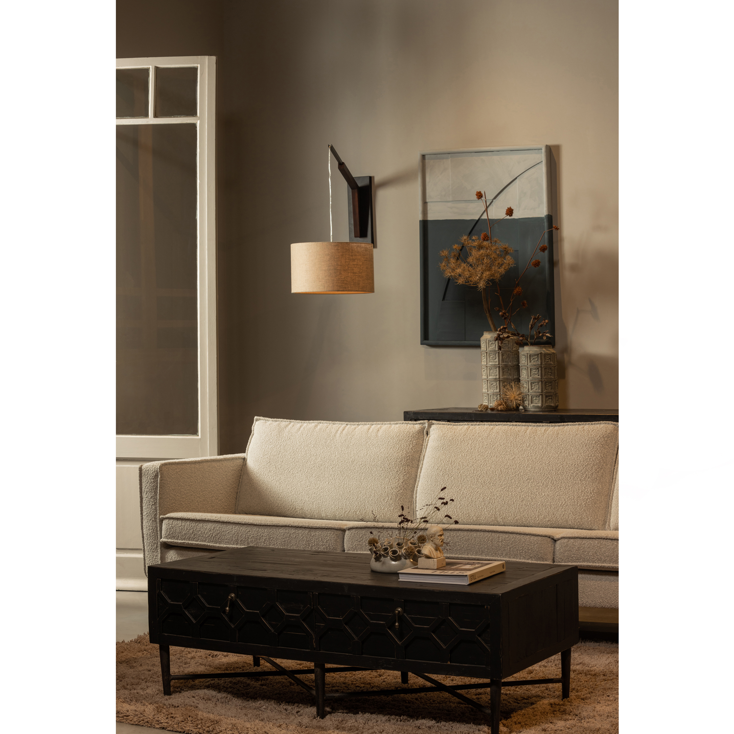 De wendbare muurlamp is opgebouwd uit een combinatie van walnootkleurig hout en matzwart metaal. De lampenkap is gevormd uit matwit kunststof, bekleed in een zandkleurige linnenlook.