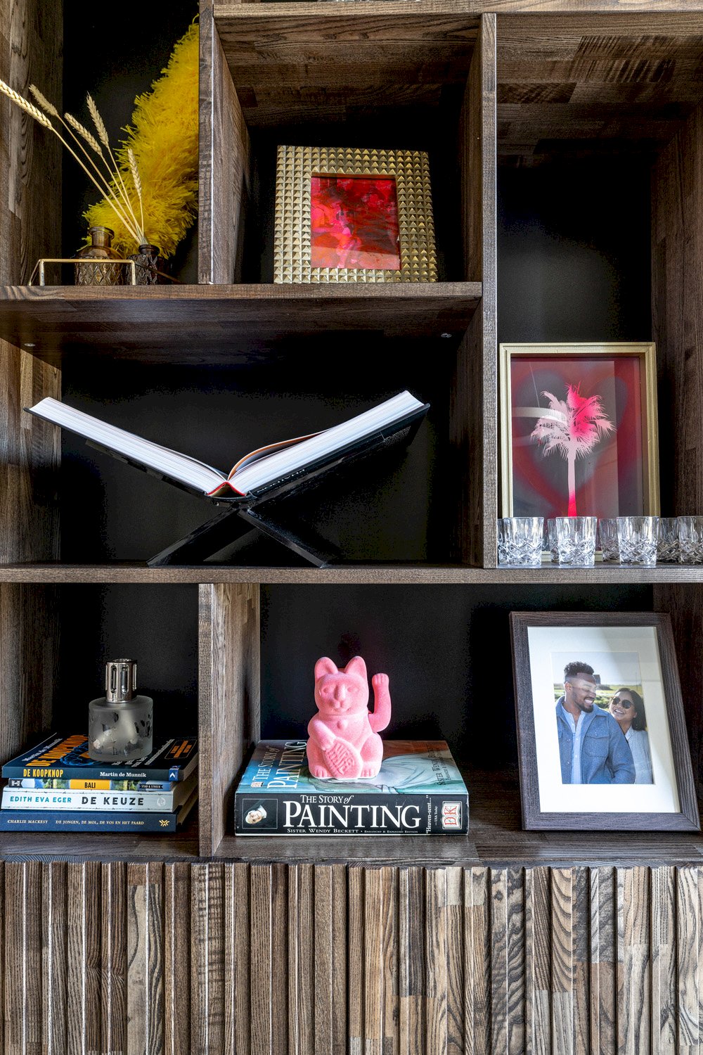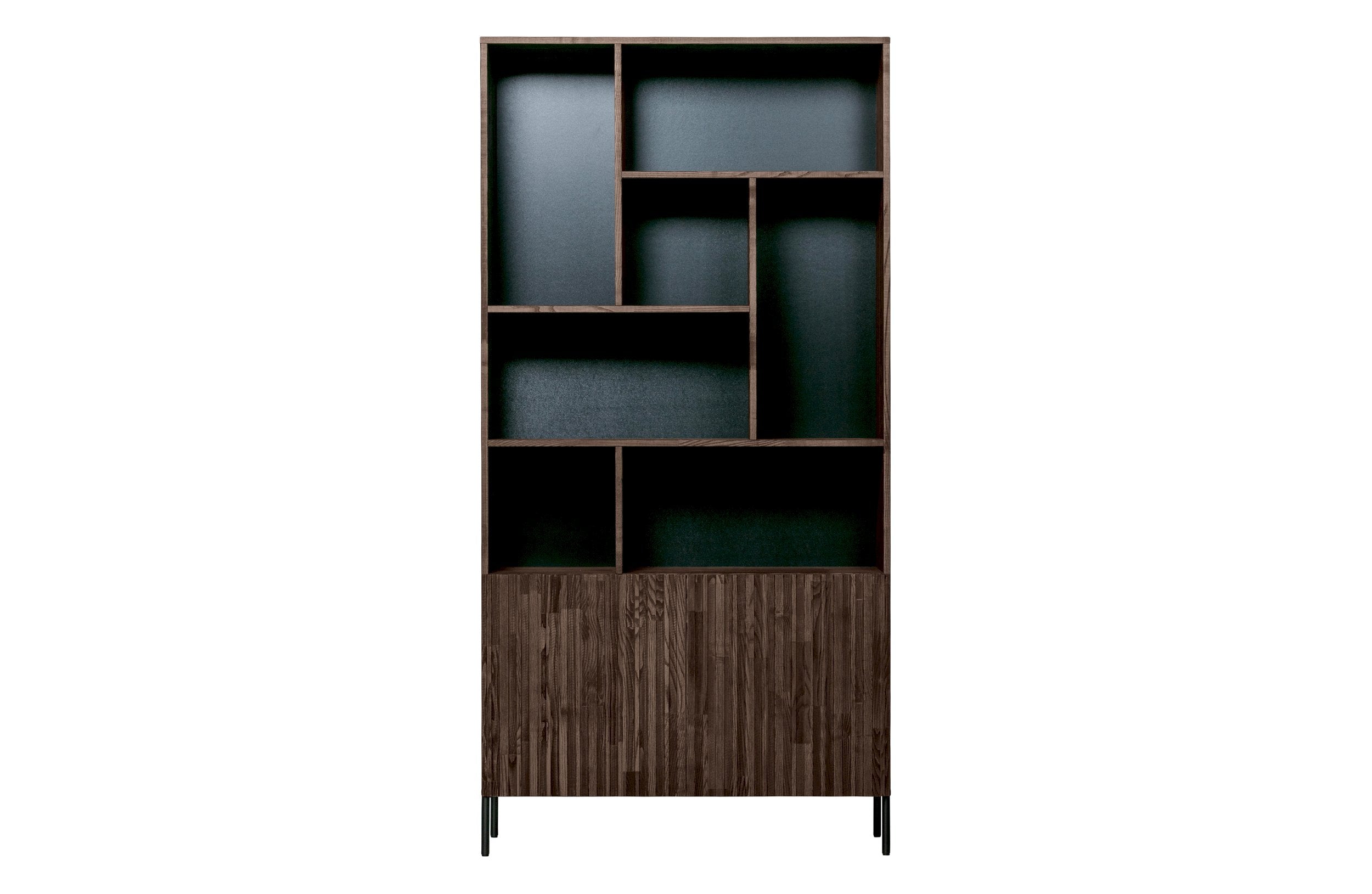 Deze hoge kast met speelse vakken heeft als basis de uitvoering FSC-gecertificeerd essenhout en essenhouten deuren gecombineerd met een zwart metalen onderstel (hoogte van 15 cm). Het interieur van de kast is gelamineerd spaanplaat in de kleur zwart. Essenhout is een iets zachte houtsoort met een strakke, rechte nerf. De rechte nerftekening zorgt ervoor dat essenhout goed gebogen kan worden, dit maakt essenhout zeer geschikt voor de meubelbranche. Bewerkt essenhout is sterk en slijtvast, maar onbehandeld essenhout kan veel werking vertonen en snel vergelen. Geschuurd essenhout zorgt voor een nette, gladde uitstraling. Geborsteld essen heeft meer karakter en bandgezaagd essenhout heeft een zeer robuuste en ruwe look.