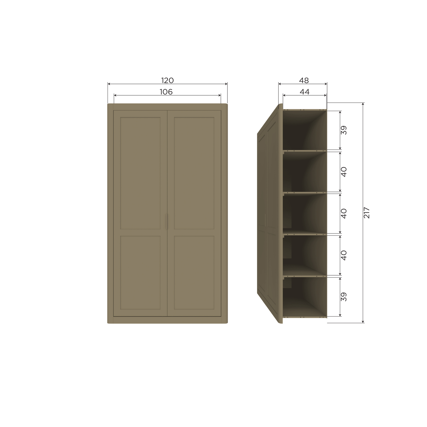 - Hoogte: 217 cm - Breedte: 120 cm - Diepte: 48 cm - Hoogte kastdeuren: 203 cm - Breedte kastdeuren: 53 cm - Dikte plank: 4 cm - Breedte binnenkant kast: 116 cm - Hoogte binnenkant kast: 203 cm - Diepte binnenkant kast: 43 cm - Gewicht: 64 kg
