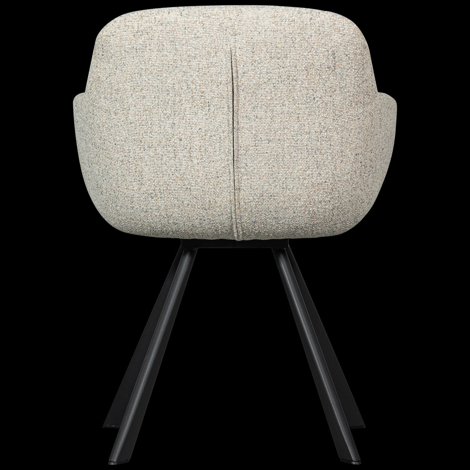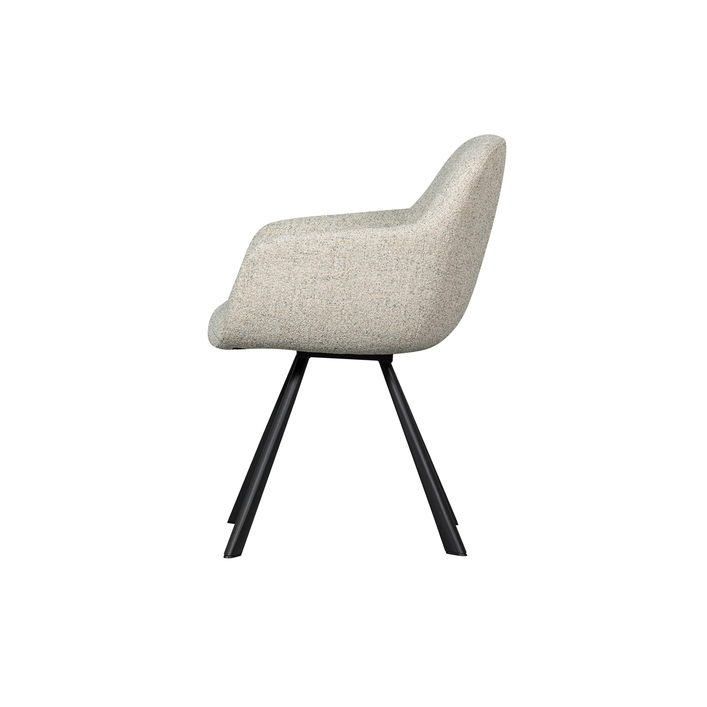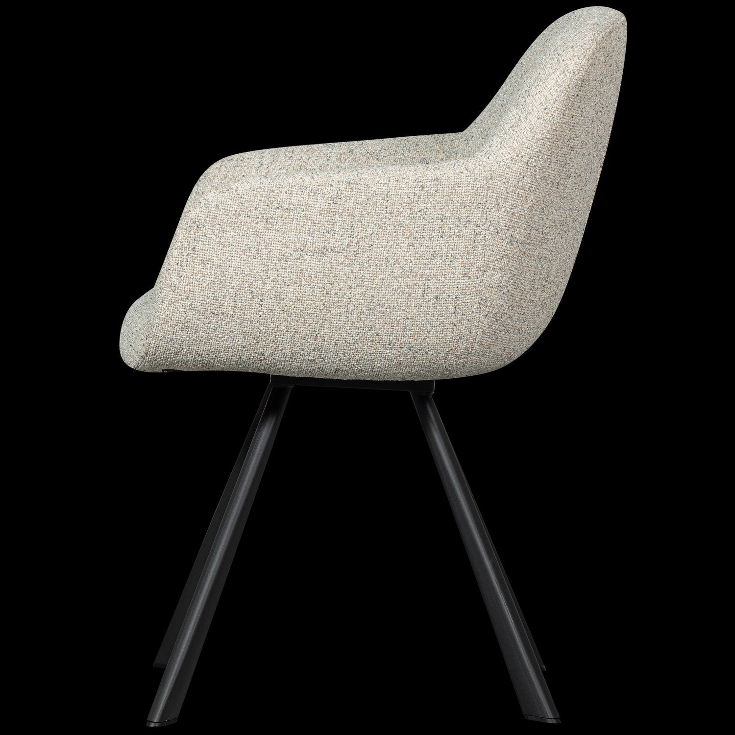 De Juno eetkamerstoel heeft metalen poten met een matzwarte poedercoating. De zitting is gevormd uit een stalen frame en multiplex, bedekt met een polyurethaan schuim. De zitting is bekleed met een geweven stof. De Helen geweven stof is opgebouwd uit 100% polyester, wat de stof een zachte grip geeft. De dicht geweven stof krijgt een extra dimensie door de opvallende kleurnuances. Deze kleurschakeringen zorgen voor een unieke uitstraling. De Helen staat bekend om zijn functionaliteit, stevigheid en samenstelling uit vezels van verschillende kleuren.