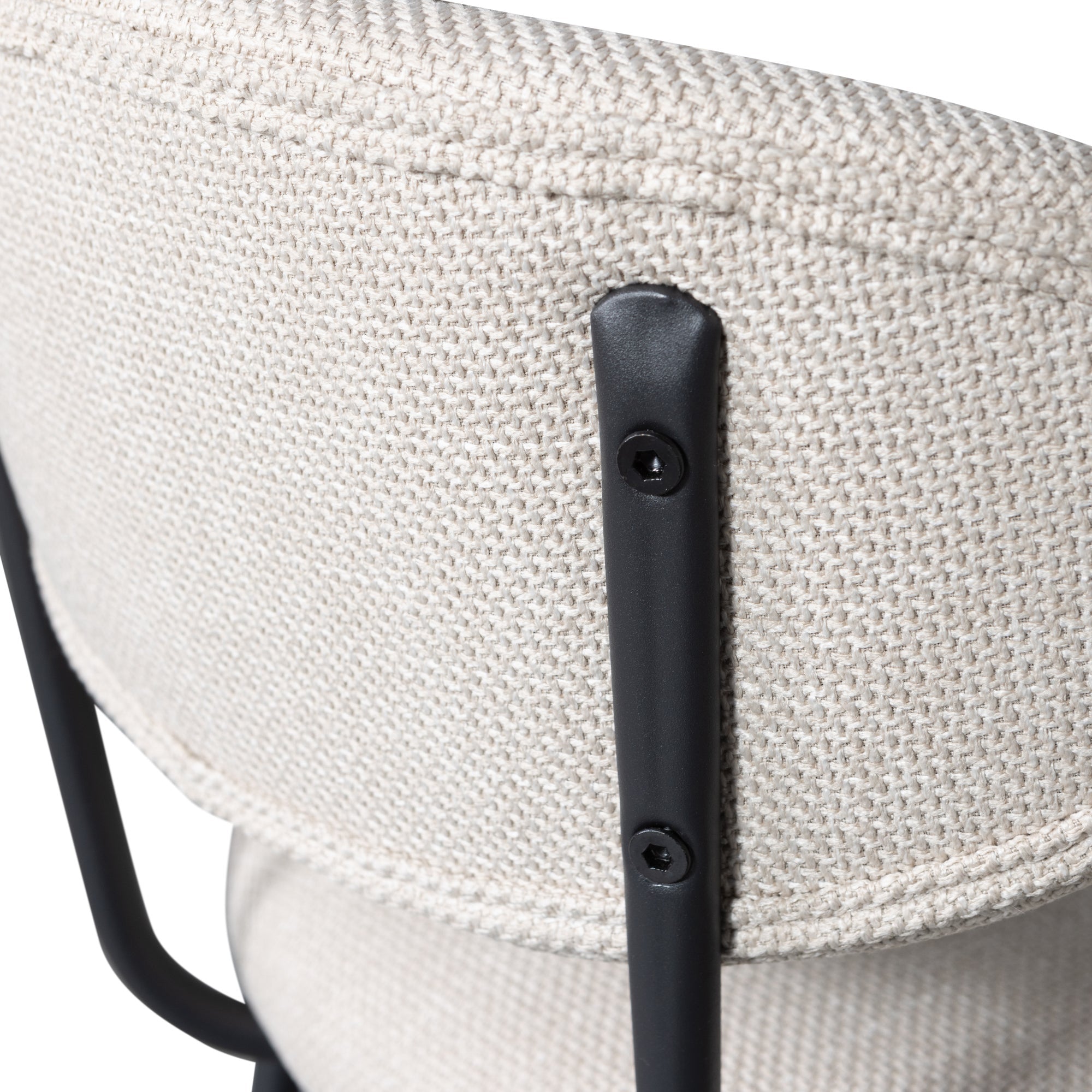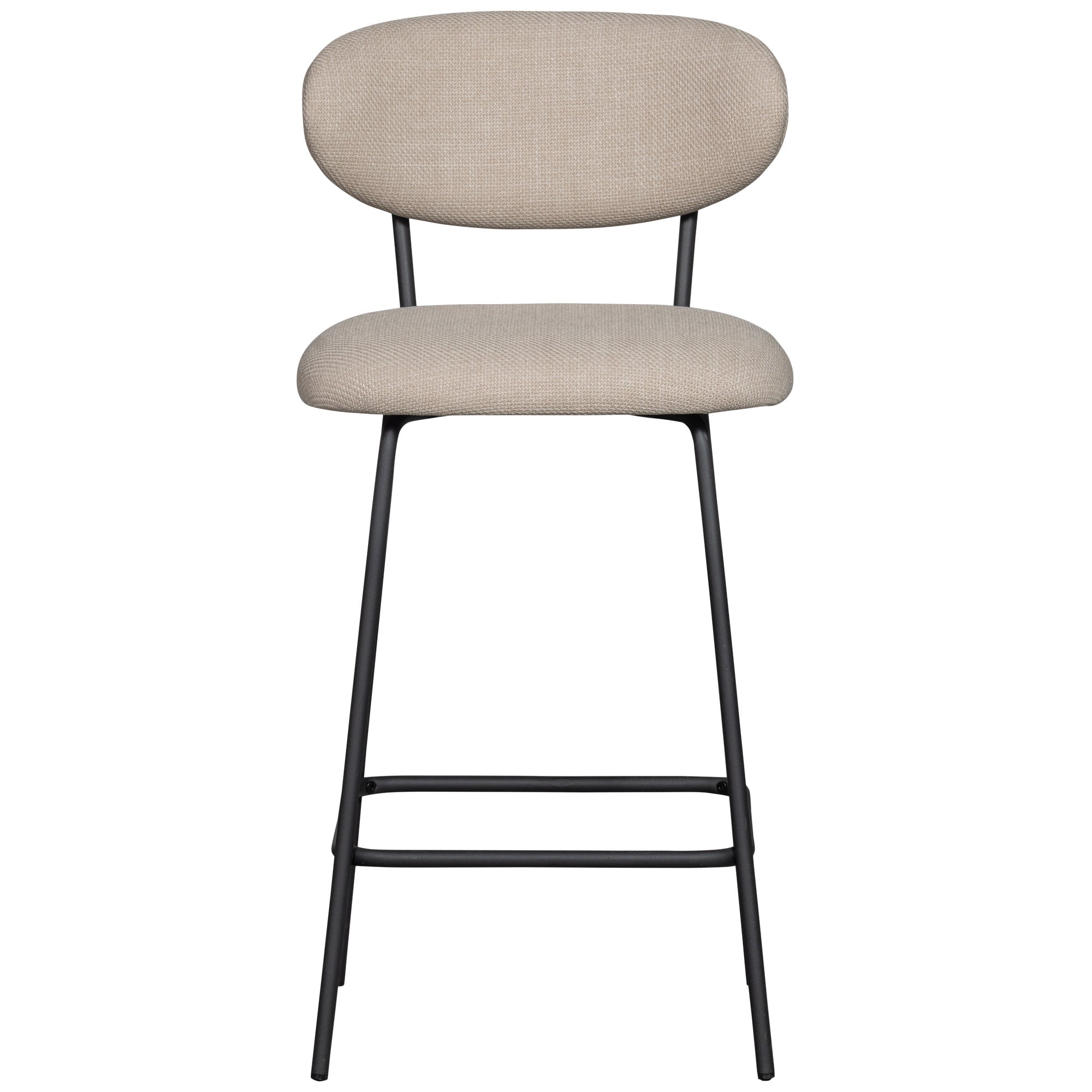 De Kjeld barstoel uit de collectie van het Nederlandse merk WOOOD kenmerkt zich als stijlvol en eenvoudig. Het slanke metalen frame in zwarte kleur vormt een modern contrast met de dikke geweven stof van de zitting. De bolling van de rugleuning en de geweven stof zorgen voor een comfortabele zitervaring. De Kjeld is ook verkrijgbaar als eetkamerstoel. Materiaal