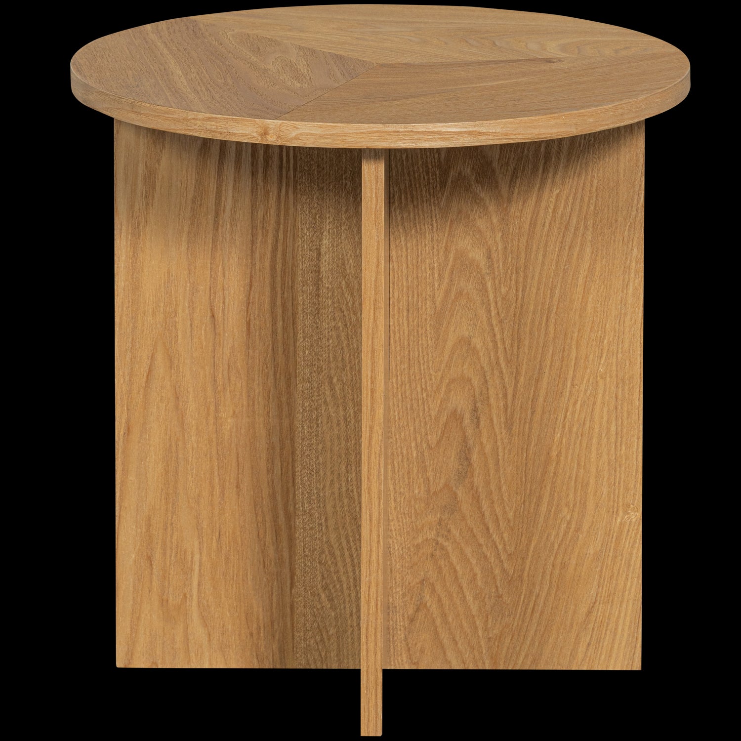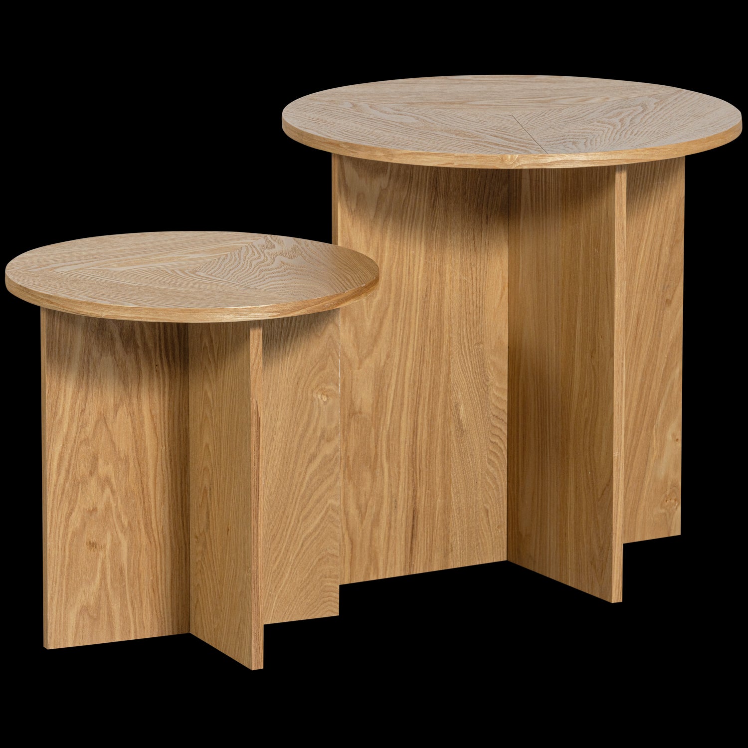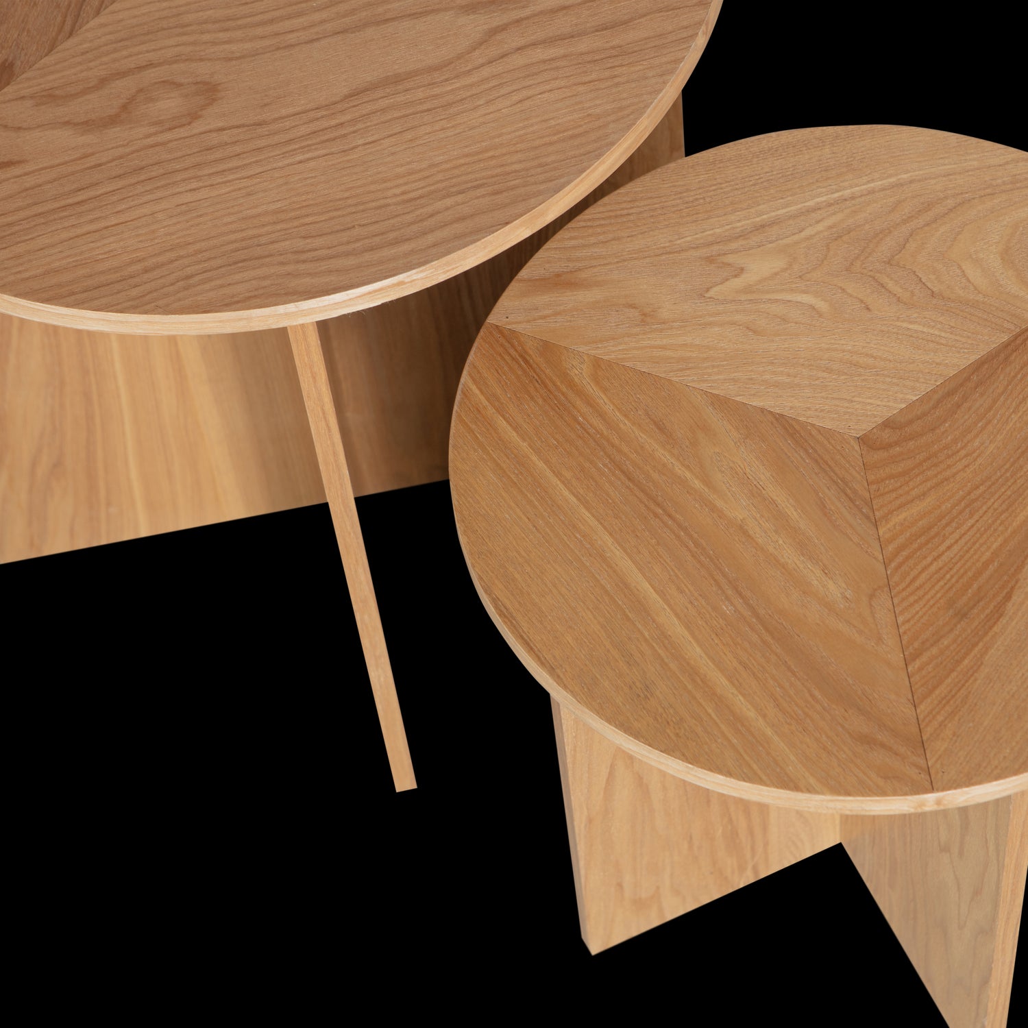 De Lina bijzettafelset van twee stuks, uit de collectie van het Nederlandse interieurmerk WOOOD, is een opvallend duo met een stijlvol potenframe. De bijzettafels zijn vervaardigd uit geperst plaatmateriaal met een warmbruine tint.