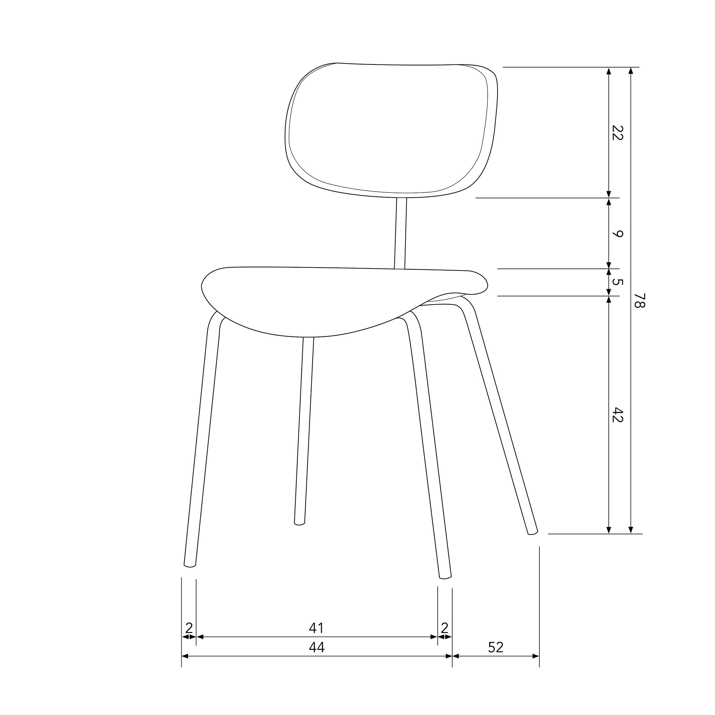 Afmetingen - Hoogte: 78 cm - Breedte: 44 cm - Diepte: 52 cm - Zithoogte: 47 cm - Zitbreedte: 45 cm - Zitdiepte: 43 cm - Rugleuninghoogte: 78/31 (9+22)cm - Rugleuningbreedte: 36 cm - Rugleuningdikte: 3,5 cm - Poothoogte: 42 cm - Pootdikte: ø2 cm - Afstand tussen voorpoten: 41 cm - Afstand tussen voor- en achterpoot: 43 cm - Draaggewicht: 90 kg - Gewicht: 11 kg