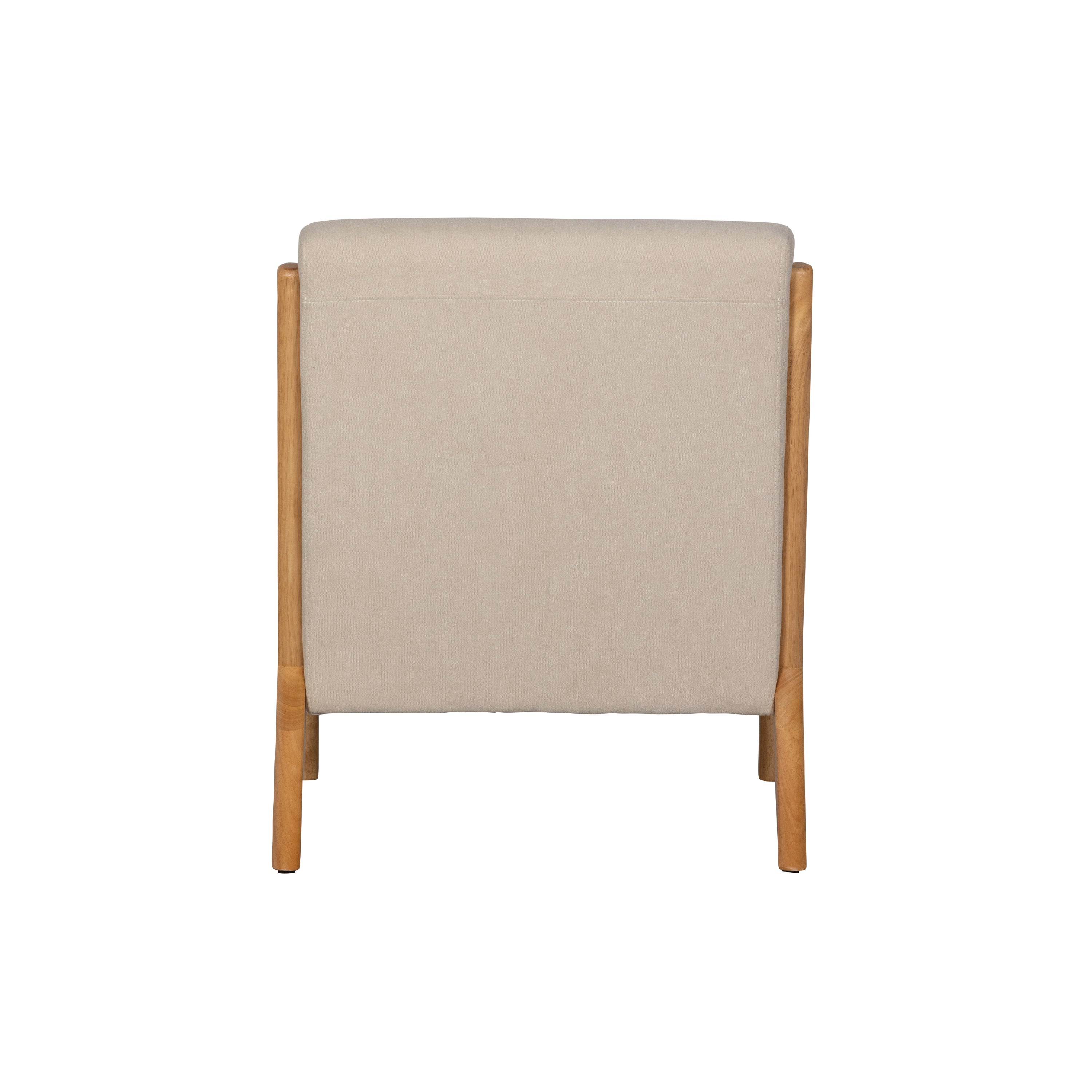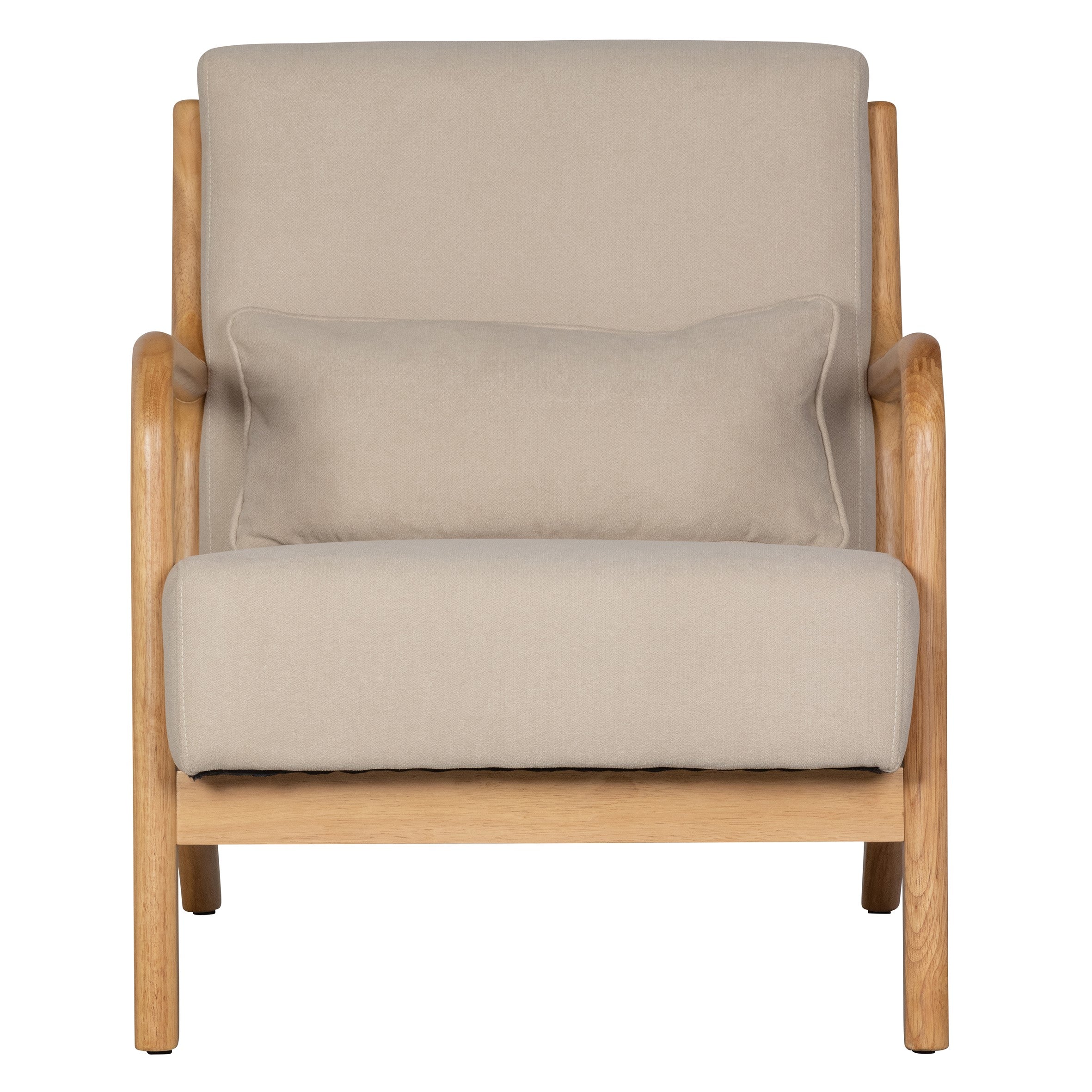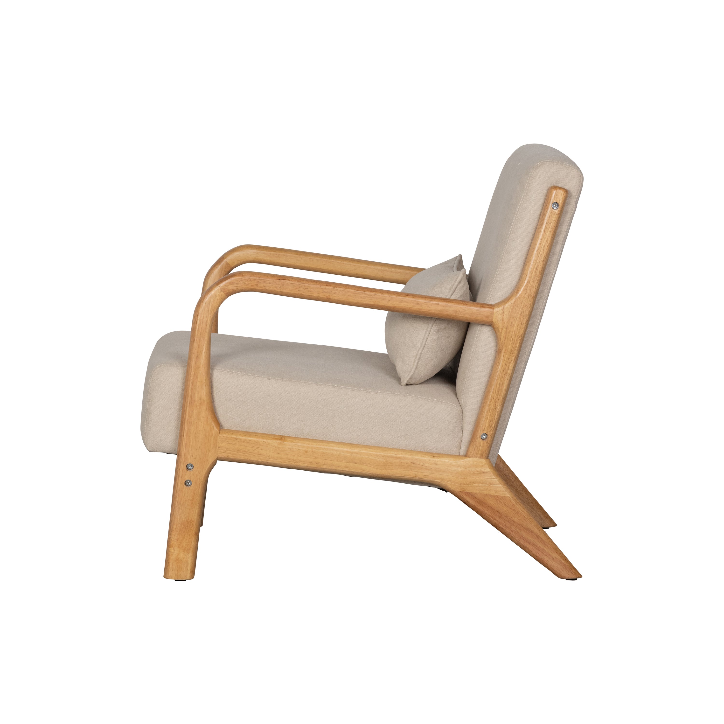 Materiaal Fauteuil Mark is gestoffeerd met een geweven stof in de kleur naturel. De stof voelt zacht aan, is van een zware kwaliteit en is geschikt voor intensief gebruik. De stof is gemaakt van 100% polyester en heeft een Martindale van 20.000. De constructie van Mark is opgebouwd uit multiplex. De zitting bevat een normale schuimlaag van 24kg/m3. De rugleuning bevat een normale schuimlaag van 18kg/m3. Het losse rugkussentje is gevuld met een vulmateriaal van katoen. Het frame van de Mark fauteuil is gevormd uit Chinees rubberhout.