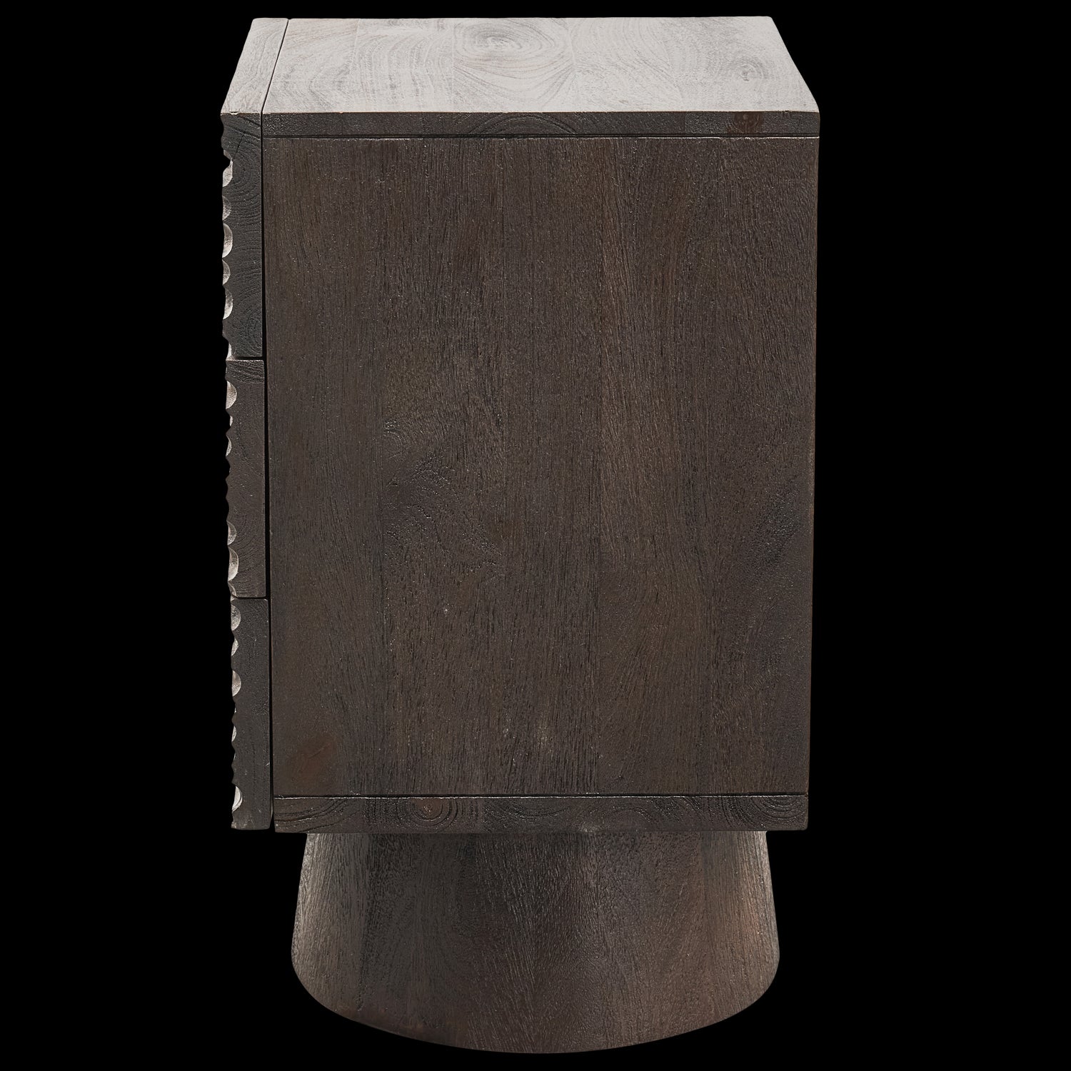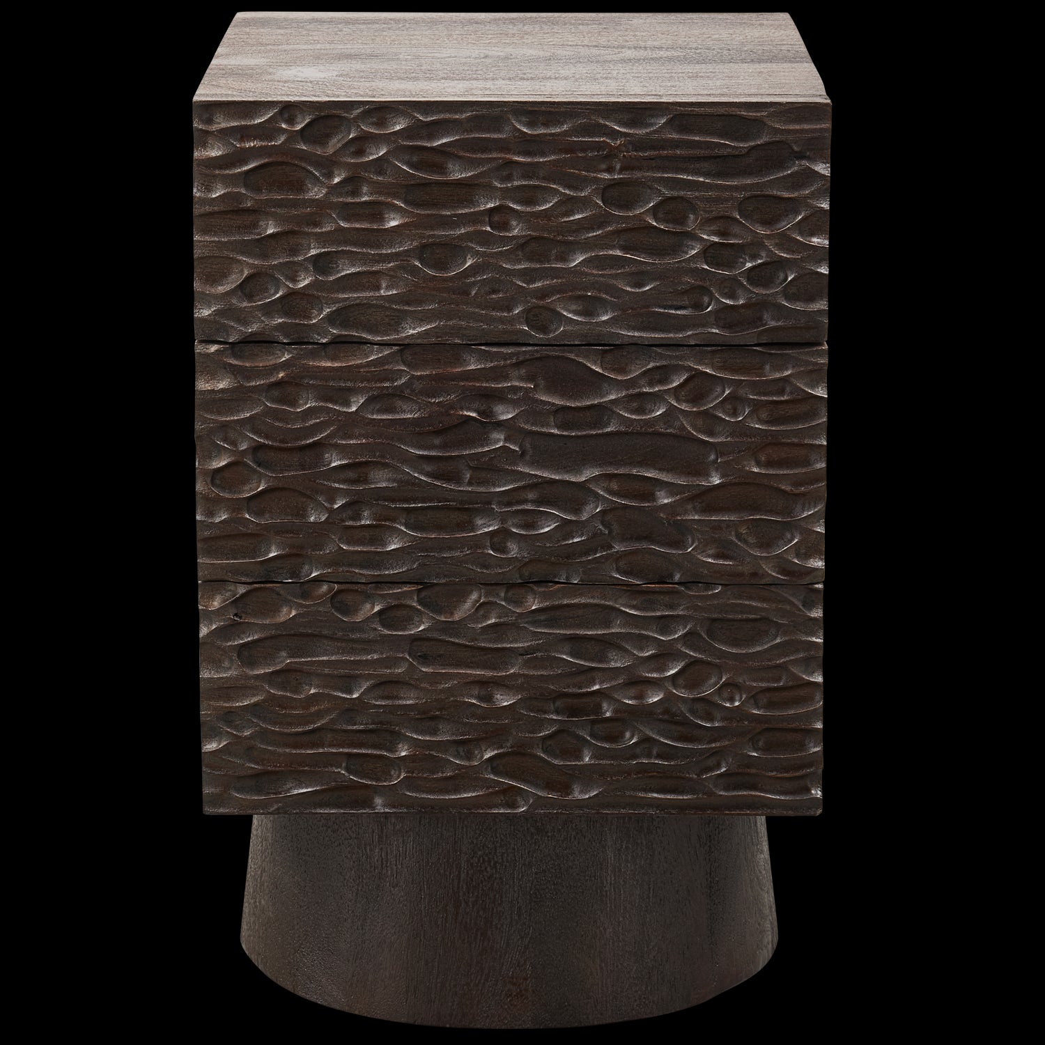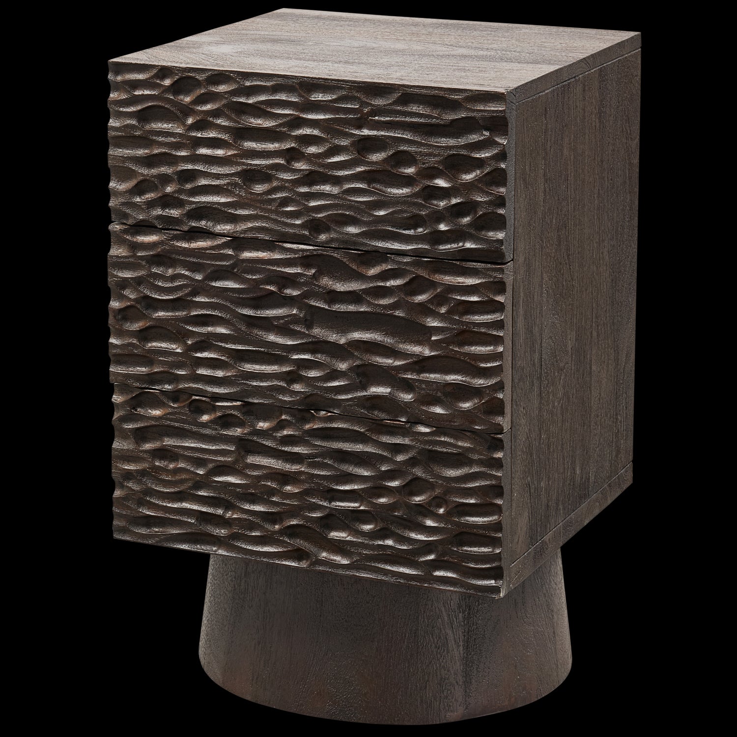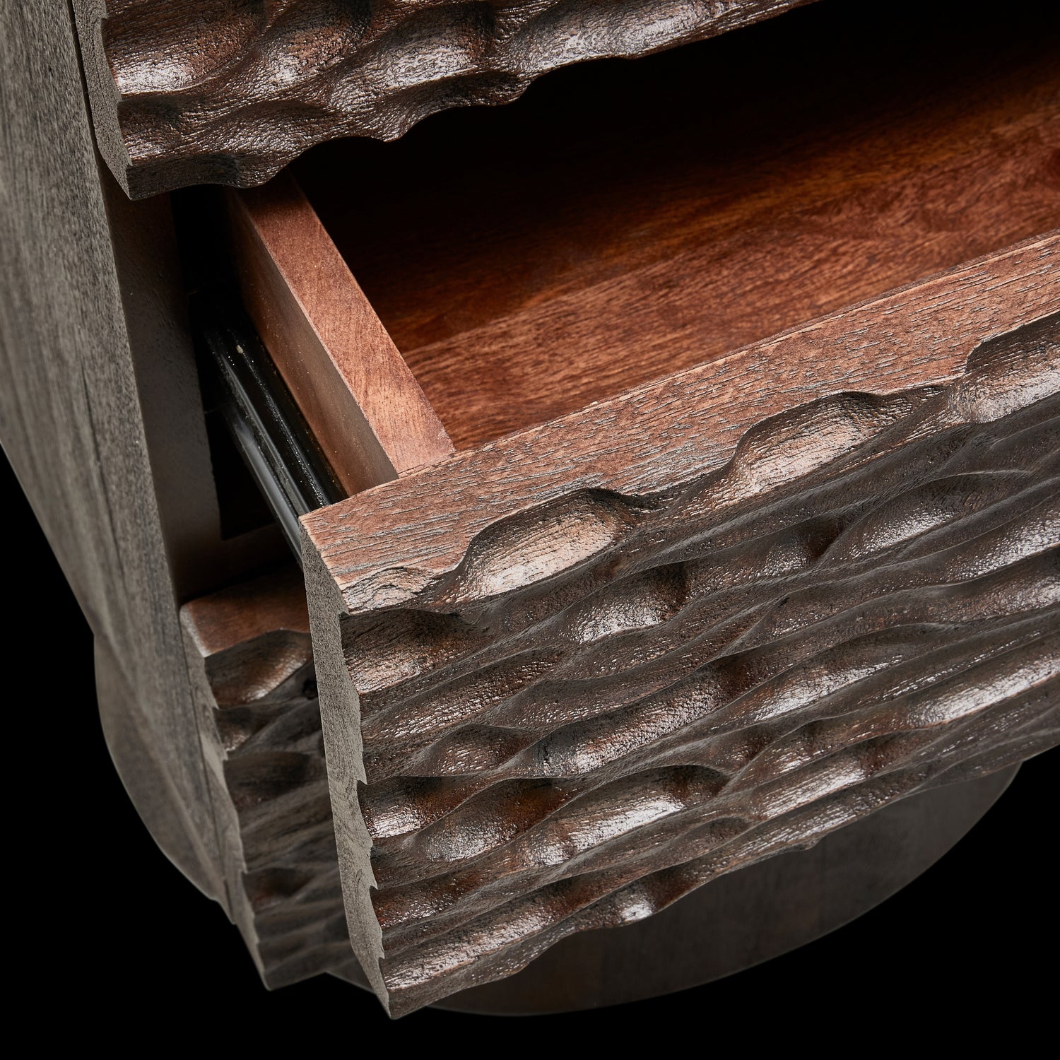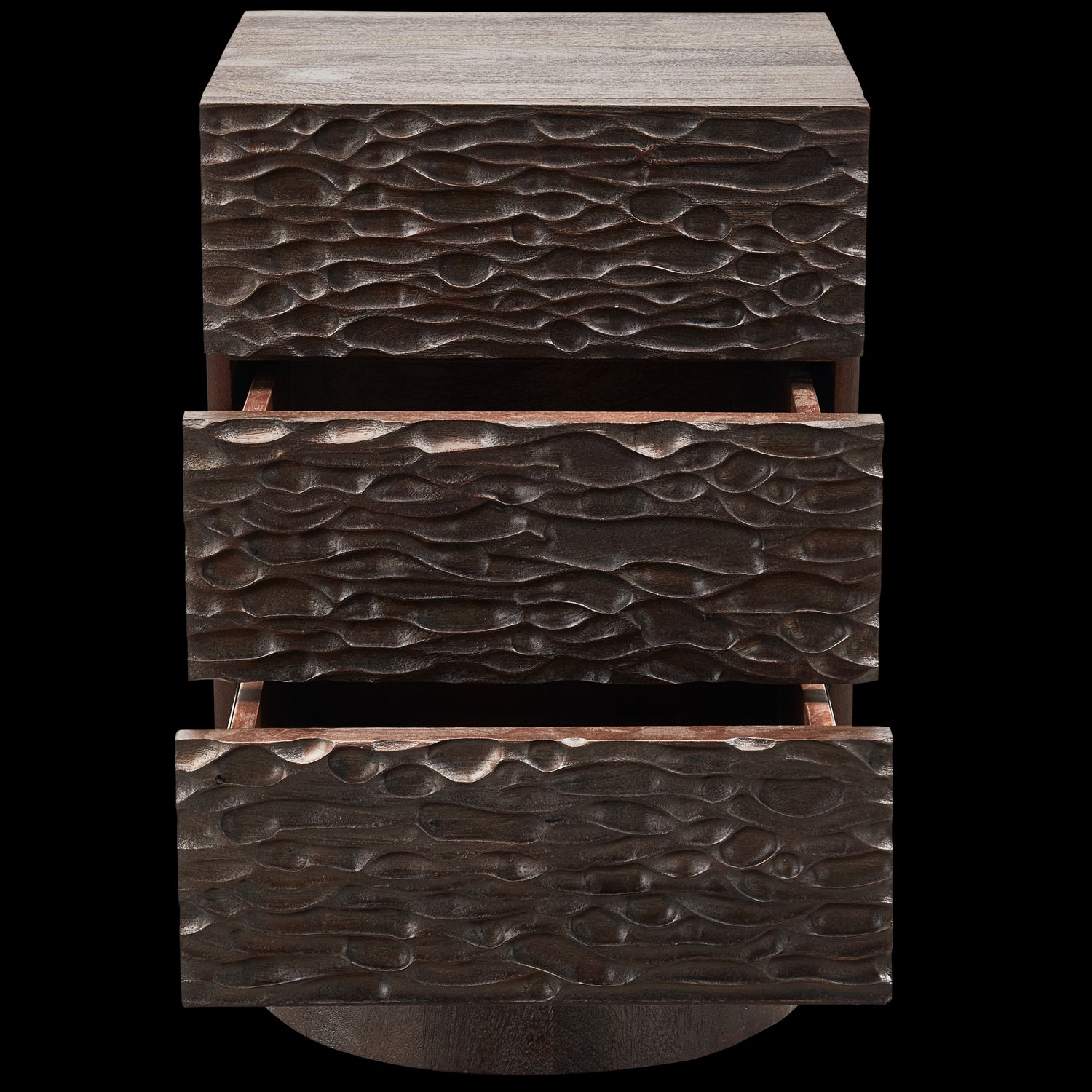 Speels, warm en efficiënt: dat zijn de kenmerken van het Crumble nachtkastje uit de collectie van het Nederlandse interieurmerk WOOOD. Het nachtkastje krijgt een authentieke uitstraling door de speelse structuur en de brede poten. Bovendien is er voldoende ruimte om accessoires te plaatsen op het meubel of om spullen op te bergen in de drie lades.