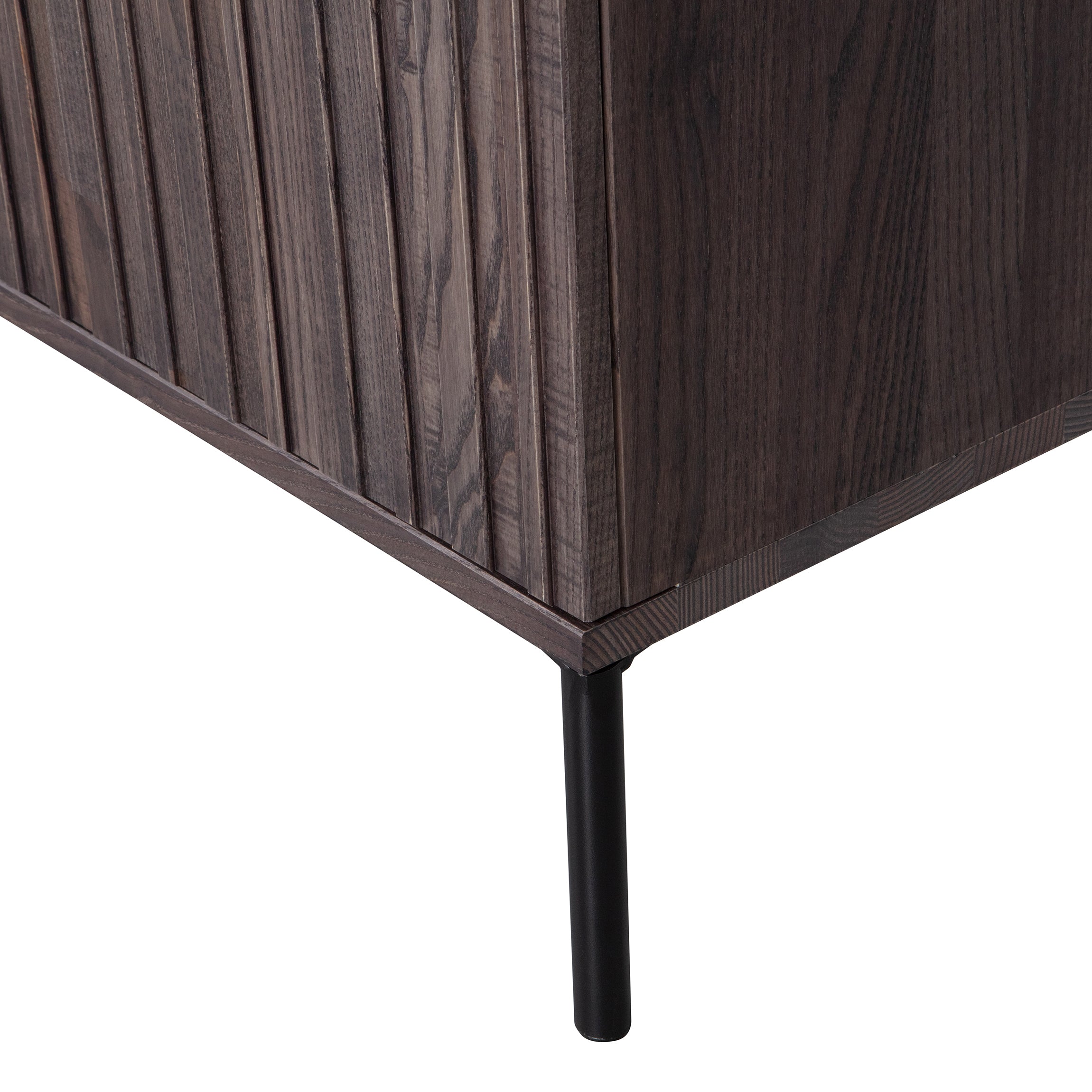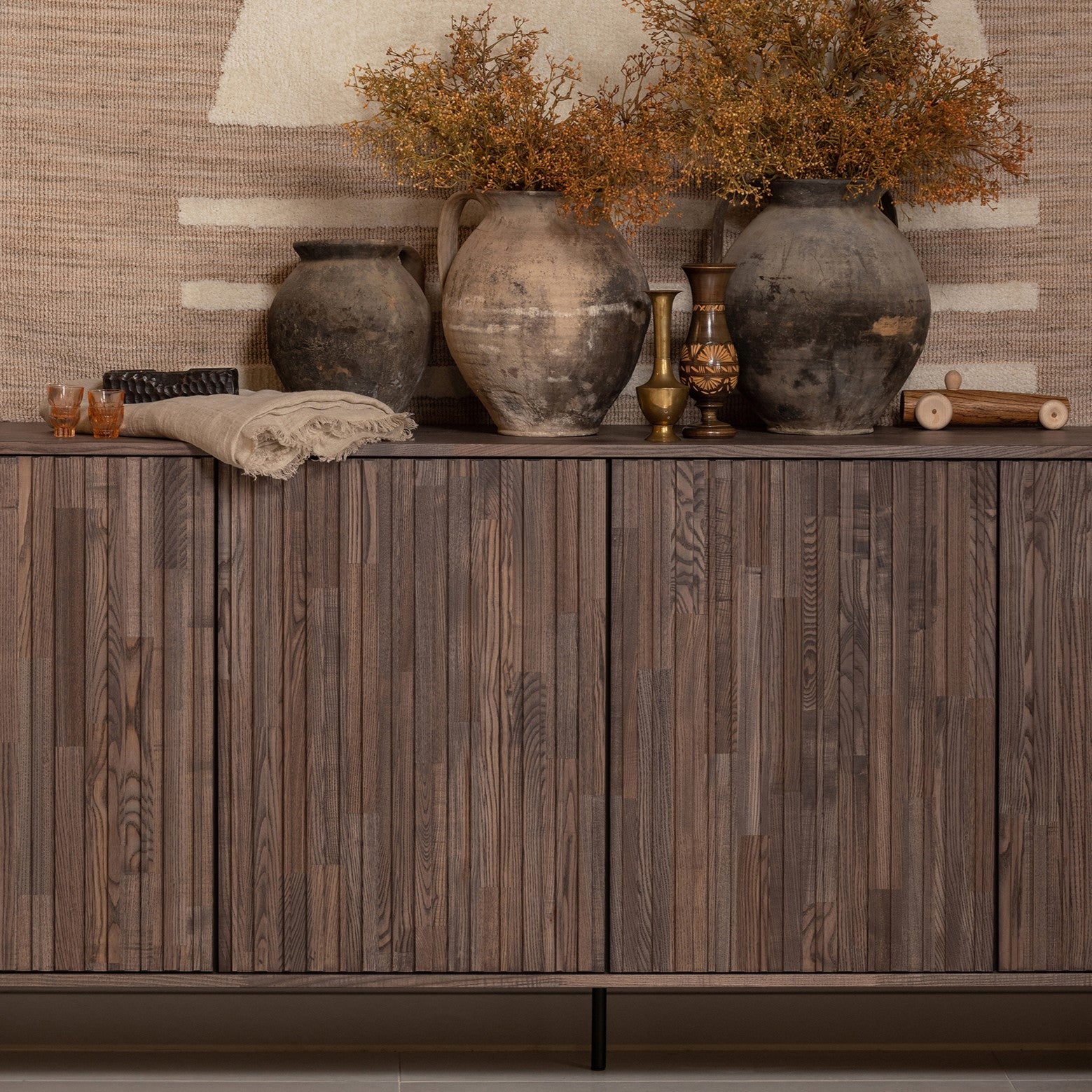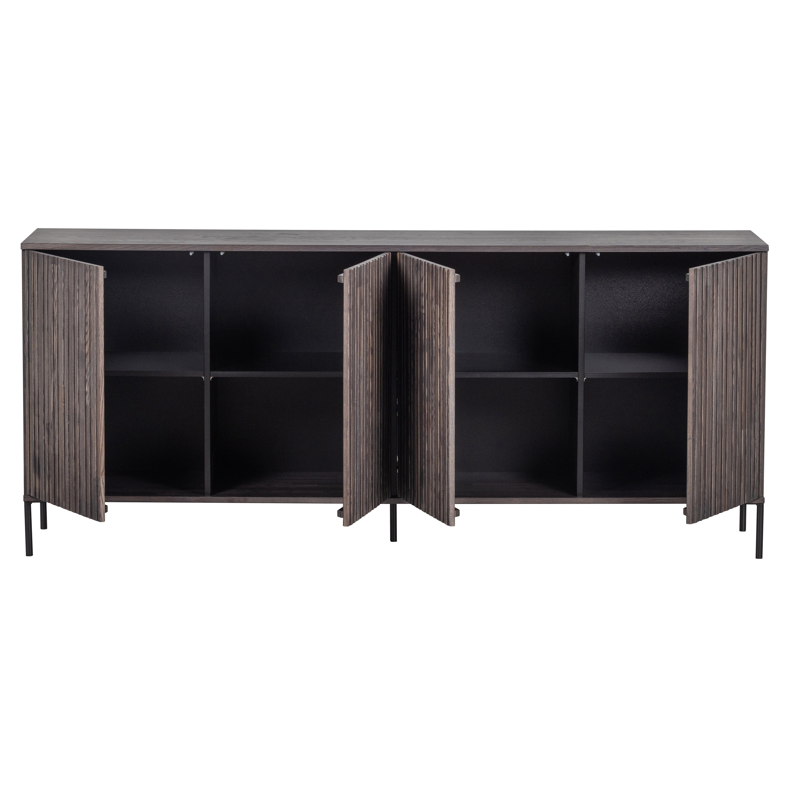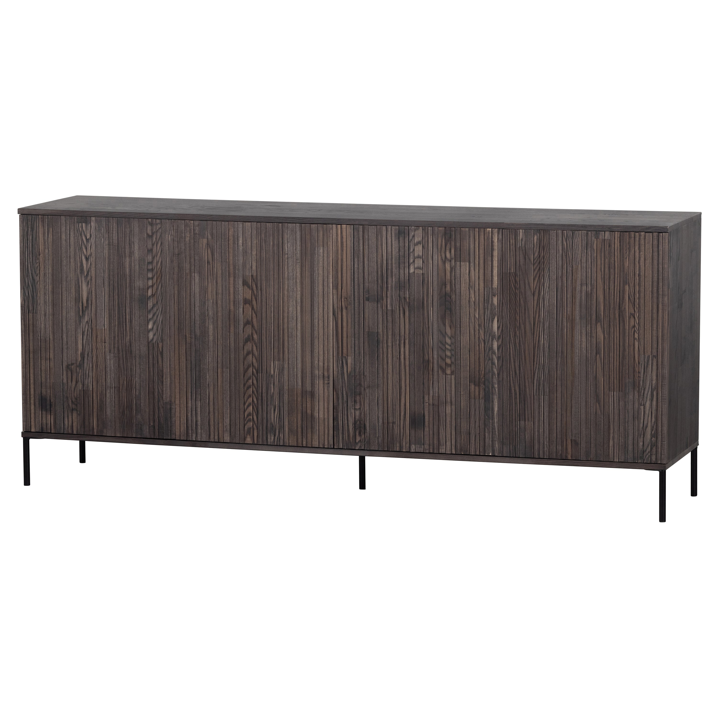 Stijlvol en praktisch De bekende Gravure-serie van WOOOD is terug in een vernieuwde, royale uitvoering. Dit New Gravure dressoir van 200 cm breed heeft vier greeploze deuren met een geluidloos push-to-open systeem en een strakke, moderne look dankzij het diepe essenhout fineer in espresso-kleur. Achter de deuren vind je volop opbergruimte, verdeeld over vakken met uitneembare legplanken. Ideaal voor servies, woonaccessoires of papierwerk. De kast combineert design en functionaliteit moeiteloos.