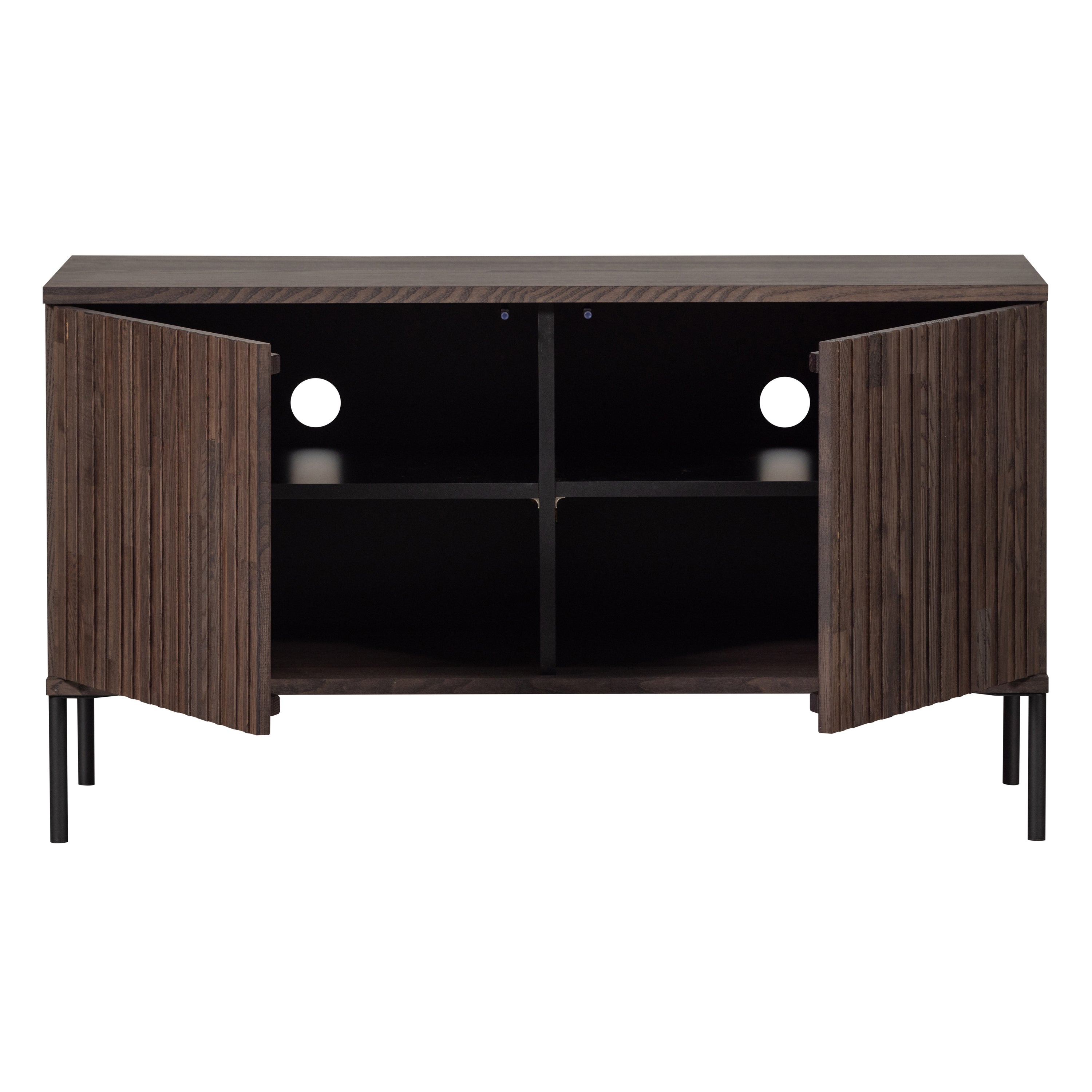 Design met slimme opbergruimte Achter de twee greeploze deuren – voorzien van een geluidloos push-to-open systeem – vind je zes vakken met ruimte voor media-apparatuur, kabels en meer. Een slimme kabeluitsparing aan de achterzijde maakt het aansluiten van apparatuur eenvoudig en netjes.