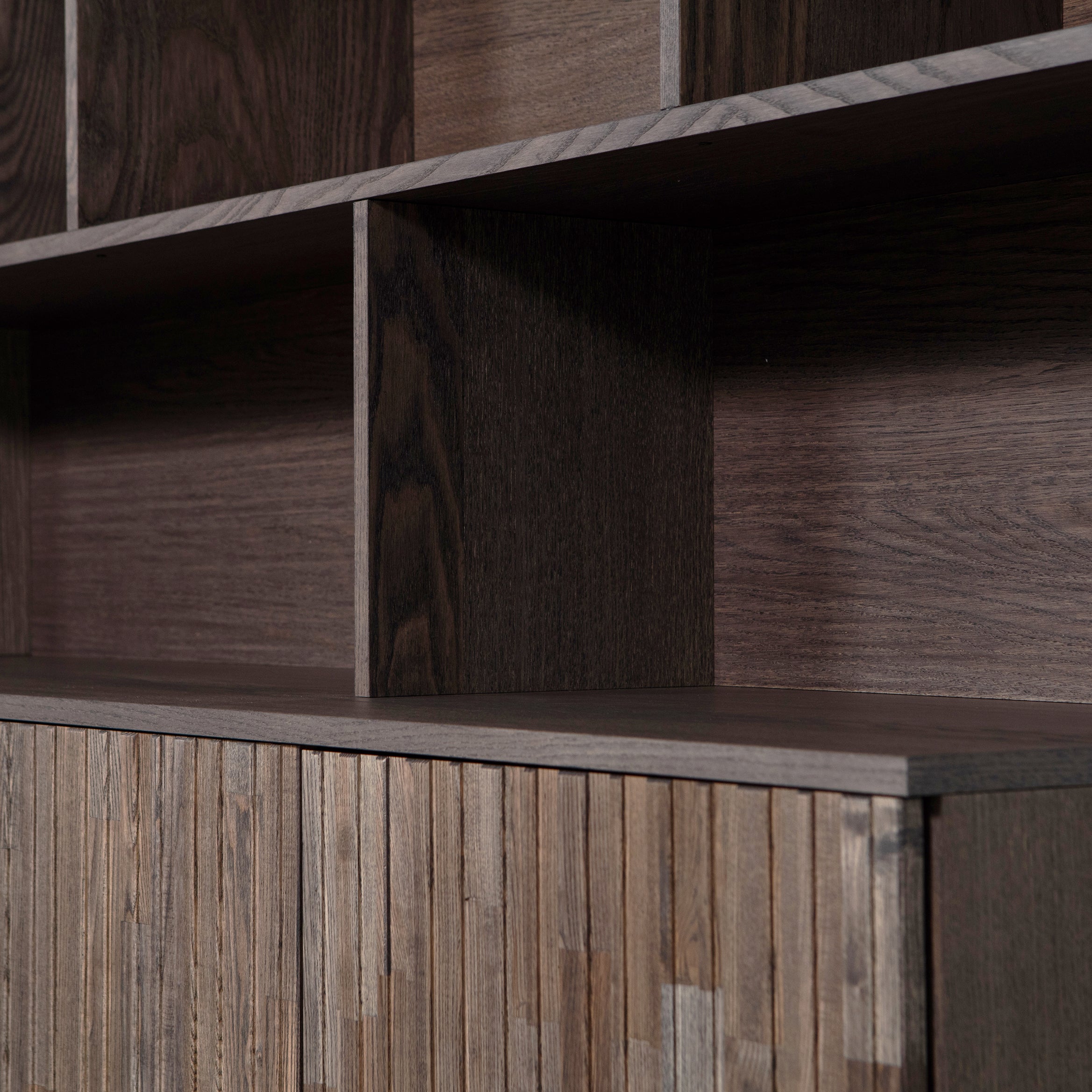 Open show, gesloten rust Deze kast biedt het beste van twee werelden: open vakken om je mooiste woonaccessoires te showen én vier greeploze deuren met een reliëf front, waarachter je alles netjes uit het zicht kunt opbergen. Achter elke deur bevindt zich een uitneembare én in hoogte verstelbare legplank, zodat je de indeling helemaal naar wens kunt aanpassen.
