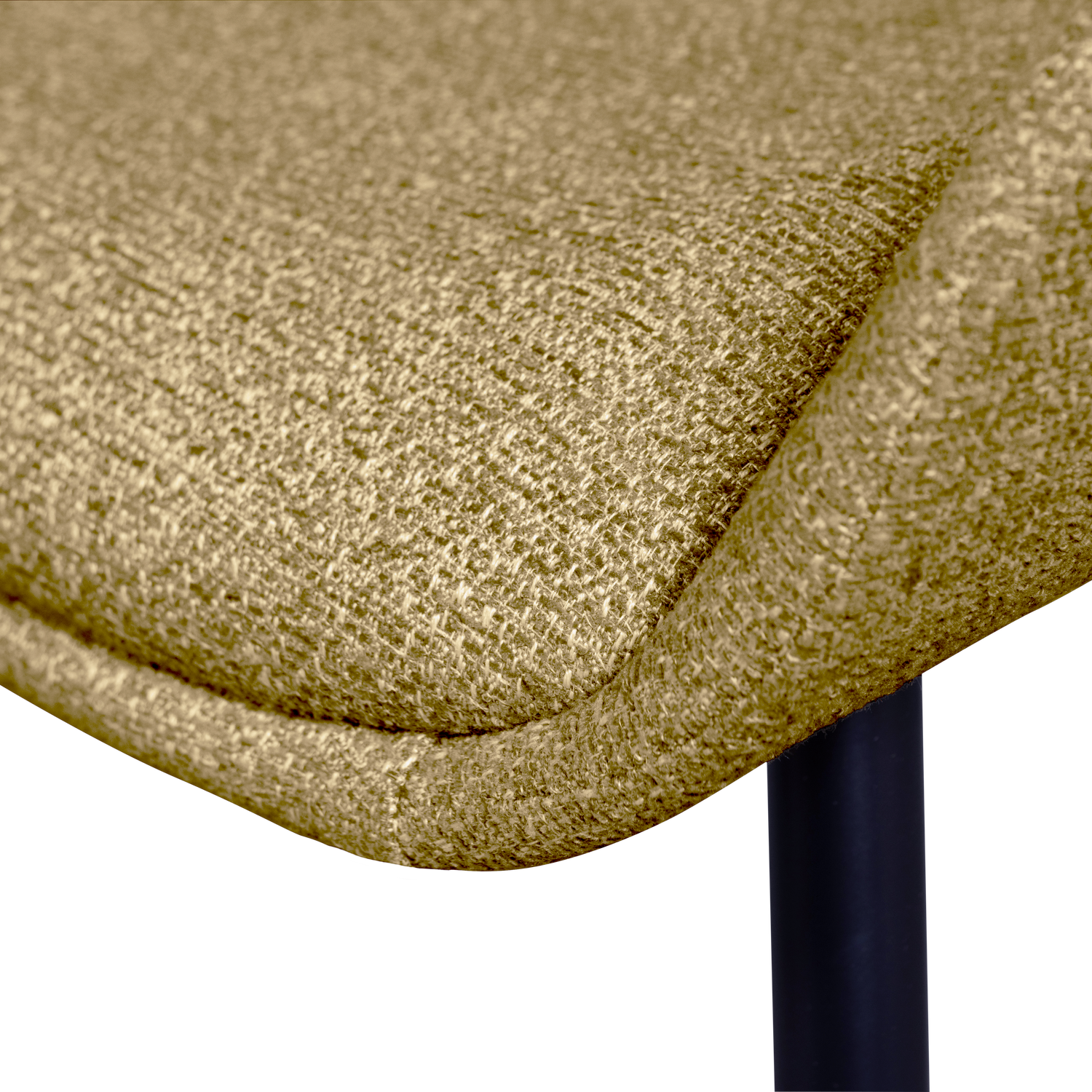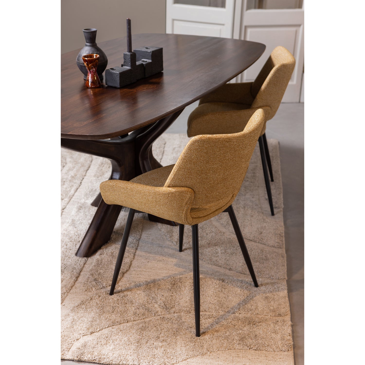 De Parade eetkamerstoel, uit de collectie van het Nederlandse interieurmerk WOOOD, heeft een subtiele kuipvormige zitting bekleed met een warme melangestof. De conische metalen poot geeft de stoel een luchtige uitstraling. Materiaal