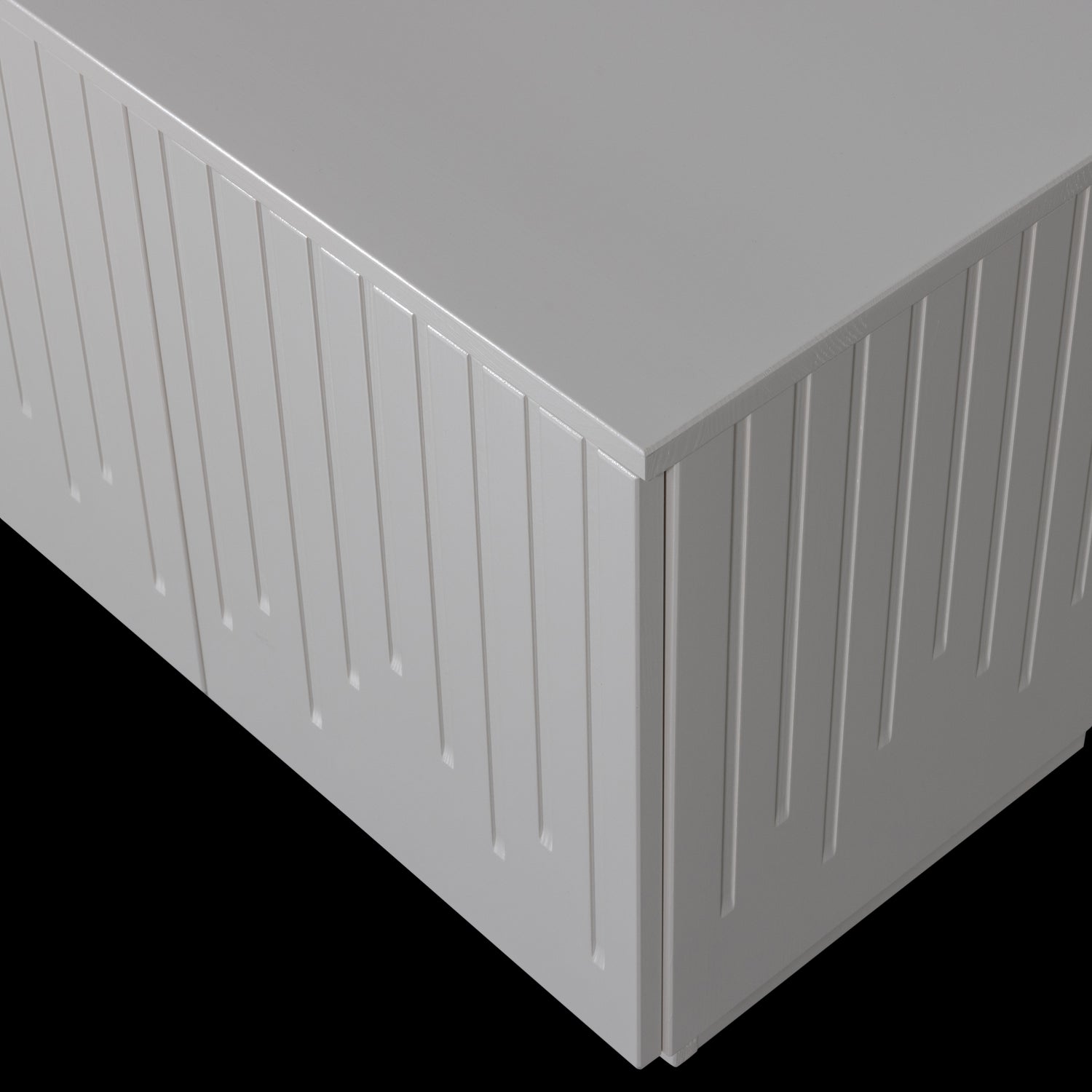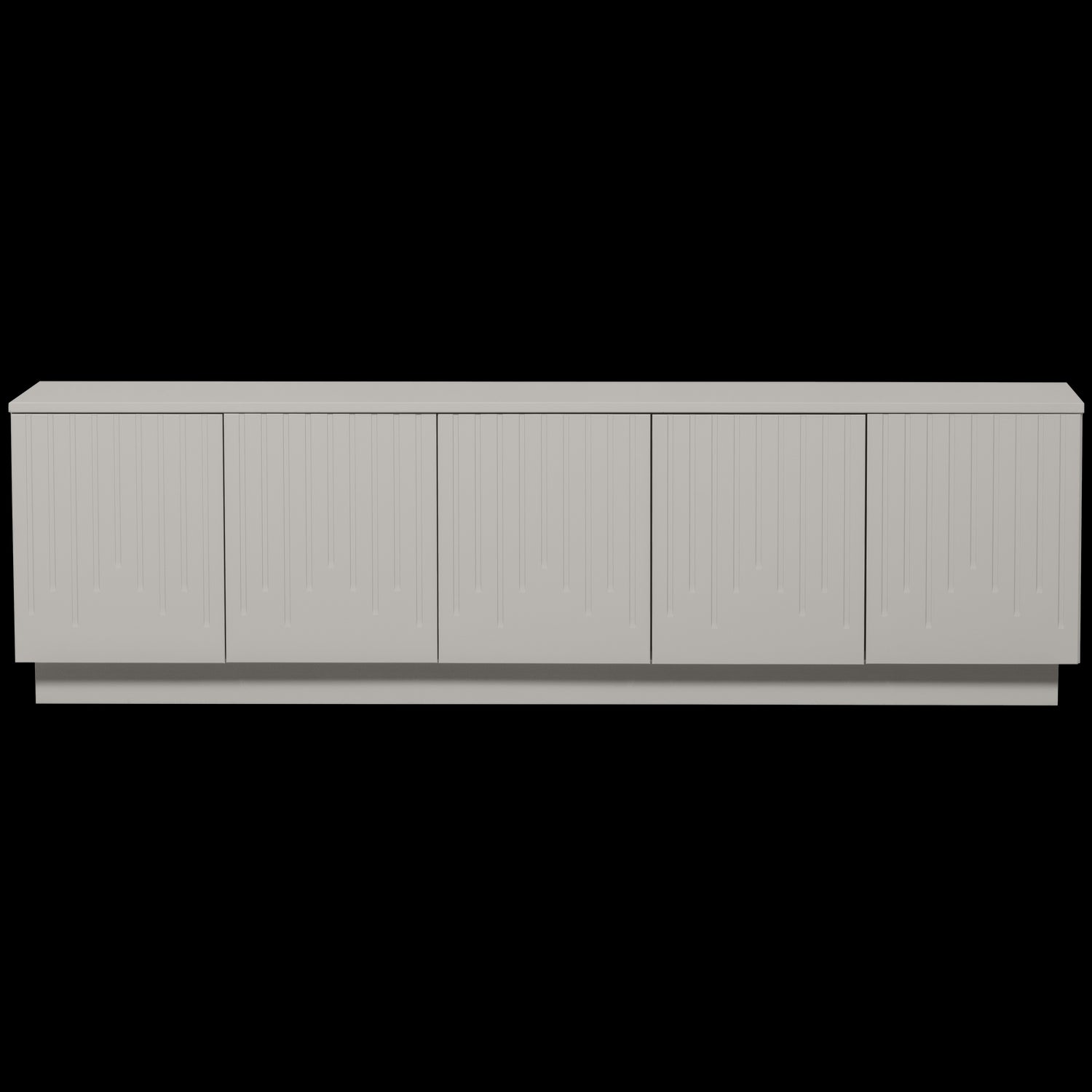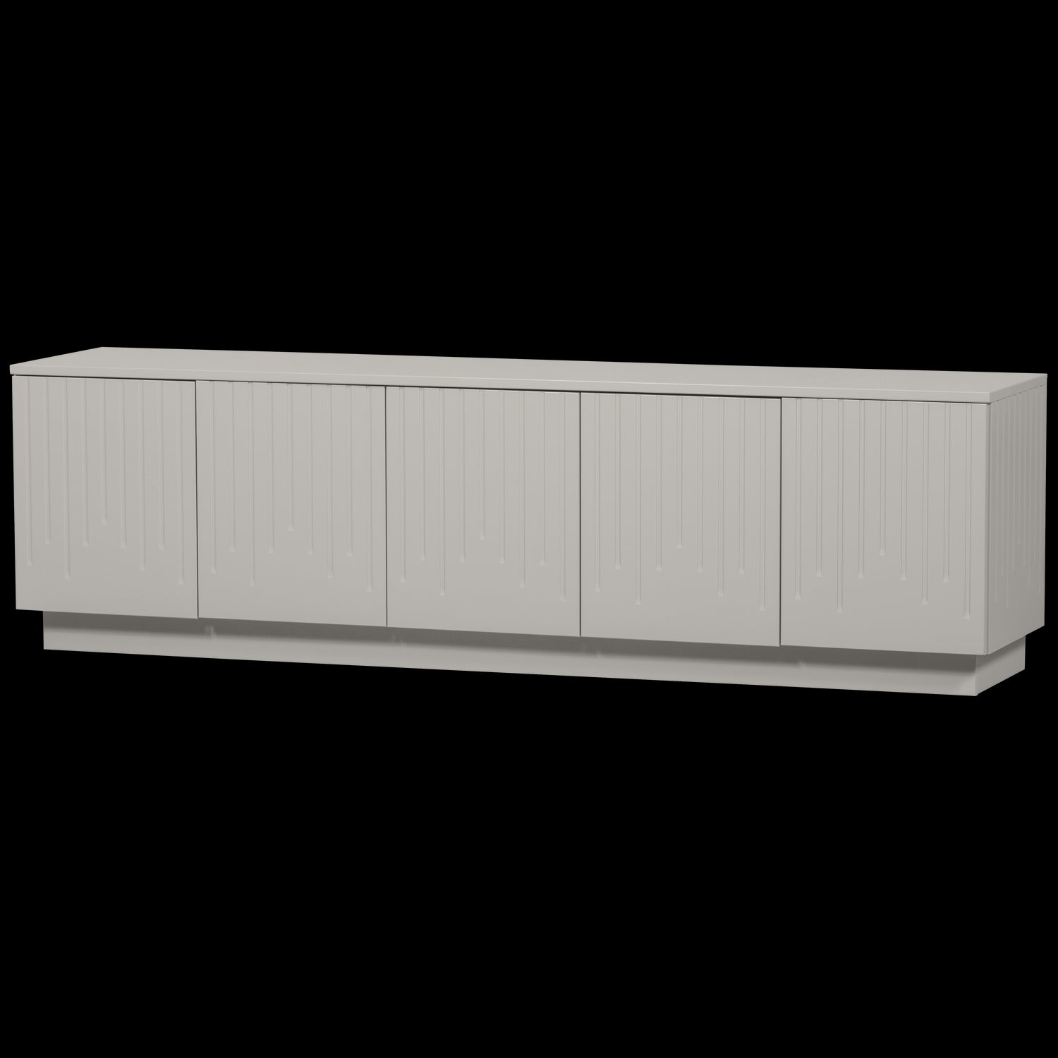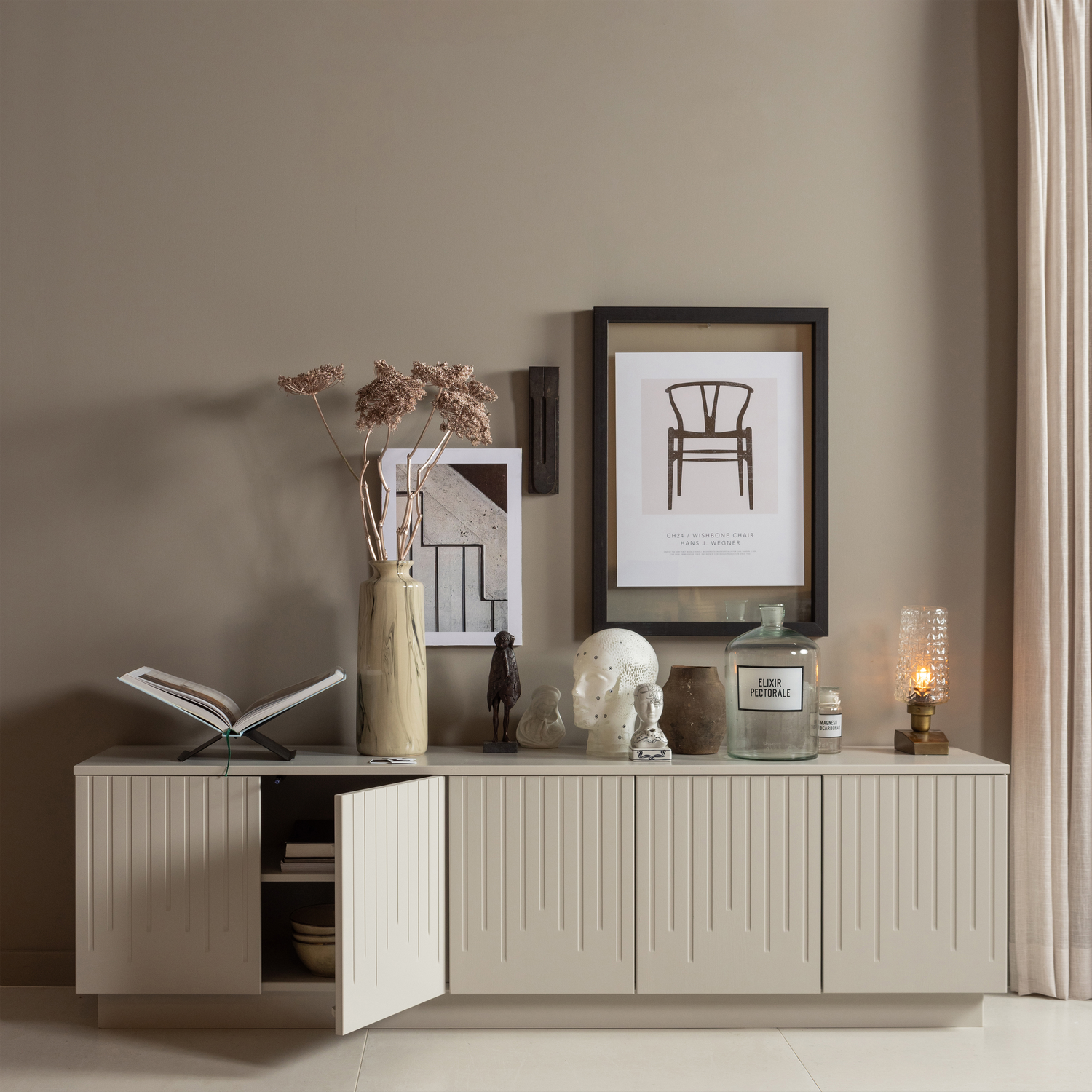 Het regelmatige, rechte patroon van een goed geordende potlodendoos was de inspiratiebron voor het houtsnijwerk op de deuren van dit Pencil tv-meubel uit de collectie van het Nederlandse interieurmerk WOOOD. De trendy kleuring houdt het ontwerp stijlvol en modern.