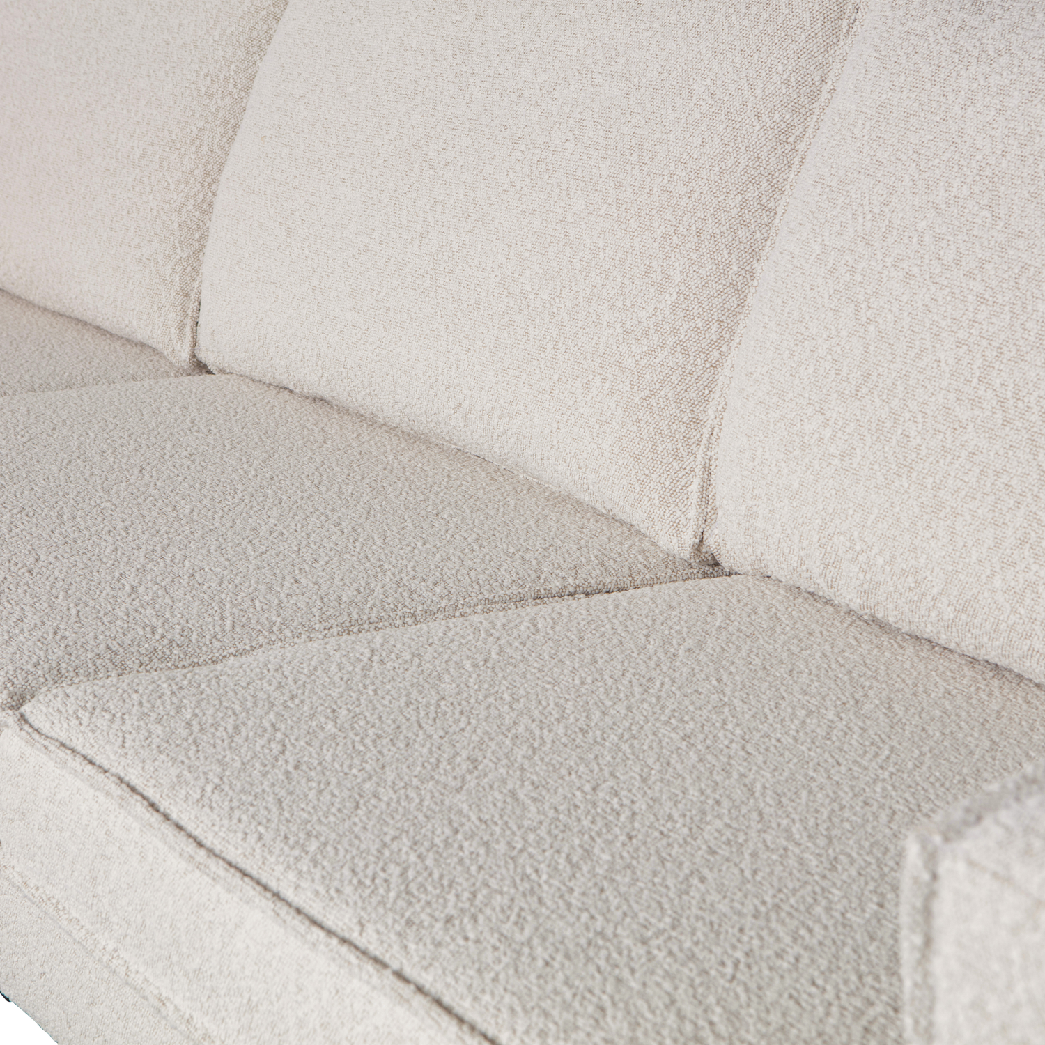 De Rodeo bank is opgebouwd uit een combinatie van massief hout, spaanplaat, polyurethaan schuim met een dichtheid van 25 kg/m3 en een zigzag vering. De zitting bevat een polyurethaan schuim met een dichtheid van 30 kg/m3 (T3037). De rugleuning bestaat uit een combinatie van 70% gesneden schuim en 30% siliconen. Deze Rodeo is bekleed met zachte bouclé. Het materiaal van de Colmar bouclé stof speelt in op de laatste trend: zachte materialen. De stof is zacht en heeft een elegante textuur die meteen warmte in huis brengt. Onze Colmar bouclé stof heeft een Martindale van 100.000, dat betekent dat de stof geschikt is voor intensief gebruik. De dichte weeftechniek zorgt voor de sterkte van de stof, dit maakt dat de bouclé niet snel zal slijten of scheuren. Ook heeft elke kleur een hoge kleurvastheid, maar het is aangeraden om direct zonlicht te vermijden om kleurnuances te voorkomen.