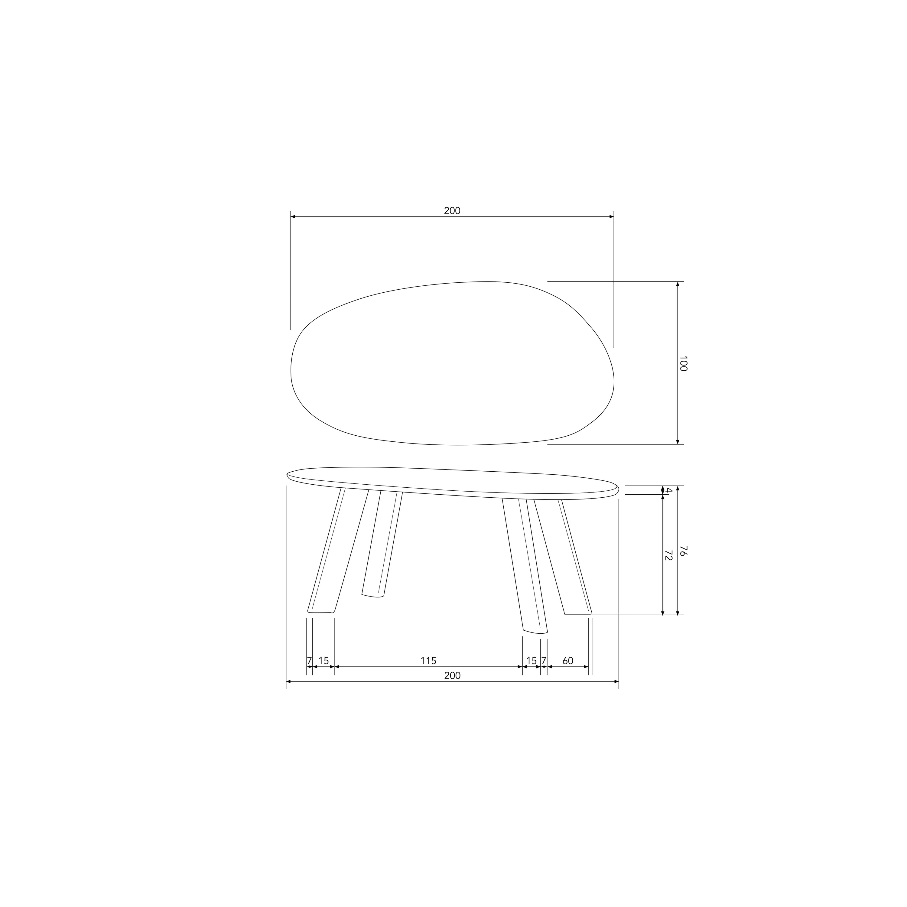 Hoogte: 76 cm- Breedte: 200 cm- Diepte: 100 cm- Bladdikte: 4 cm- Poothoogte: 72 cm- Pootdikte: 15x7 cm- Korte afstand poten: 44/60 cm- Lange afstand poten: 80/115 cm- Gewicht: 93 kg- Draaggewicht: 150 kg