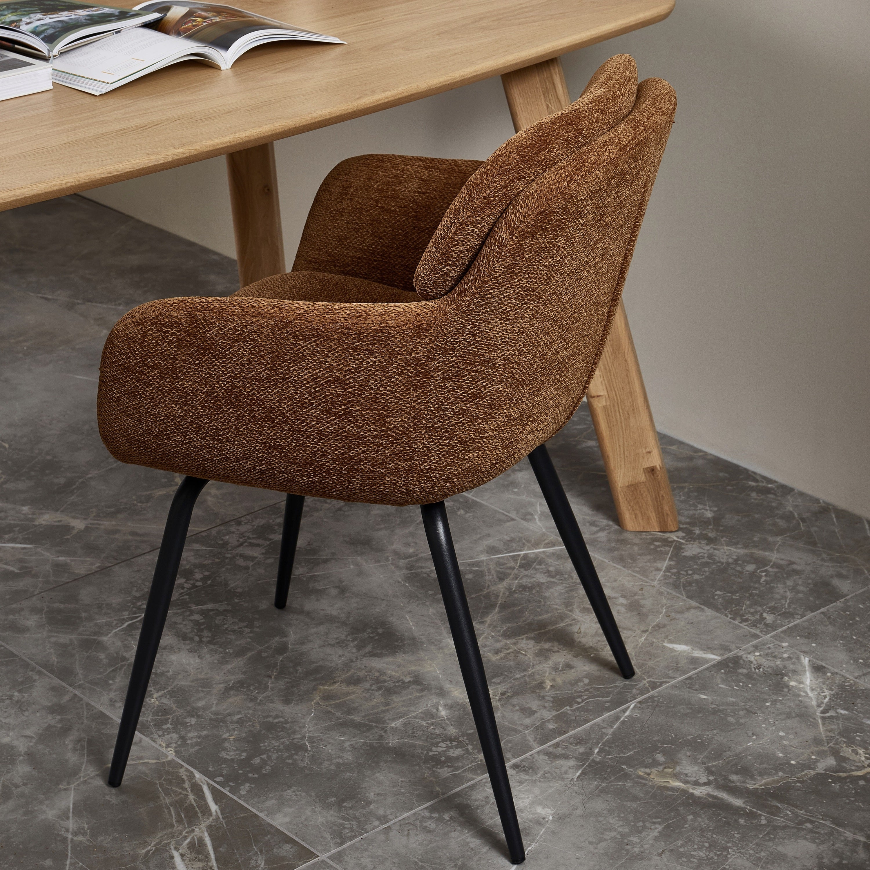 Met de Runa eetkamerstoel van het Nederlandse merk WOOOD haal je een heerlijk comfortabele zitplaats in huis. De stoel is bekleed met chenillestof en heeft een slank zwart metalen onderstel. Het afgeronde design geeft de stoel een vriendelijke en luxueuze uitstraling. De lichtglanzende chenillestof voegt zachtheid toe en maakt van Runa de blikvanger in jouw eethoek.