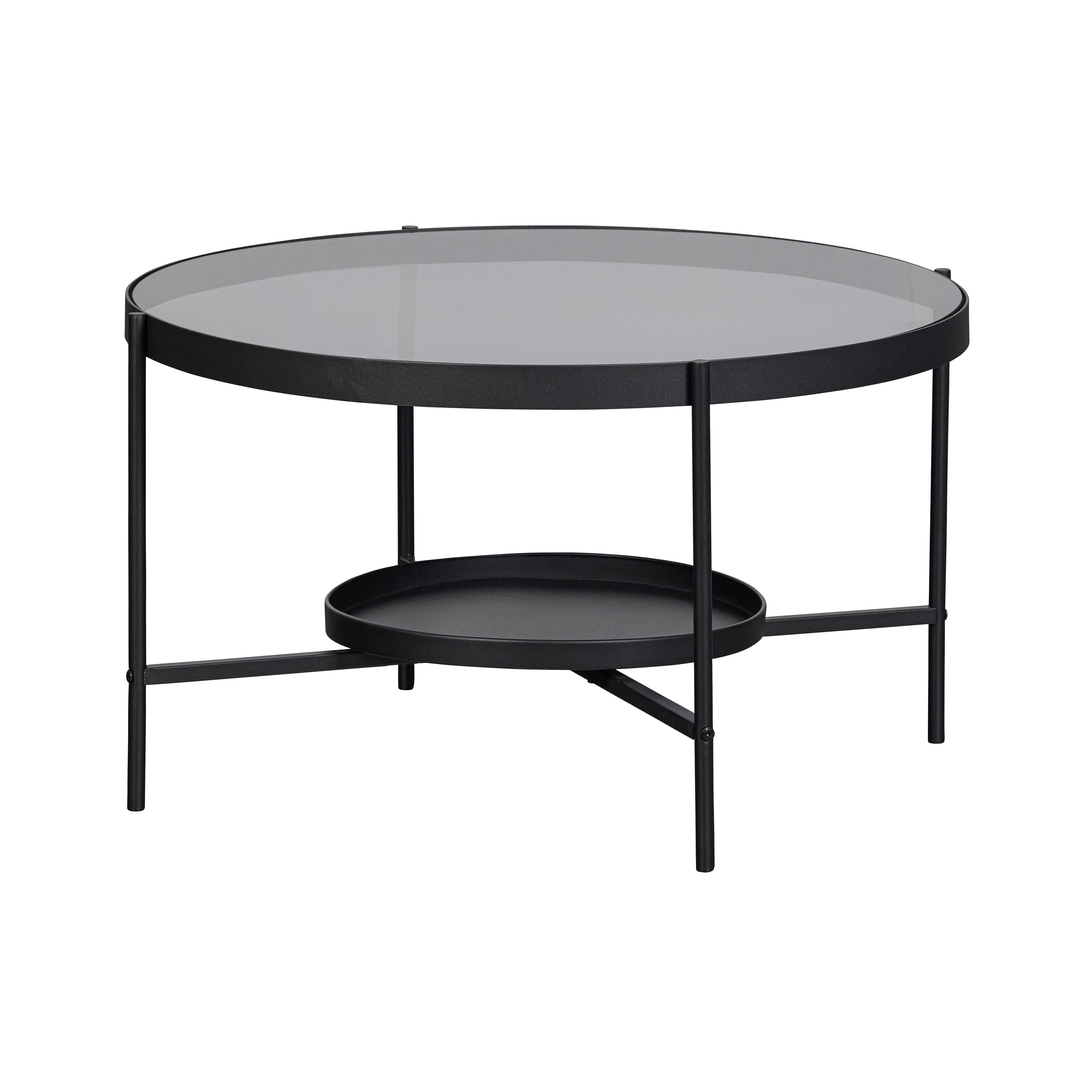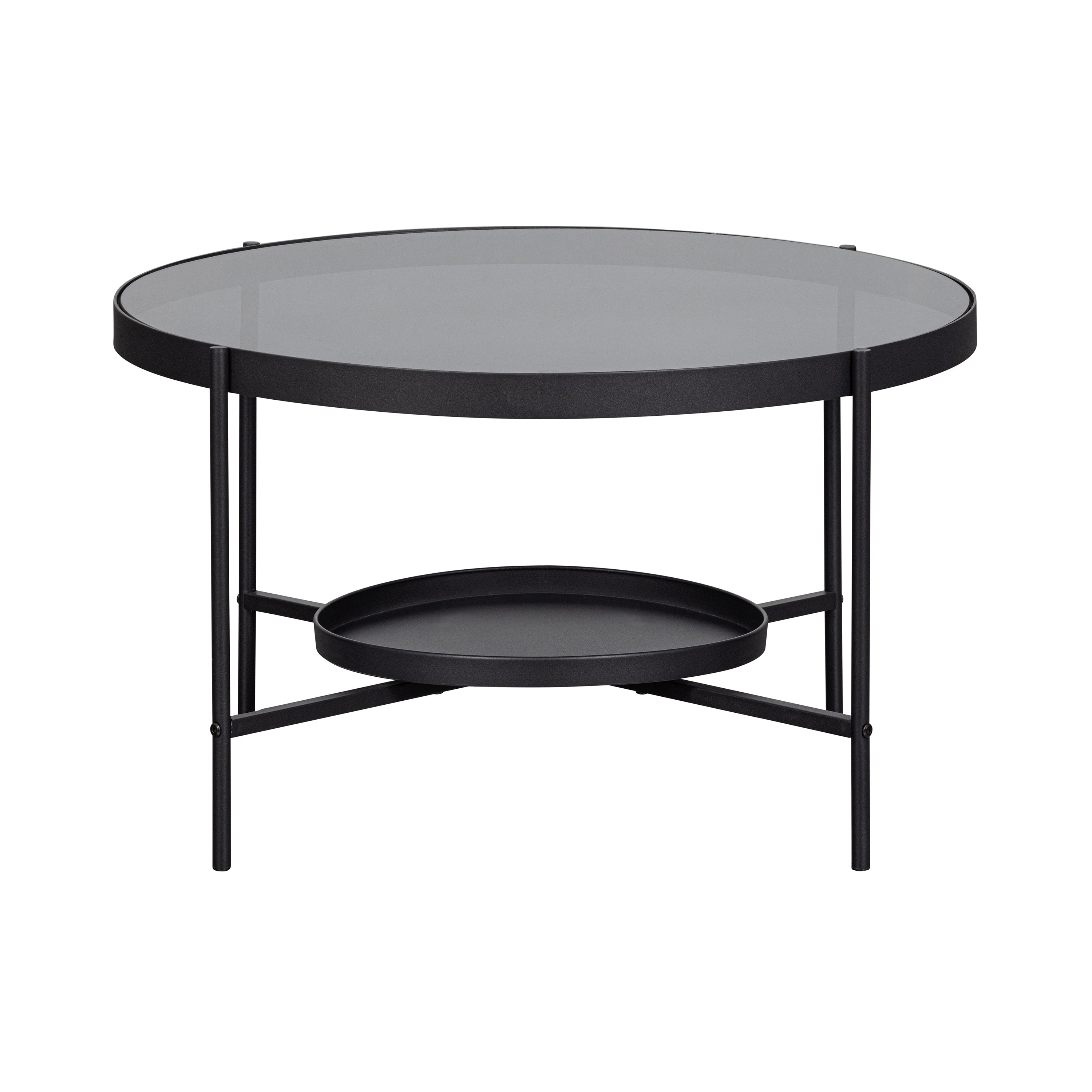 Een stoere salontafel die ruimtelijk staat in het interieur, dat is deze Jitske salontafel uit de collectie van het Nederlandse merk WOOOD. De salontafel is vervaardigd uit metaal met een zwarte poedercoating. Het bovenste blad is vervaardigd uit gehard glas. Het onderste tafelblad is van zwart metaal. Het glazen tafelblad van Jitske heeft een diameter van 80 cm met een dikte van 0.5 cm. Het metalen blad onder het glazen tafelblad heeft een diameter van 40 cm en bevindt zich 14 cm boven de grond. Artikelkenmerken