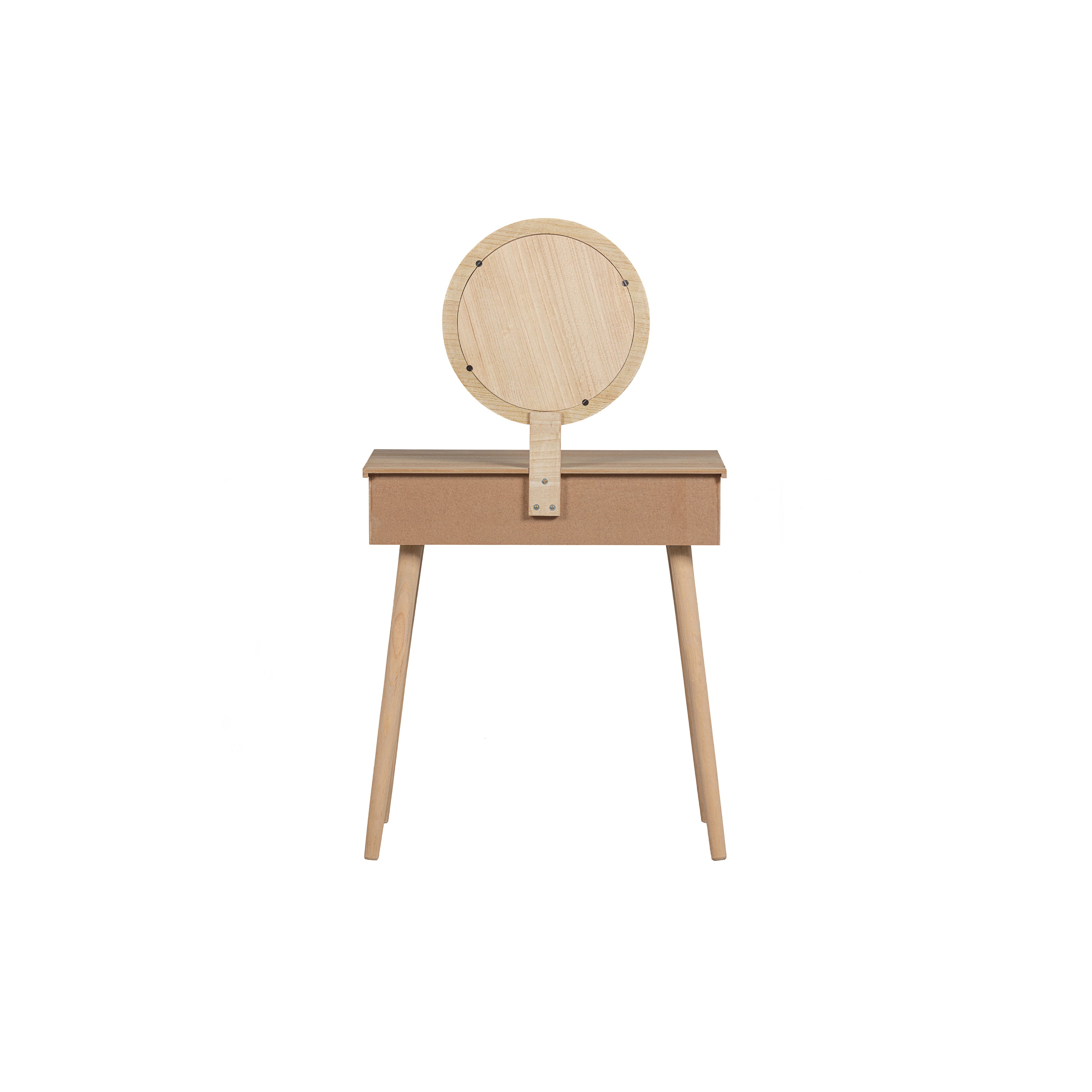 Het Soof tafeltje is multifunctioneel vanwege de praktische eenvoud. Het tafeltje uit de collectie van het Nederlandse interieurmerk WOOOD heeft een praktische spiegel in een stijlvolle, minimalistische cirkel. Het glad afgewerkte grenenhout in de lichte kleur geeft een Scandinavische sfeer en de twee lades bieden praktische opbergruimte voor kleine snuisterijen.