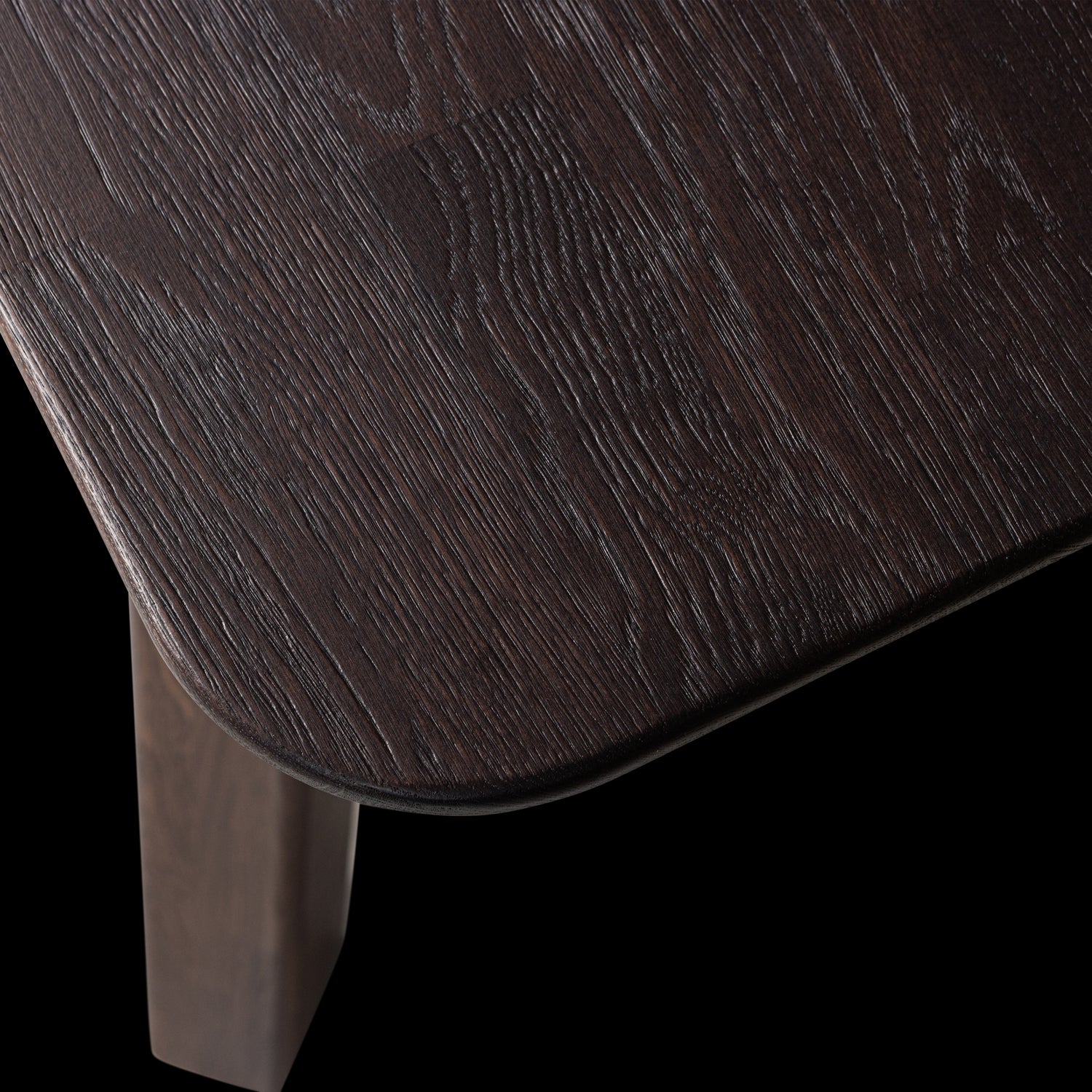 De tafel is gemaakt van stroken verlijmd eikenhout met een vingerlasverbinding, wat een speels motief creëert. Eikenhout wordt gekenmerkt door de duidelijk zichtbare nerftekening. De natuurlijke imperfecties van het eikenhout maken elke tafel uniek. De tafelbladen zijn licht geborsteld waardoor de nerftekeningen worden geaccentueerd en de beits- en lakkleuren nog mooier tot uiting komen. De eikenhouten meubelen uit onze collecties zijn afkomstig van FSC-gecertificeerde leveranciers en worden op diverse manieren behandeld.