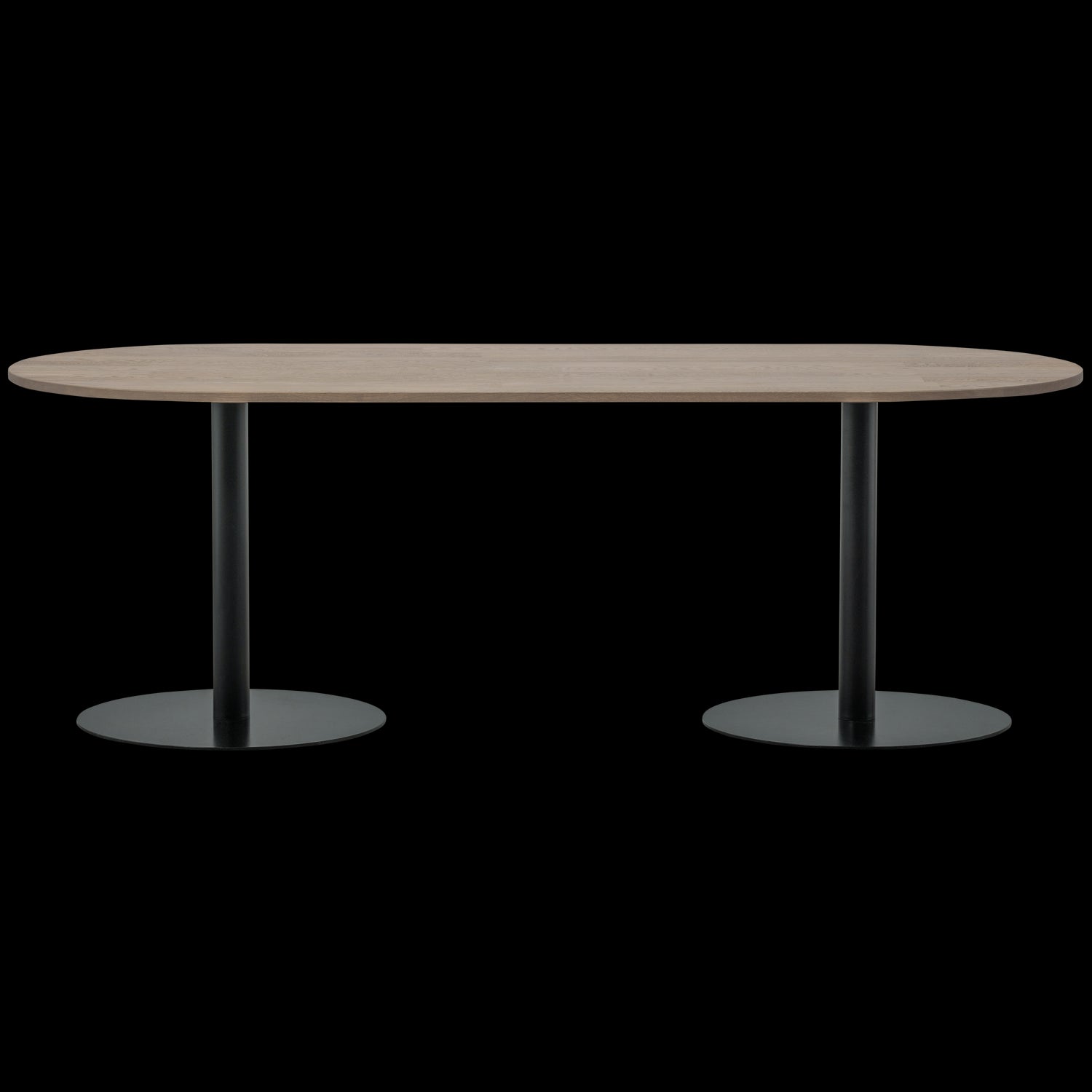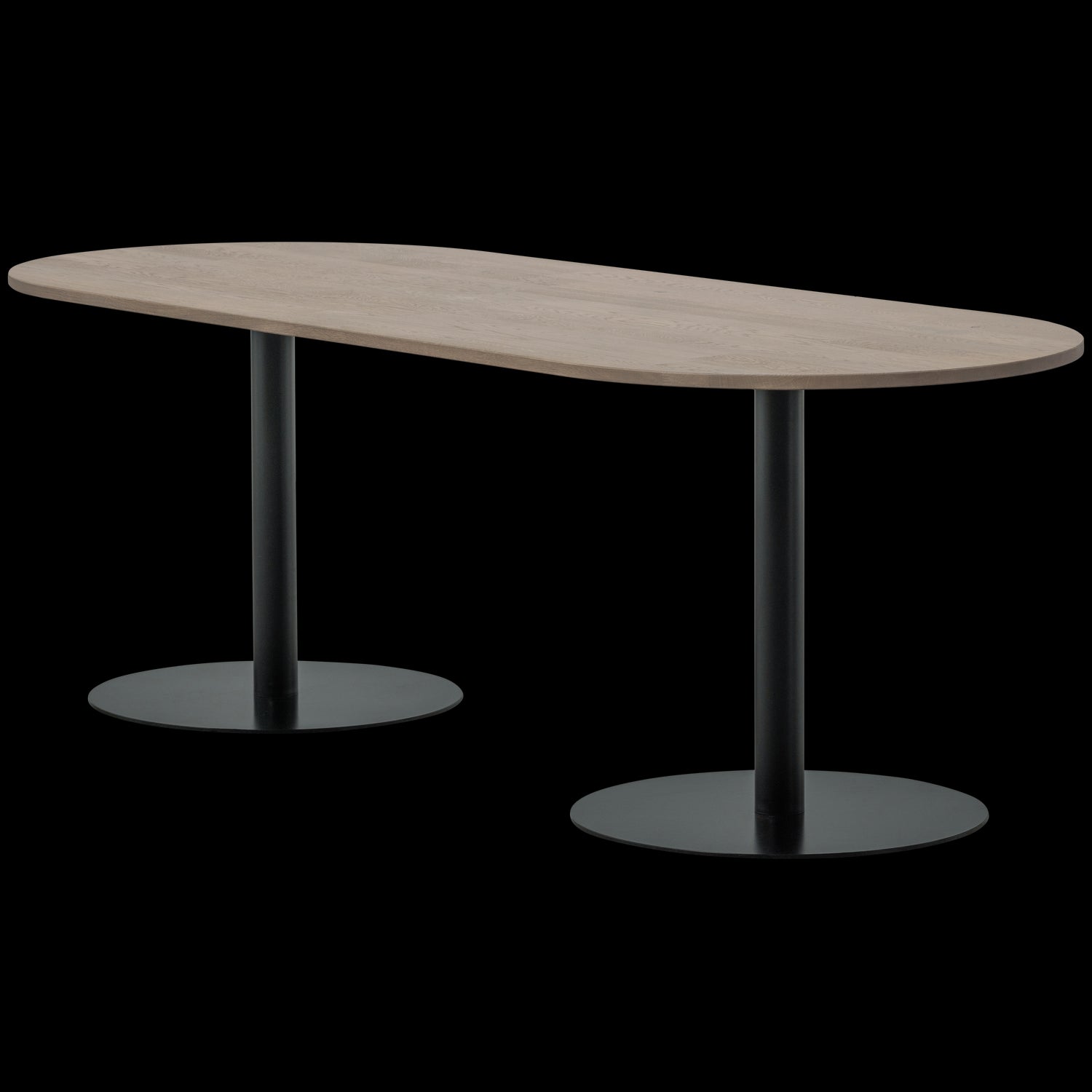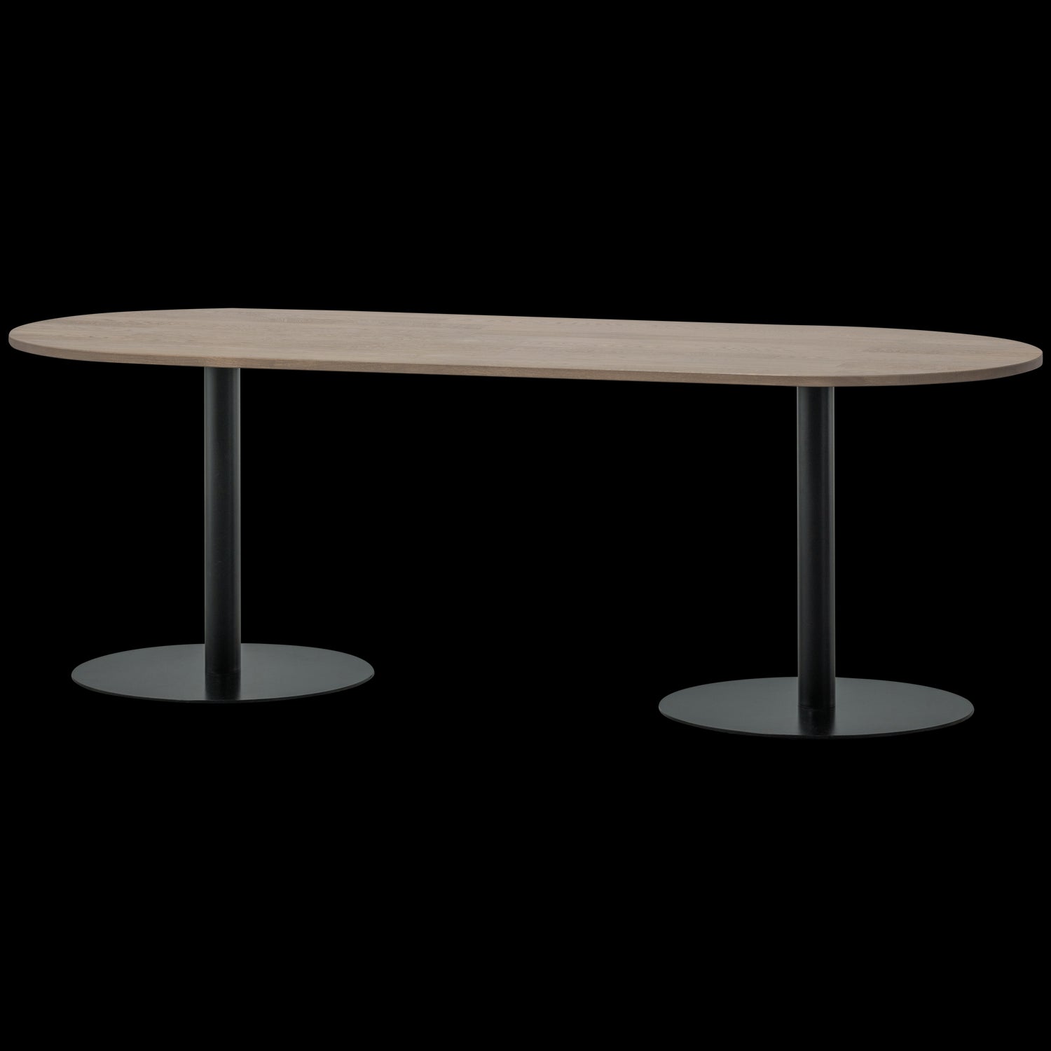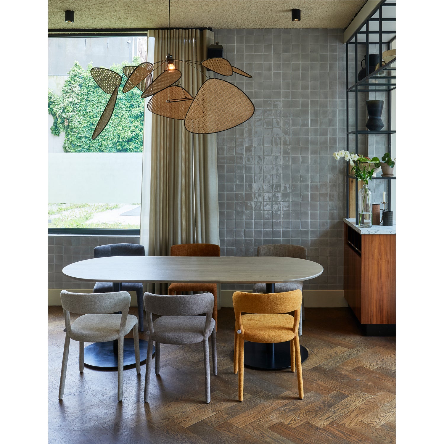 Creëer jouw ideale eethoek met de veelzijdige Tablo serie van het Nederlandse interieurmerk WOOOD. Met talloze combinatiemogelijkheden en verschillende afmetingen stel je moeiteloos de eethoek samen die perfect aansluit bij jouw wensen. Kies bijvoorbeeld voor deze stijlvolle ovale eettafel met een elegante, strakke uitstraling. Het tafelblad heeft een subtiele, ronde kantafwerking, wat zorgt voor een verfijnde en elegante uitstraling. Het tafelblad is behandeld met een water gedragen, grijze beits, waardoor het hout een prachtige kleur krijgt. Samen met de ronde metalen poot, vormt het de perfecte combinatie!