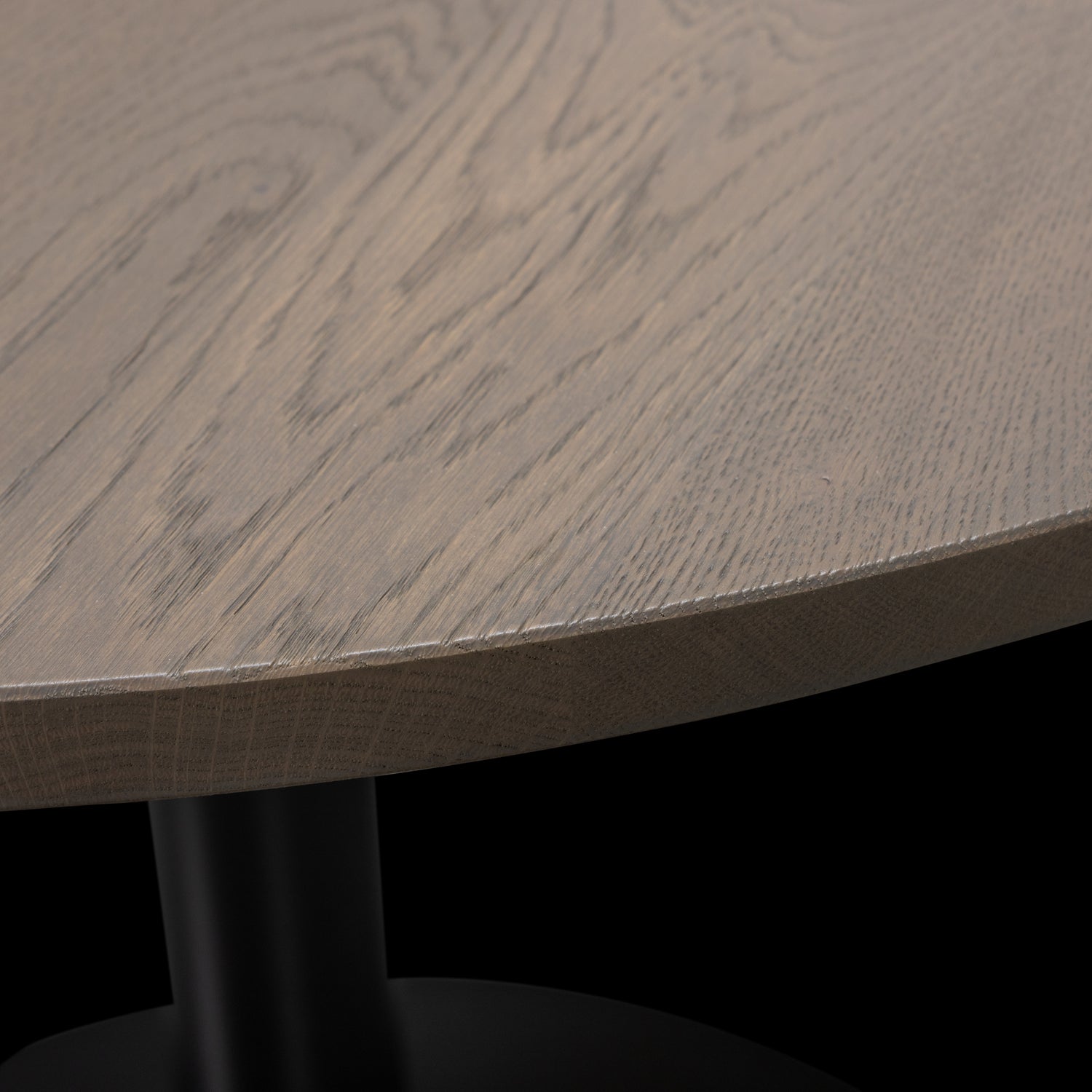 Het tafelblad is gemaakt van stroken verlijmd eikenhout met een vingerlasverbinding wat een speels motief creëert. Eikenhout wordt gekenmerkt door de duidelijk zichtbare nerftekening. De natuurlijke imperfecties van het eikenhout maken elke tafel uniek. De tafelbladen zijn licht geschuurd waardoor de nerftekeningen worden geaccentueerd en de beits- en lak kleuren nog mooier tot uiting komen. De eikenhouten meubelen uit onze collecties zijn afkomstig van FSC-gecertificeerde leveranciers en worden op diverse manieren behandeld. De ronde poot is gemaakt van metaal, afgewerkt met een zwarte poedercoating.
