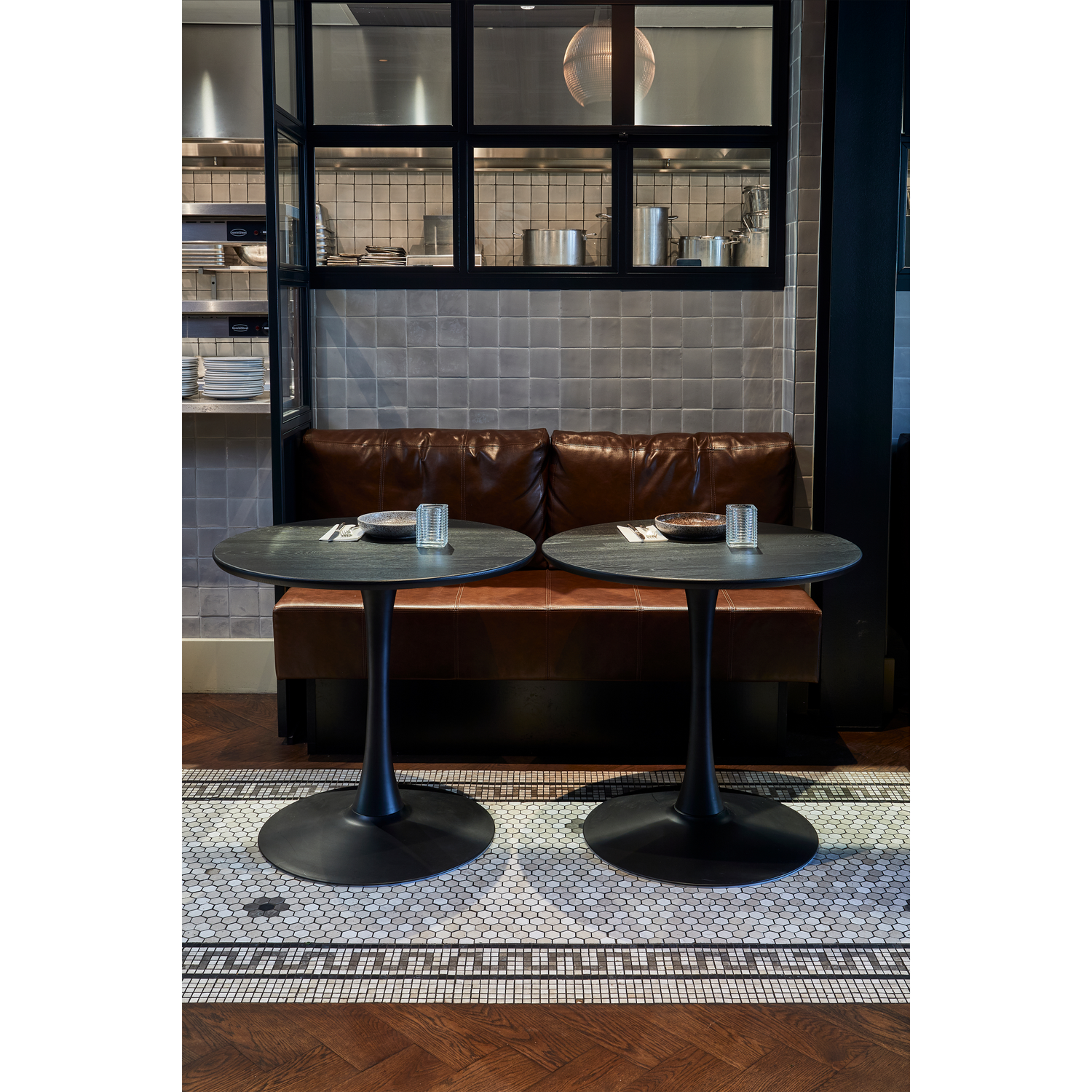 Creëer jouw ideale eethoek met de veelzijdige Tablo-serie van het Nederlandse interieurmerk WOOOD. Met talloze combinatiemogelijkheden en verschillende afmetingen stel je moeiteloos de eethoek samen die perfect aansluit bij jouw wensen. Kies bijvoorbeeld voor deze stijlvolle, ronde eettafel met een speelse vingerlasverbinding! Het tafelblad is behandeld met een watergedragen, donkere lak, waardoor het hout een mooie zwarte kleur krijgt. Het blad wordt geleverd in combinatie met de Bistro trompetvoet, die gemaakt is van metaal en is voorzien van een zwarte poedercoating. De perfecte eettafel om gezellig te dineren met het gezin!