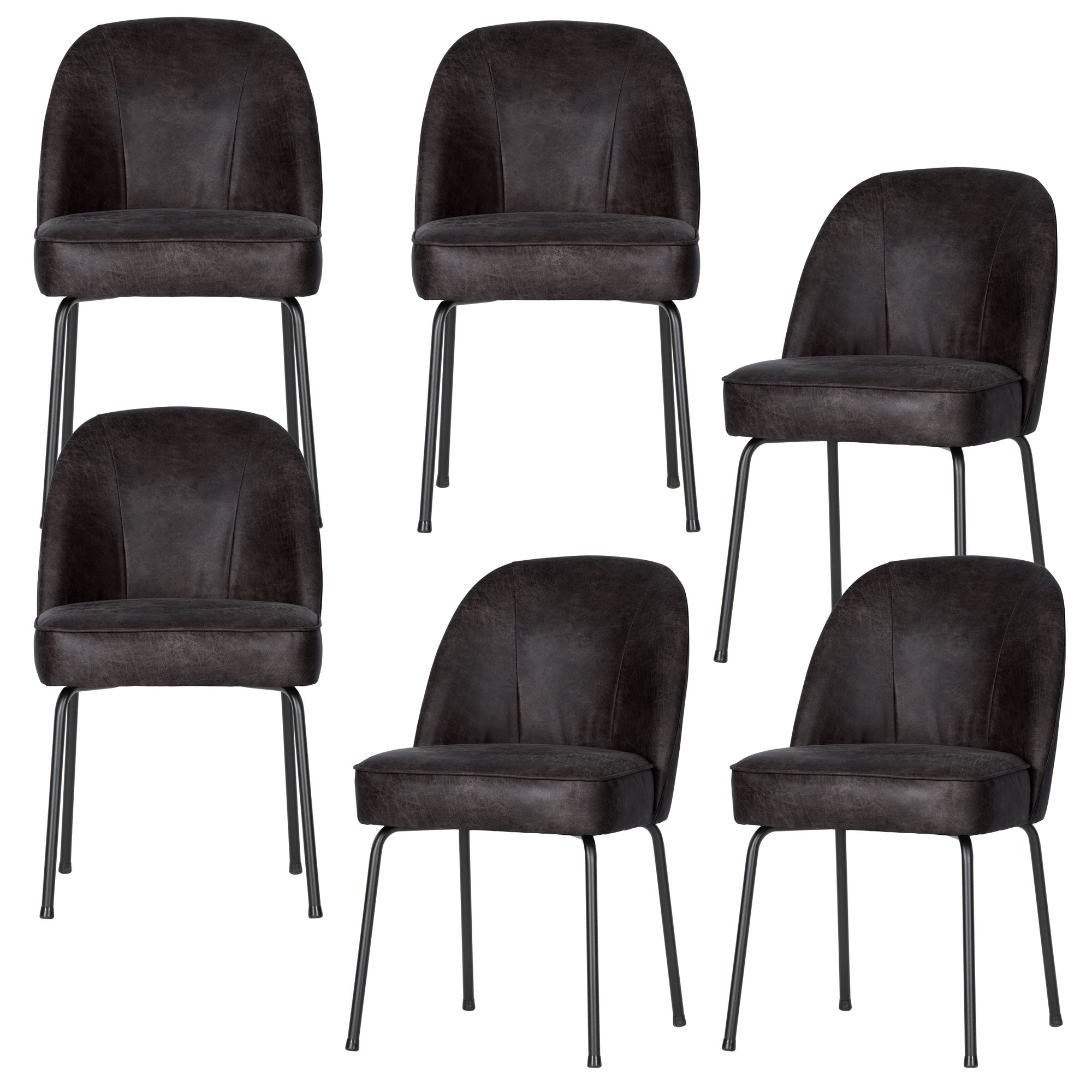 Het onderstel van de Vogue eetkamerstoel is gemaakt van metaal met een matzwarte poedercoating. Het frame van de zitting is opgebouwd uit een combinatie van spaanplaat en multiplex. De zitting bevat elastische riemen en een T3542 foam wat zorgt voor een iets stevig zitcomfort wat urenlang een comfortabele zitplaats verzorgt. De rugleuning is gevuld met een T2120 foam. Onze Copa lederlook heeft een unieke uitstraling en is door het gebruik van leer restanten een duurzame keuze! De lederlook bestaat uit 70% vezels van rundleder, 30% polyester en heeft een Martindale van 30.000. Het materiaal is opgebouwd uit twee onderdelen: de onderlaag bestaat uit gerecyclede leervezels, wat zorgt voor de natuurlijke uitstraling. De bovenste laag is een polyester afdeklaag die het leer beschermt en oneffenheden voorkomt. Hierdoor wordt het een stevige combinatiestof. De microvezel is gebreid van zeer kleine, synthetische vezels. Deze productietechniek zorgt voor de stevigheid en een fijn, zacht gevoel. De stof is zeer kleurvast. Tijdens het gebruik zal het uiterlijk en de structuur van de stof zijn natuurlijke kenmerken meer laten zien, dit verandert niks aan de duurzaamheid en kwaliteit.