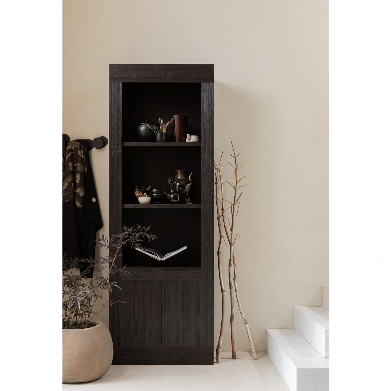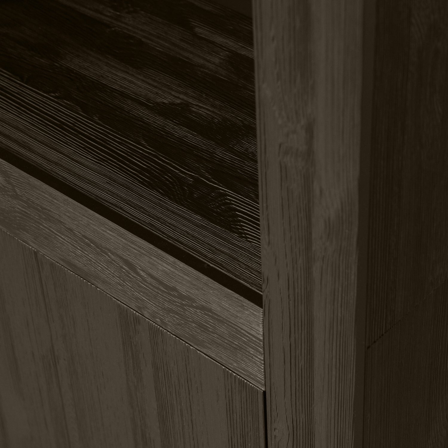 Het item is vervaardigd uit diep geborsteld grenenhout. De grenenhouten meubelen uit onze collecties zijn afkomstig van FSC-gecertificeerde leveranciers en worden op diverse manieren behandeld. Zo is geschuurd grenen zeer glad en netjes en staat geborsteld grenen juist bekend om zijn karakteristieke nerftekeningen en doorleefde uitstraling. Voor een nog robuustere look wordt het grenenhout band gezaagd. Grenenhout wordt gekenmerkt door een lichtgele kleur en zichtbare vlamtekeningen. De zwarte legplanken buiten het zicht zijn gemaakt van spaanplaat en de zwarte achterwand is gevormd uit HDF.