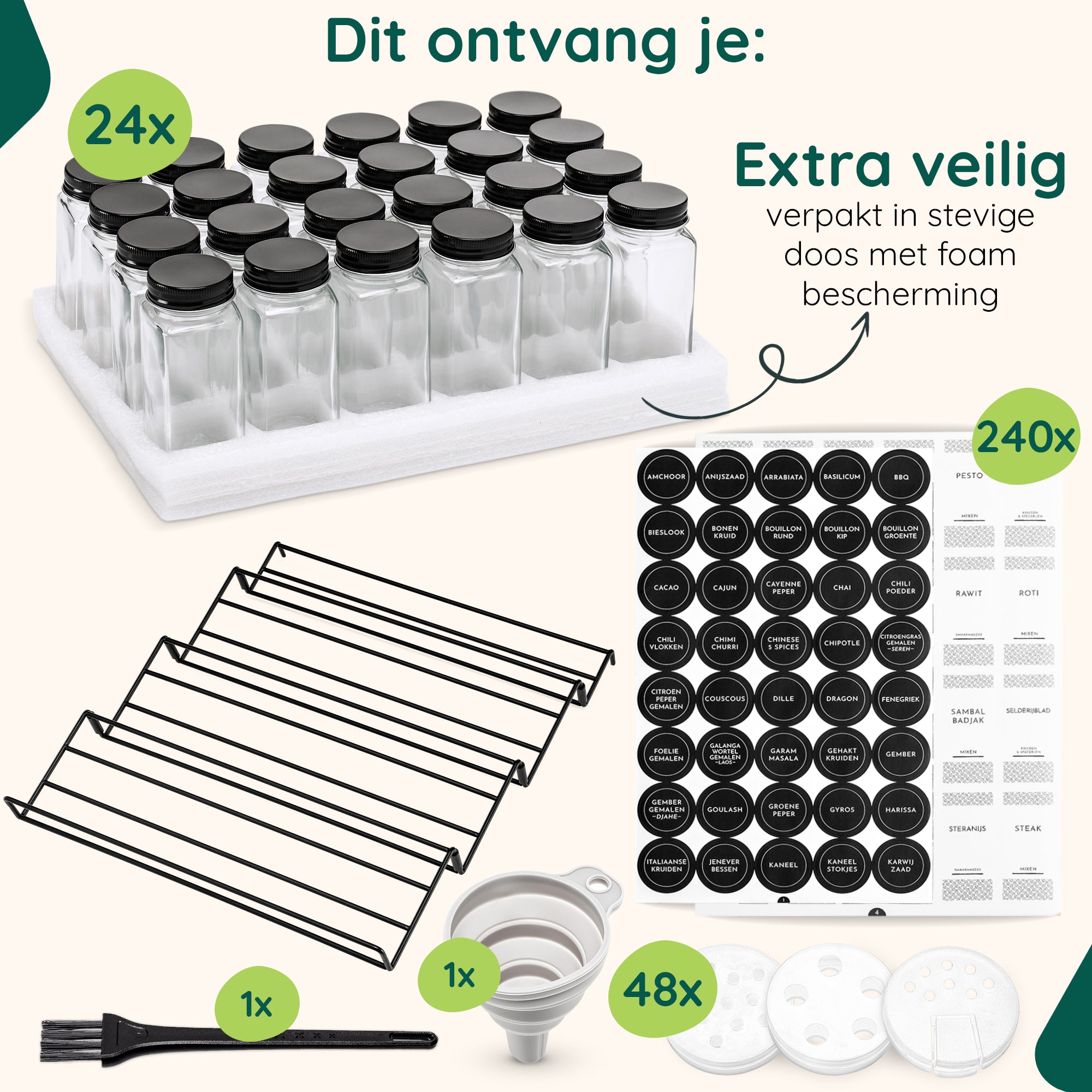 ► Kruidenrek van metaal; ► 240x kruidenlabels; ► 48x kruidenstrooiers; ► 24x Glazen potjes met zwarte deksel ► Schoonmaakborstel ► Siliconen trechter